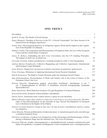 Studia z zakresu prawa pracy i polityki społecznej 2015 ISSN 1429-9585 SPIS TREŚCI Od redakcji . . . . . . . . . . . . . . . . . . . . . . . . . . . . . . . . . . . . . . . . . . . . . . 7 Keith D. Ewing, The Death of Social Europe . . . . . . . . . . . . . . . . . . . . . . . . . . . . . 9 Roger Blanpain, Freedom of Services in the EU: A Social Catastrophe? Are there lessons to be learned from the Belgian experience? . . . . . . . . . . . . . . . . . . . . . . . . . . . . . 33 Jelena Jonis, The European Directive on Temporary Agency Work and Its Impact on the Legislation of the Republic of Lithuania . . . . . . . . . . . . . . . . . . . . . . . . . . . . . . . 41 Matthew Finkin, The Acquisition and Dissemination of Employee Data: the Law of the European Union and the United States Compared . . . . . . . . . . . . . . . . . . . . . . . . . . . . 57 Janice R. Bellace, Embedding the ILO Core Conventions into the UN Guiding Principles: The Impact of Soft Law on Hard Law . . . . . . . . . . . . . . . . . . . . . . . . . . . . . 81 Gertruda Uścińska, Zakres przedmiotowy swobody przepływu osób w Unii Europejskiej . . . . 91 , Andrzej Marian Świątkowski, Collective Bargaining and Collective Agreements: International and European Legal Standards . . . . . . . . . . . . . . . . . . . . . . . . . . . . . . . . . 101 Łucja Kobroń, Negatywna i pozytywna wolność zrzeszania się partnerów społecznych . . . . . . 163 Frans Pennings, Dilemmas in Applying International Social Security Standards . . . . . . . . . . 177 Henrik Kristensen, The Right to Family Reunion under the European Social Charter . . . . . . . . 187 Inga Klimašauskienė, Reconciliation of Work and Family Life in the Court of Justice of the European Union Case Law . . . . . . . . . . . . . . . . . . . . . . . . . . . . . . . . . . . 203 Konrad Kijewski, Interpretacja pojęcia „przywileju socjalnego” określonego w art. 7 ust. 2 Rozporządzenia nr 492/2011 w kontekście orzeczeń Europejskiego Trybunału Sprawiedliwości . . . . . . . . . . . . . . . . . . . . . . . . . . . . . . . . . . . . . . . . . 219 Beata Martišienė, Brief Historical Analysis of Legal Regulation of Labour Relations . . . . . . . 229 Krzysztof Kosiński, Kontrola wyboru podstaw zatrudnienia . . . . . . . . . . . . . . . . . . . . . 241 Marek Jasion, Autonomia stron a natura umowy o pracę na czas określony . . . . . . . . . . . . . 257 Mónica Martínez López-Sáez (drafted in collaboration with Professor Luis Jimena Quesada), The Principle of Non-Discrimination on the Grounds of Age: Recent Developments in European Law in Relation to the Rights of the Elderly . . . . . . . . . . . . . . . . . . . . . . . . . . 267 Justyna Czerniak-Swędzioł, Uwagi de lege lata i de lege ferenda w przedmiocie umowy o pracę na zastępstwo . . . . . . . . . . . . . . . . . . . . . . . . . . . . . . . . . . . . . . . . . . 293 Anna Musiała, Prawna problematyka świadczenia pracy w ramach przygotowania zawodowego w polskim Kodeksie Pracy . . . . . . . . . . . . . . . . . . . . . . . . . . . . . . . . . . . . 305 Christian von Heyden, A Labour Law Perspective on the Advantages and Disadvantages of Introducing a Minimum Wage into the National Law. The Case of Germany . . . . . . . . . . . . 317 Krzysztof Walczak, Analiza obowiązujących w przedsiębiorstwach systemów premiowych pod kątem ich zgodności z zasadami wynikającymi z teorii zarządzania oraz z wymogami prawa . 335 6 Spis treści Walery Masewicz, Łukasz Kasprowicz, Ochrona pracy jako problem prawno społeczny . . . . . . 373 Karol Kulig, Aksjologiczne podłoże pracowniczego prawa do odpoczynku dobowego . . . . . . . 381 Marta Goroszkiewicz, Andrzej Patulski, Modyfikacja istotnych warunków umowy o pracę oraz zmiany w zakresie obowiązków stron stosunku pracy w świetle wybranych przepisów bezpieczeństwa i higieny pracy . . . . . . . . . . . . . . . . . . . . . . . . . . . . . . . . . . . 395 Agata Ludera-Ruszel, Naruszenie przez pracodawcę obowiązku ułatwiania podnoszenia kwalifikacji zawodowych przez pracownika jako przestępstwo przeciwko prawom pracowniczym? . 409 Agnieszka Posłuszny, Zmiana treści umownego stosunku pracy pracownika samorządowego . . . 423 Gintarė Tamašauskaitė-Janickė, Employees’ Monitoring in the Workplace: The Lithuanian Law Aspects . . . . . . . . . . . . . . . . . . . . . . . . . . . . . . . . . . . . . . . . . . . . . . 447 Tomasz Toutsolt, Państwowa Inspekcja Pracy jako gwarant konstytucyjnej zasady ochrony pracy . 465 Agnieszka Górnicz-Mulcahy, Tadeusz Kuczyński, Nawiązanie zatrudnienia z osobami pełniącymi funkcję centralnych organów administracji rządowej nadzorowanych przez Prezesa Rady Ministrów . . . . . . . . . . . . . . . . . . . . . . . . . . . . . . . . . . . . . . . . . . . . 479 Szymon Sternal, Konstytucyjna aksjologia zasady dialogu społecznego . . . . . . . . . . . . . . . 493 Kinga Pawlak, W stronę poprawy funkcjonowania dialogu społecznego — jako podstawowej zasady zbiorowego prawa pracy . . . . . . . . . . . . . . . . . . . . . . . . . . . . . . . . . 521 Andrzej Marian Świątkowski, Collective Agreements in Poland . . . . . . . . . . . . . . . . . . . 541 Daiva Petrylaitė, Aušra Bagdonaitė, The Trade Unions as Participants of the Collective Labour Relations: the Problems of Legal Status . . . . . . . . . . . . . . . . . . . . . . . . . . . . . 583 Łucja Kobroń, Wolność zrzeszania się a prawo do wolności zrzeszania się partnerów społecznych w Konstytucji RP . . . . . . . . . . . . . . . . . . . . . . . . . . . . . . . . . . . . . 597 Sebastian Koczur, Ochrona gospodarczych interesów pracodawcy jako granica realizacji wolności związkowych . . . . . . . . . . . . . . . . . . . . . . . . . . . . . . . . . . . . . . . . . 613 Aneta Kowalczyk, Organizacja pracodawców i jej reprezentatywność — wybrane problemy . . . . 627 Janusz Żołyński, Charakter norm zbiorowego prawa pracy na przykładzie ustawy o rozwi
