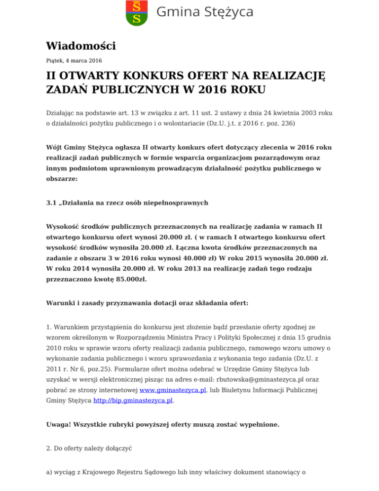 Wiadomości Piątek, 4 marca 2016 II OTWARTY KONKURS OFERT NA REALIZACJĘ ZADAŃ PUBLICZNYCH W 2016 ROKU Działając na podstawie art. 13 w związku z art. 11 ust. 2 ustawy z dnia 24 kwietnia 2003 roku o działalności pożytku publicznego i o wolontariacie (Dz.U. j.t. z 2016 r. poz. 236) Wójt Gminy Stężyca ogłasza II otwarty konkurs ofert dotyczący zlecenia w 2016 roku realizacji zadań publicznych w formie wsparcia organizacjom pozarządowym oraz innym podmiotom uprawnionym prowadzącym działalność pożytku publicznego w obszarze: 3.1 „Działania na rzecz osób niepełnosprawnych Wysokość środków publicznych przeznaczonych na realizację zadania w ramach II otwartego konkursu ofert wynosi 20.000 zł. ( w ramach I otwartego konkursu ofert wysokość środków wynosiła 20.000 zł. Łączna kwota środków przeznaczonych na zadanie z obszaru 3 w 2016 roku wynosi 40.000 zł) W roku 2015 wynosiła 20.000 zł. W roku 2014 wynosiła 20.000 zł. W roku 2013 na realizację zadań tego rodzaju przeznaczono kwotę 85.000zł. Warunki i zasady przyznawania dotacji oraz składania ofert: 1. Warunkiem przystąpienia do konkursu jest złożenie bądź przesłanie oferty zgodnej ze wzorem określonym w Rozporządzeniu Ministra Pracy i Polityki Społecznej z dnia 15 grudnia 2010 roku w sprawie wzoru oferty realizacji zadania publicznego, ramowego wzoru umowy o wykonanie zadania publicznego i wzoru sprawozdania z wykonania tego zadania (Dz.U. z 2011 r. Nr 6, poz.25). Formularze ofert można odebrać w Urzędzie Gminy Stężyca lub uzyskać w wersji elektronicznej pisząc na adres e-mail: [email protected] oraz pobrać ze strony internetowej www.gminastezyca.pl. lub Biuletynu Informacji Publicznej Gminy Stężyca http://bip.gminastezyca.pl. Uwaga! Wszystkie rubryki powyższej oferty muszą zostać wypełnione. 2. Do oferty należy dołączyć a) wyciąg z Krajowego Rejestru Sądowego lub inny właściwy dokument stanowiący o podstawie działalności podmiotu (ważny 3 miesiące od daty wystawienia), b) statut podmiotu, c) umowę partnerską lub oświadczenie partnera, jeżeli takowy występuje, d) W przypadku wyboru innego sposobu reprezentacji podmiotów składających ofertę wspólną niż wynikający z Krajowego Rejestru Sądowego lub innego właściwego rejestru dokument potwierdzający upoważnienie do działania w imieniu oferenta(-ów). Załączniki muszą być ważne i aktualne tj. podpisane przez osoby uprawnione. W przypadku załączników składanych w formie kserokopii każda strona załącznika winna być potwierdzona za zgodność z oryginałem przez osoby uprawnione. Jeżeli osoby uprawnione nie posiadają pieczątki, to wówczas każda strona winna być podpisana pełnym imieniem i nazwiskiem z zaznaczeniem pełnionej funkcji. Każda strona opatrzona winna być także datą potwierdzania zgodności z oryginałem. 3. Oferty niekompletne i nieprawidłowo wypełnione, albo złożone po terminie oraz oferty, w których wartość planowanej dotacji z budżetu gminy będzie wynosiła powyżej 90% finansowych kosztów całkowitych realizacji projektu nie będą rozpatrywane. 4. Złożenie oferty nie jest równoznaczne z przyznaniem dotacji. 5. Poszczególnym podmiotom może być przyznana więcej niż jedna dotacja. Wysokość przyznanej dotacji może być niższa, niż wnioskowana w ofercie. W takim przypadku wnioskodawca może przyjąć zmniejszenie kosztorysu zadania lub wycofać swoją ofertę. 6. Dopuszcza się przyznanie więcej niż jednej dotacji na poszczególne zadania w ramach przydzielonych środków. 7. Złożone oferty podlegają rejestracji i sprawdzeniu pod względem formalnym i merytorycznym przez insp. ds. obsługi Rady Gminy i promocji. Następnie podlegają ocenie przez Komisję Konkursową Gminy Stężyca. 8. Ostateczną decyzję o przyznaniu dotacji po zapoznaniu się z opiniami podejmuje Wójt Gminy Stężyca. Informacja o przyznaniu dotacji zostanie podana do publicznej wiadomości. 9. Podstawą do realizacji zadania będzie podpisana przez strony umowa. 10. Dotacja może być przeznaczona wyłącznie na pokrycie kosztów bezpośrednio związanych z realizacją zadania publicznego i niezbędnych do jego realizacji. 11. Dotacja nie będzie udzielana: a) na podejmowanie działalności gospodarczej, b) na cele nie związane z działalnością statutową organizacji, c) na projekty, których faktycznym celem jest zakup działek, zakup budynków i lokali biurowych. Nie wyklucza to projektów przewidujących zakup wyposażenia, jako środek realizacji głównego celu projektu; d) na pokrycie deficytu zrealizowanych wcześniej przedsięwzięć oraz refundacje kosztów, e) organizacjom, które nie wywiązały się lub nie rozliczyły z zawartych z gminą umów, f) na dotowanie przedsięwzięć, które już są dofinansowane z budżetu gminy lub jej funduszy celowych na podstawie przepisów szczególnych, g) na działalność statutową organizacji, m.in. na: - koszty stałe podmiotów, w tym wynagrodzenia osobowe (np. obsługa księgowa, informatyk, obsługa biurowa) oraz utrzymanie i wyposażenie biura (np. opłaty czynszowe, abonamentowe, rachunki telefoniczne, koszty przejazdów, materiały biurowe, opłaty pocztowe oraz komputery, telefony, kserokopiarki, faksy itp.), - wynagrodzenia osobowe etatowych pracowników i członków organów zarządzających podmiotu składającego ofertę ponoszone przy realizacji zadania, - koszty ZUS powstałych po stronie płatnika w związku z zatrudnieniem na umowę zlecenie etatowego pracownika podmiotu - podatki, cła, opłaty skarbowe, - opłaty leasingowe oraz zobowiązania z tytułu otrzymanych kredytów, - nabycie lub dzierżawę gruntów, - prace remontowe i budowlane, - koszty ryczałtu samochodu prywatnego wykorzystywanego do realizacji projektu, - delegacji służbowych związanych z realizacją projektu, - działalność gospodarczą, polityczną i religijną, - wydatki poniesione na przygotowanie wniosku i rozlicze
