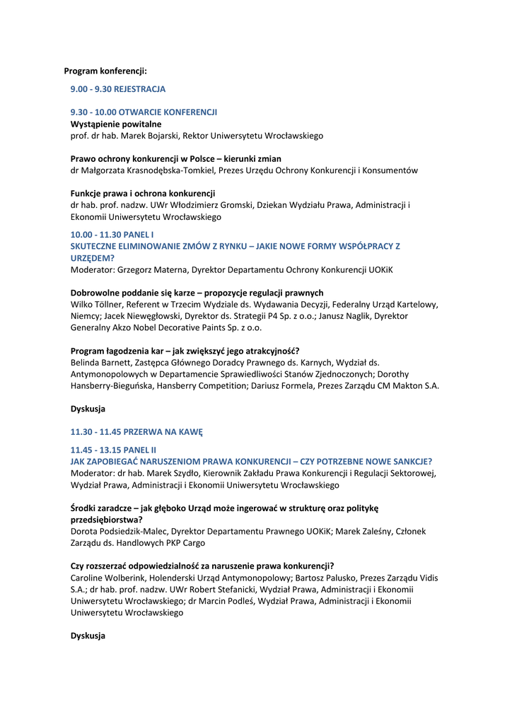 Program konferencji: 9.00 - 9.30 REJESTRACJA 9.30 - 10.00 OTWARCIE KONFERENCJI Wystąpienie powitalne prof. dr hab. Marek Bojarski, Rektor Uniwersytetu Wrocławskiego Prawo ochrony konkurencji w Polsce – kierunki zmian dr Małgorzata Krasnodębska-Tomkiel, Prezes Urzędu Ochrony Konkurencji i Konsumentów Funkcje prawa i ochrona konkurencji dr hab. prof. nadzw. UWr Włodzimierz Gromski, Dziekan Wydziału Prawa, Administracji i Ekonomii Uniwersytetu Wrocławskiego 10.00 - 11.30 PANEL I SKUTECZNE ELIMINOWANIE ZMÓW Z RYNKU – JAKIE NOWE FORMY WSPÓŁPRACY Z URZĘDEM? Moderator: Grzegorz Materna, Dyrektor Departamentu Ochrony Konkurencji UOKiK Dobrowolne poddanie się karze – propozycje regulacji prawnych Wilko Töllner, Referent w Trzecim Wydziale ds. Wydawania Decyzji, Federalny Urząd Kartelowy, Niemcy; Jacek Niewęgłowski, Dyrektor ds. Strategii P4 Sp. z o.o.; Janusz Naglik, Dyrektor Generalny Akzo Nobel Decorative Paints Sp. z o.o. Program łagodzenia kar – jak zwiększyć jego atrakcyjność? Belinda Barnett, Zastępca Głównego Doradcy Prawnego ds. Karnych, Wydział ds. Antymonopolowych w Departamencie Sprawiedliwości Stanów Zjednoczonych; Dorothy Hansberry-Bieguńska, Hansberry Competition; Dariusz Formela, Prezes Zarządu CM Makton S.A. Dyskusja 11.30 - 11.45 PRZERWA NA KAWĘ 11.45 - 13.15 PANEL II JAK ZAPOBIEGAĆ NARUSZENIOM PRAWA KONKURENCJI – CZY POTRZEBNE NOWE SANKCJE? Moderator: dr hab. Marek Szydło, Kierownik Zakładu Prawa Konkurencji i Regulacji Sektorowej, Wydział Prawa, Administracji i Ekonomii Uniwersytetu Wrocławskiego Środki zaradcze – jak głęboko Urząd może ingerować w strukturę oraz politykę przedsiębiorstwa? Dorota Podsiedzik-Malec, Dyrektor Departamentu Prawnego UOKiK; Marek Zaleśny, Członek Zarządu ds. Handlowych PKP Cargo Czy rozszerzać odpowiedzialność za naruszenie prawa konkurencji? Caroline Wolberink, Holenderski Urząd Antymonopolowy; Bartosz Palusko, Prezes Zarządu Vidis S.A.; dr hab. prof. nadzw. UWr Robert Stefanicki, Wydział Prawa, Administracji i Ekonomii Uniwersytetu Wrocławskiego; dr Marcin Podleś, Wydział Prawa, Administracji i Ekonomii Uniwersytetu Wrocławskiego Dyskusja 13.15 - 14.00 LUNCH 14.00 - 14.45 ZWIEDZANIE AULI LEOPOLDINA ORAZ WIZYTA NA TARASIE WIDOKOWYM WIEŻY MATEMATYCZNEJ 14.45 - 16.15 PANEL III KONTROLA KONCENTRACJI – CZY I JAKIE ZMIANY SĄ KONIECZNE? Moderator: Zbigniew Jurczyk, Dyrektor Delegatury UOKiK we Wrocławiu Przedsiębiorca w procesie kontroli koncentracji – wnioski z dotychczasowych procedur Simon Boyd, Prezes Zarządu UPC Polska; Maria Pertek, Dyrektor Departamentu Prawnego Work Service S.A.; Roman Rewald, Amerykańska Izba Handlowa w Polsce Postępowanie w sprawie koncentracji – propozycje zmian w przepisach Robert Kamiński, Dyrektor Departamentu Kontroli Koncentracji UOKiK; Maciej Szymański, Prezes Zarządu NFI Empik Media & Fashion S.A.; Krzysztof Rosiński, Prezes Zarządu Getin Noble Bank; dr Dominik Wolski, Kierownik ds. prawnych, Jeronimo Martins Dystrybucja Dyskusja 16.15 PODSUMOWANIE KONFERENCJI dr Małgorzata Krasnodębska-Tomkiel, Prezes Urzędu Ochrony Konkurencji i Konsumentów