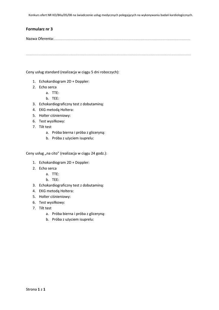 Konkurs ofert NR KO/BKa/05/08 na świadczenie usług medycznych polegających na wykonywaniu badań kardiologicznych. Formularz nr 3 Nazwa Oferenta:………………………………………………………………………………………………………………………………………………………………………………………………………….. …………………………………………………………………………………………………………………………………………………………………………………………………………………………………………………….. Ceny usług standard (realizacja w ciągu 5 dni roboczych): 1. Echokardiogram 2D + Doppler: 2. Echo serca a. TTE: b. TEE: 3. Echokardiograficzny test z dobutaminą: 4. EKG metodą Holtera: 5. Holter ciśnieniowy: 6. Test wysiłkowy: 7. Tilt test a. Próba bierna i próba z gliceryną: b. Próba z użyciem isuprelu: Ceny usług „na cito” (realizacja w ciągu 24 godz.): 1. Echokardiogram 2D + Doppler: 2. Echo serca a. TTE: b. TEE: 3. Echokardiograficzny test z dobutaminą: 4. EKG metodą Holtera: 5. Holter ciśnieniowy: 6. Test wysiłkowy: 7. Tilt test a. Próba bierna i próba z gliceryną: b. Próba z użyciem isuprelu: Strona 1 z 1