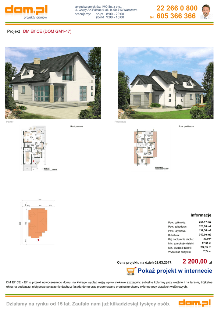 sprzedaż projektów: IMO Sp. z o.o., ul. Grupy AK Północ 4 lok. 9, 00-713 Warszawa pracujemy: pn-pt 8:00 - 20:00 sb-nd 9:00 - 15:00 22 266 0 800 tel. 605 366 366 Projekt DM Elf CE (DOM GM1-47) Parter Poddasze Rzut parteru Rzut poddasza Informacje Pow. całkowita: 254,17 m2 Pow. zabudowy: 128,90 m2 Pow. użytkowa: 132,54 m2 Kubatura: 740,00 m3 Kąt nachylenia dachu: 39,00 0 Min. szerokość działki: 17,65 m Min. długość działki: 23,65 m Wysokość budynku: 7,74 m Cena projektu na dzień 02.03.2017: 2 200,00 zł Pokaż projekt w internecie DM Elf CE - Elf to projekt nowoczesnego domu, na którego wygląd mają wpływ ciekawe szczegóły: subtelne kolumny przy wejściu i na tarasie, trójkątne okna na poddaszu, nietypowe połączenie dachu z fasadą domu oraz proponowane oryginalne otwory okienne przy drzwiach wejściowych. Działamy na rynku od 15 lat. Zaufało nam już kilkadziesiąt tysięcy osób.