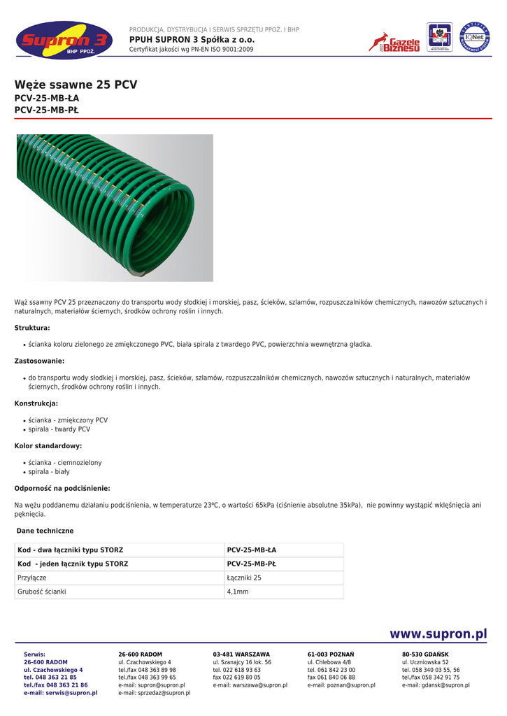 PRODUKCJA, DYSTRYBUCJA I SERWIS SPRZĘTU PPOŻ. I BHP PPUH SUPRON 3 Spółka z o.o. Certyfikat jakości wg PN-EN ISO 9001:2009 Węże ssawne 25 PCV PCV-25-MB-ŁA PCV-25-MB-PŁ Wąż ssawny PCV 25 przeznaczony do transportu wody słodkiej i morskiej, pasz, ścieków, szlamów, rozpuszczalników chemicznych, nawozów sztucznych i naturalnych, materiałów ściernych, środków ochrony roślin i innych. Struktura: ● ścianka koloru zielonego ze zmiękczonego PVC, biała spirala z twardego PVC, powierzchnia wewnętrzna gładka. Zastosowanie: ● do transportu wody słodkiej i morskiej, pasz, ścieków, szlamów, rozpuszczalników chemicznych, nawozów sztucznych i naturalnych, materiałów ściernych, środków ochrony roślin i innych. Konstrukcja: ● ● ścianka - zmiękczony PCV spirala - twardy PCV Kolor standardowy: ● ● ścianka - ciemnozielony spirala - biały Odporność na podciśnienie: Na wężu poddanemu działaniu podciśnienia, w temperaturze 23ºC, o wartości 65kPa (ciśnienie absolutne 35kPa), nie powinny wystąpić wklęśnięcia ani pęknięcia. Dane techniczne Kod - dwa łączniki typu STORZ PCV-25-MB-ŁA Kod - jeden łącznik typu STORZ PCV-25-MB-PŁ Przyłącze Łączniki 25 Grubość ścianki 4,1mm www.supron.pl Serwis: 26-600 RADOM ul. Czachowskiego 4 tel. 048 363 21 85 tel./fax 048 363 21 86 e-mail: [email protected] 26-600 RADOM ul. Czachowskiego 4 tel./fax 048 363 89 98 tel./fax 048 363 99 65 e-mail: [email protected] e-mail: [email protected] 03-481 WARSZAWA ul. Szanajcy 16 lok. 56 tel. 022 618 93 63 fax 022 619 80 05 e-mail: [email protected] 61-003 POZNAŃ ul. Chlebowa 4/8 tel. 061 842 23 00 fax 061 840 06 88 e-mail: [email protected] 80-530 GDAŃSK ul. Uczniowska 52 tel. 058 340 03 55, 56 tel./fax 058 342 91 75 e-mail: [email protected] PRODUKCJA, DYSTRYBUCJA I SERWIS SPRZĘTU PPOŻ. I BHP PPUH SUPRON 3 Spółka z o.o. Certyfikat jakości wg PN-EN ISO 9001:2009 Maksymalne ciśnienie robocze w temperaturze 23+/-2ºC 7 bar Dopuszczalne podciśnienie w temp. 20°C [ m słupa wody] 8 Długość 1mb do 30mb Temperatura pracy od -10°C do +55°C Standardowo węże ssawne zakończone są złączami STORZ. Wykonujemy również węże ssawne z następującymi złączami: http://www.supron.pl/zlacza-do-wezy-ssawnych/ www.supron.pl Serwis: 26-600 RADOM ul. Czachowskiego 4 tel. 048 363 21 85 tel./fax 048 363 21 86 e-mail: [email protected] 26-600 RADOM ul. Czachowskiego 4 tel./fax 048 363 89 98 tel./fax 048 363 99 65 e-mail: [email protected] e-mail: [email protected] 03-481 WARSZAWA ul. Szanajcy 16 lok. 56 tel. 022 618 93 63 fax 022 619 80 05 e-mail: [email protected] 61-003 POZNAŃ ul. Chlebowa 4/8 tel. 061 842 23 00 fax 061 840 06 88 e-mail: [email protected] 80-530 GDAŃSK ul. Uczniowska 52 tel. 058 340 03 55, 56 tel./fax 058 342 91 75 e-mail: [email protected] PRODUKCJA, DYSTRYBUCJA I SERWIS SPRZĘTU PPOŻ. I BHP PPUH SUPRON 3 Spółka z o.o. Certyfikat jakości wg PN-EN ISO 9001:2009 Węże ssawne 50 PCV PCV-50-MB-ŁA PCV-50-MB-PŁ Wąż ssawny PCV 50 przeznaczony do transportu wody słodkiej i morskiej, pasz, ścieków, szlamów, rozpuszczalników chemicznych, nawozów sztucznych i naturalnych, materiałów ściernych, środków ochrony roślin i innych. Struktura: ● ścianka koloru zielonego ze zmiękczonego PVC, biała spirala z twardego PVC, powierzchnia wewnętrzna gładka. Zastosowanie: ● do transportu wody słodkiej i morskiej, pasz, ścieków, szlamów, rozpuszczalników chemicznych, nawozów sztucznych i naturalnych, materiałów ściernych, środków ochrony roślin i innych. Konstrukcja: ● ● ścianka - zmiękczony PCV spirala - twardy PCV Kolor standardowy: ● ● ścianka - ciemnozielony spirala - biały Odporność na podciśnienie: Na wężu poddanemu działaniu podciśnienia, w temperaturze 23ºC, o wartości 65kPa (ciśnienie absolutne 35kPa), nie powinny wystąpić wklęśnięcia ani pęknięcia. Dane techniczne Kod - dwa łączniki typu STORZ PCV-50-MB-ŁA Kod - jeden łącznik typu STORZ PCV-50-MB-PŁ Przyłącze Łączniki 52 Grubość ścianki 4,2 mm www.supron.pl Serwis: 26-600 RADOM ul. Czachowskiego 4 tel. 048 363 21 85 tel./fax 048 363 21 86 e-mail: [email protected] 26-600 RADOM ul. Czachowskiego 4 tel./fax 048 363 89 98 tel./fax 048 363 99 65 e-mail: [email protected] e-mail: [email protected] 03-481 WARSZAWA ul. Szanajcy 16 lok. 56 tel. 022 618 93 63 fax 022 619 80 05 e-mail: [email protected] 61-003 POZNAŃ ul. Chlebowa 4/8 tel. 061 842 23 00 fax 061 840 06 88 e-mail: [email protected] 80-530 GDAŃSK ul. Uczniowska 52 tel. 058 340 03 55, 56 tel./fax 058 342 91 75 e-mail: [email protected] PRODUKCJA, DYSTRYBUCJA I SERWIS SPRZĘTU PPOŻ. I BHP PPUH SUPRON 3 Spółka z o.o. Certyfikat jakości wg PN-EN ISO 9001:2009 Maksymalne ciśnienie robocze w temperaturze 23+/-2ºC 4 bar Dopuszczalne podciśnienie w temp. 20°C [ m słupa wody] 8 Długość "L" 1mb do 30mb Ciężar węża 990g /m. od -10°C do +55°C Temperatura pracy Standardowo węże ssawne zakończone są złączami STORZ. Wykonujemy również węże ssawne z następującymi złączami: http://www.supron.pl/zlacza-do-wezy-ssawnych/ www.supron.pl Serwis: 26-600 RADOM ul. Czachowskiego 4 tel. 048 363 21 85 tel./fax 048 363 21 86 e-mail: [email protected] 26-600 RADOM ul. Czachowskiego 4 tel./fax 048 363 89 98 tel./fax 048 363 99 65 e-mail: [email protected] e-mail: [email protected] 03-481 WARSZAWA ul. Szanajcy 16 lok. 56 tel. 022 618 93 63 fax 022 619 80 05 e-mail: [email protected] 61-003 POZNAŃ ul. Chlebowa 4/8 tel. 061 842 23 00 fax 061 840 06 88 e-mail: [email protected] 80-530 GDAŃSK ul. Uczniowska 52 tel. 058 340 03 55, 56 tel./fax 058 342 91 75 e-mail: [email protected] PRODUKCJA, DYSTRYBUCJA I SERWIS SPRZĘTU PPOŻ. I BHP PPUH SUPRON 3 Spółka z o.o. Certyfikat jakości wg PN-EN ISO 9001:2009 Węże ssawne 75 PCV PCV-75-MB-ŁA PCV-75-MB-PŁ Wąż ssawny PCV 75 przeznaczony do transportu wody słodkiej i morskiej, pasz, ścieków, szlamów, rozpuszczalników