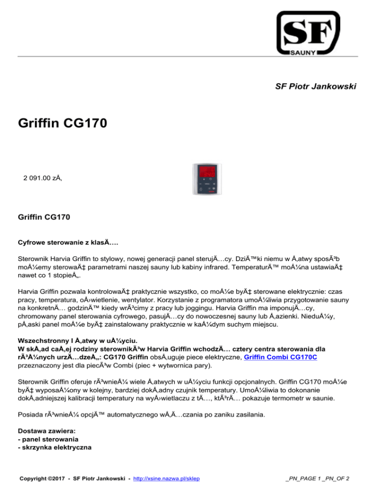 SF Piotr Jankowski Griffin CG170 2 091.00 zÅ‚ Griffin CG170 Cyfrowe sterowanie z klasÄ…. Sterownik Harvia Griffin to stylowy, nowej generacji panel sterujÄ…cy. DziÄ™ki niemu w Å‚atwy sposób możemy sterować parametrami naszej sauny lub kabiny infrared. TemperaturÄ™ można ustawiać nawet co 1 stopieÅ„. Harvia Griffin pozwala kontrolować praktycznie wszystko, co może być sterowane elektrycznie: czas pracy, temperatura, oÅ›wietlenie, wentylator. Korzystanie z programatora umożliwia przygotowanie sauny na konkretnÄ… godzinÄ™ kiedy wrócimy z pracy lub joggingu. Harvia Griffin ma imponujÄ…cy, chromowany panel sterowania cyfrowego, pasujÄ…cy do nowoczesnej sauny lub Å‚azienki. Nieduży, pÅ‚aski panel może być zainstalowany praktycznie w każdym suchym miejscu. Wszechstronny I Å‚atwy w użyciu. W skÅ‚ad caÅ‚ej rodziny sterowników Harvia Griffin wchodzÄ… cztery centra sterowania dla różnych urzÄ…dzeÅ„: CG170 Griffin obsÅ‚uguje piece elektryczne, Griffin Combi CG170C przeznaczony jest dla pieców Combi (piec + wytwornica pary). Sterownik Griffin oferuje również wiele Å‚atwych w użyciu funkcji opcjonalnych. Griffin CG170 może być wyposażony w kolejny, bardziej dokÅ‚adny czujnik temperatury. Umożliwia to dokonanie dokÅ‚adniejszej kalibracji temperatury na wyÅ›wietlaczu z tÄ…, którÄ… pokazuje termometr w saunie. Posiada również opcjÄ™ automatycznego włączania po zaniku zasilania. Dostawa zawiera: - panel sterowania - skrzynka elektryczna Copyright ©2017 - SF Piotr Jankowski - http://xsine.nazwa.pl/sklep _PN_PAGE 1 _PN_OF 2 - czujnik temperatury z przewodem ok. 4 m - przewód 5 m (dostÄ™pne również przewody o dÅ‚ugoÅ›ci 10 m, max. dÅ‚ugość przewodu – 30 m)  • Informacje techniczne • Instrukcje montażu i użytkowania Informacja o sprzedawcy Copyright ©2017 - SF Piotr Jankowski - http://xsine.nazwa.pl/sklep _PN_PAGE 2 _PN_OF 2