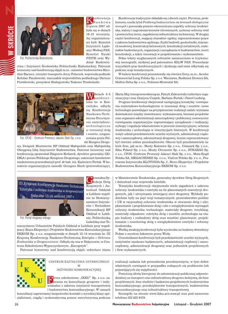 w SKRÓCIE NBI NBI K Konferencja tradycyjnie składała się z dwóch części. Pierwsza, problemowa, nosiła tytuł Problemy budownictwa na terenach ekologicznie cennych i poruszała prawno-ekonomiczne aspekty ochrony środowiska, walory i zagrożenia terenów chronionych, systemy ochrony wód i powierzchni ziemi, zagadnienia infrastruktury technicznej. W drugiej części konferencji, mającej charakter ogólny, zaprezentowano prace z zakresu budownictwa ogólnego, fizyki budowli, geotechniki, inżynierii mostowej, konstrukcji betonowych, konstrukcji metalowych, materiałów budowlanych, organizacji i zarządzania w budownictwie, teorii konstrukcji, a także innowacji w projektowaniu i wykonawstwie. Pełne teksty wygłaszanych referatów zamieszczono w trzytomowej monografii, wydanej pod patronatem KILiW PAN. Prezentacje wszystkich prac konferencyjnych i dyskusja nad nimi odbywała się podczas sesji tematycznych. W trakcie konferencji prezentowały się również firmy, m.in.: Arcelor Commercial Long Polska Sp. z o.o. Warszawa, Budimex Dromex SA, Halfen-Deha Sp. z o.o., Polimex-Mostostal SA. W Marta Maj (wiceprzewodnicząca), Patryk Zakrzewski (sekretarz organizacyjny) oraz Grażyna Czopek, Barbara Furtak i Paweł Ludwig. Program konferencji obejmował następującą tematykę: rozwiązania materiałowo-technologiczne w renowacji dróg i mostów; nowe technologie pozwalające na przyśpieszenie realizacji zadań; wymiana doświadczeń między inwestorami, wykonawcami, biurami projektów oraz organami administracji samorządowej i publicznej; nowoczesne rozwiązania organizacyjne usprawniające zarządzanie i realizację; wykupy i regulacje własnościowe w procesie inwestycyjnym; ochrona środowiska i archeologia w inwestycjach liniowych. W konferencji wzięli udział przedstawiciele uczelni wyższych, administracji rządowej i samorządowej, administracji drogowej, licznie reprezentowany był również sektor przedsiębiorstw. Obecni byli przedstawiciele takich firm, jak m.in.: Mosty Katowice Sp. z o.o., Unimark Sp. z o.o., Sika Poland Sp. z o.o., Mosty Chrzanów Sp. z o.o., STRABAG Sp. z o.o., CPJS- Centrum Promocji Jakosci Stali Sp. z o.o., Mota-Engil Polska SA, MEGACHEMIE Sp. z o.o., ViaCon Polska Sp. z o. o., Pracownia Inżynierska KLOTOIDA Sp. J., Biuro Ekspertyz i Projektów Budownictwa Komunikacyjnego EKKOM Sp. z o.o. G w Ministerstwie Środowiska, generalny dyrektor Dróg Krajowych i Autostrad oraz wojewoda lubelski. Tematyka konferencji obejmowała wiele zagadnień z zakresu ochrony środowiska i estetyki na tle planowanych inwestycji drogowych, jak i utrzymania istniejącej sieci drogowej. Wykłady podzielone były na pięć sesji tematycznych: prawodawstwo polskie i UE w racjonalnej ochronie środowiska w otoczeniu dróg i ulic; planowanie i projektowanie dróg i ulic z uwzględnieniem wymagań ochrony środowiska; technologie, materiały drogowe, recykling, materiały odpadowe; estetyka dróg i mostów, archeologia na etapie budowy i rozbudowy dróg oraz mostów; planowanie, projektowanie i monitoring dróg z uwzględnieniem estetyki i ochrony środowiska. Wielką atrakcją konferencji była wycieczka na budowę obwodnicy Puław z mostem łukowym przez Wisłę. Uczestnikami konferencji byli przedstawiciele uczelni wyższych, instytutów naukowo badawczych, administracji rządowej i samorządowej, administracji drogowej oraz jednostek projektowych i firm wykonawczych. onferencja Naukowa Krynica 2007 odbyła się w dniach 16–21 września. Jej organizatorami byli: Komitet Inżynierii Lądowej i Wodnej PAN, Komitet Nauki Fot. Politechnika Białostocka PZITB oraz Wydział Budownictwa i Inżynierii Środowiska Politechniki Białostockiej. Patronat honorowy nad konferencją objęli m.in.: minister budownictwa Mirosław Barszcz, minister transportu Jerzy Polaczek, wojewoda podlaski Bohdan Paszkowski, marszałek województwa podlaskiego Dariusz Piontkowski, prezydent Białegostoku Tadeusz Truskolaski. dniach 3–5 d października br. w Kościelisku odbyła się Konferencja Naukowo -Techniczna Rozwiązania materiałowotechnologiczne w renowacji dróg i mostów, zorganiFot. CPJS – Centrum Promocji Jakości Stali Sp. z o.o zowana przez Polski Kongres Drogowy, Związek Mostowców RP Oddział Małopolski oraz Małopolską Okręgową Izbę Inżynierów Budownictwa. Patronat honorowy nad konferencją sprawował Zbigniew Kotlarek, dyrektor generalny GDDKiA i prezes Polskiego Kongresu Drogowego, natomiast komitetowi naukowemu przewodniczył prof. dr hab. inż. Kazimierz Furtak. W komitecie organizacyjnym zasiedli: Grzegorz Stech (przewodniczący), eneralna Dyrekcja Dróg Krajowych i Autostrad Oddział w Lublinie wspólnie ze Stowarzyszeniem Inżynierów i Techników Komunikacji RP Oddział w LubliFot. Portal drogowy edroga nie, Politechniką Lubelską oraz Towarzystwem Urbanistów Polskich Oddział w Lublinie przy współpracy Biura Ekspertyz i Projektów Budownictwa Komunikacyjnego EKKOM Sp. z o.o. zorganizowała w dniach 13–14 września br. III Krajową Konferencję Naukowo-Techniczną Estetyka i Ochrona Środowiska w Drogownictwie. Odbyła się ona w Nałęczowie, w Centrum Szkoleniowo-Wypoczynkowym „Energetyk”. Patronat honorowy nad konferencją objęli: sekretarz stanu CENTRUM KSZTAŁCENIA USTAWICZNEGO W INŻYNIERII KOMUNIKACYJNEJ F i irma szkoleniowa „IKKU” Sp. z o.o. zaprasza na konsultacje grupowe i indyp widualne z zakresu inżynierii transportowej i budownictwa komunikacyjnego. W ramach konsultacji zapewniamy bezpośredni kontakt z wysokiej klasy specjalistami, ciągłą i systematyczną pomoc merytoryczną podczas 26 realizacji zadania lub prowadzenia przedsięwzięcia, w tym dobór właściwych rozwiązań w przypadku rodzących się problemów lub pojawiających się wątpliwości. Powyższą ofertę kierujemy do administracji publicznej odpowiedzialnej za transport oraz infrastrukturę drogowo-kolejową, do biur projektowych, biur studiów i badawczo-projektowych