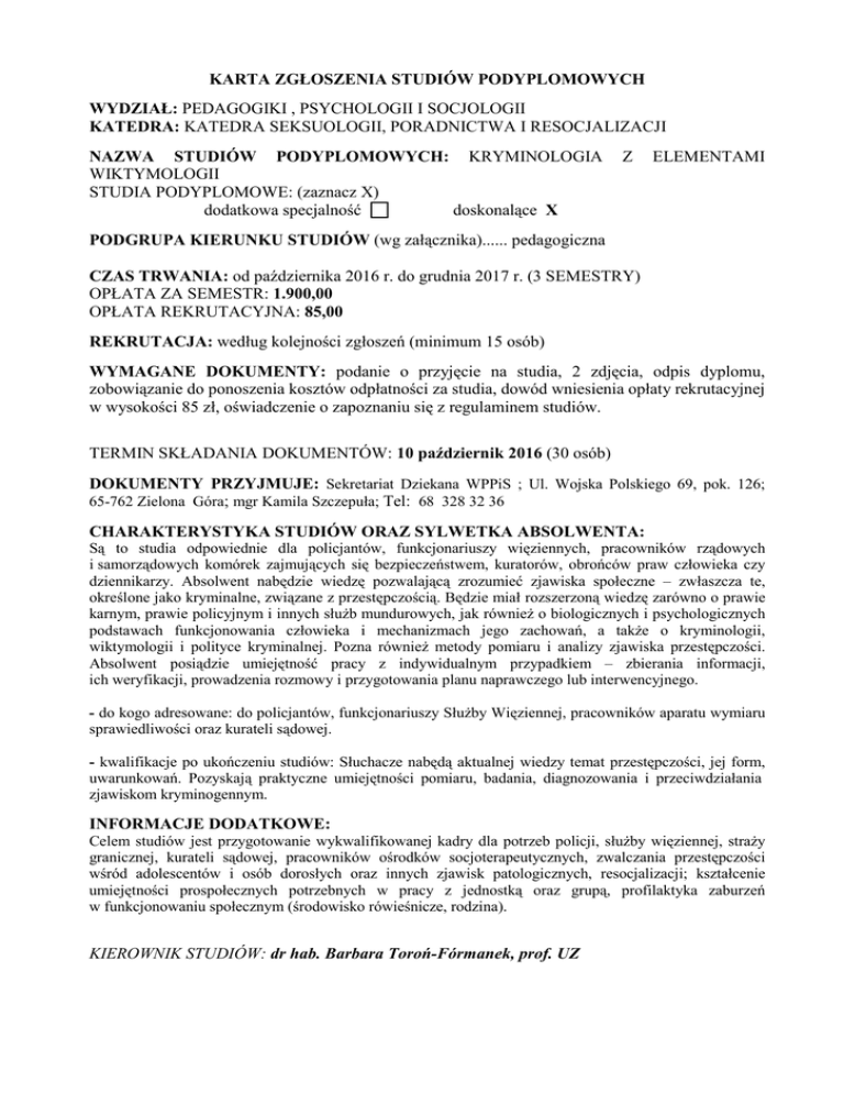 KARTA ZGŁOSZENIA STUDIÓW PODYPLOMOWYCH WYDZIAŁ: PEDAGOGIKI , PSYCHOLOGII I SOCJOLOGII KATEDRA: KATEDRA SEKSUOLOGII, PORADNICTWA I RESOCJALIZACJI NAZWA STUDIÓW PODYPLOMOWYCH: KRYMINOLOGIA WIKTYMOLOGII STUDIA PODYPLOMOWE: (zaznacz X) dodatkowa specjalność doskonalące X Z ELEMENTAMI PODGRUPA KIERUNKU STUDIÓW (wg załącznika)...... pedagogiczna CZAS TRWANIA: od października 2016 r. do grudnia 2017 r. (3 SEMESTRY) OPŁATA ZA SEMESTR: 1.900,00 OPŁATA REKRUTACYJNA: 85,00 REKRUTACJA: według kolejności zgłoszeń (minimum 15 osób) WYMAGANE DOKUMENTY: podanie o przyjęcie na studia, 2 zdjęcia, odpis dyplomu, zobowiązanie do ponoszenia kosztów odpłatności za studia, dowód wniesienia opłaty rekrutacyjnej w wysokości 85 zł, oświadczenie o zapoznaniu się z regulaminem studiów. TERMIN SKŁADANIA DOKUMENTÓW: 10 październik 2016 (30 osób) DOKUMENTY PRZYJMUJE: Sekretariat Dziekana WPPiS ; Ul. Wojska Polskiego 69, pok. 126; 65-762 Zielona Góra; mgr Kamila Szczepuła; Tel: 68 328 32 36 CHARAKTERYSTYKA STUDIÓW ORAZ SYLWETKA ABSOLWENTA: Są to studia odpowiednie dla policjantów, funkcjonariuszy więziennych, pracowników rządowych i samorządowych komórek zajmujących się bezpieczeństwem, kuratorów, obrońców praw człowieka czy dziennikarzy. Absolwent nabędzie wiedzę pozwalającą zrozumieć zjawiska społeczne – zwłaszcza te, określone jako kryminalne, związane z przestępczością. Będzie miał rozszerzoną wiedzę zarówno o prawie karnym, prawie policyjnym i innych służb mundurowych, jak również o biologicznych i psychologicznych podstawach funkcjonowania człowieka i mechanizmach jego zachowań, a także o kryminologii, wiktymologii i polityce kryminalnej. Pozna również metody pomiaru i analizy zjawiska przestępczości. Absolwent posiądzie umiejętność pracy z indywidualnym przypadkiem – zbierania informacji, ich weryfikacji, prowadzenia rozmowy i przygotowania planu naprawczego lub interwencyjnego. - do kogo adresowane: do policjantów, funkcjonariuszy Służby Więziennej, pracowników aparatu wymiaru sprawiedliwości oraz kurateli sądowej. - kwalifikacje po ukończeniu studiów: Słuchacze nabędą aktualnej wiedzy temat przestępczości, jej form, uwarunkowań. Pozyskają praktyczne umiejętności pomiaru, badania, diagnozowania i przeciwdziałania zjawiskom kryminogennym. INFORMACJE DODATKOWE: Celem studiów jest przygotowanie wykwalifikowanej kadry dla potrzeb policji, służby więziennej, straży granicznej, kurateli sądowej, pracowników ośrodków socjoterapeutycznych, zwalczania przestępczości wśród adolescentów i osób dorosłych oraz innych zjawisk patologicznych, resocjalizacji; kształcenie umiejętności prospołecznych potrzebnych w pracy z jednostką oraz grupą, profilaktyka zaburzeń w funkcjonowaniu społecznym (środowisko rówieśnicze, rodzina). KIEROWNIK STUDIÓW: dr hab. Barbara Toroń-Fórmanek, prof. UZ