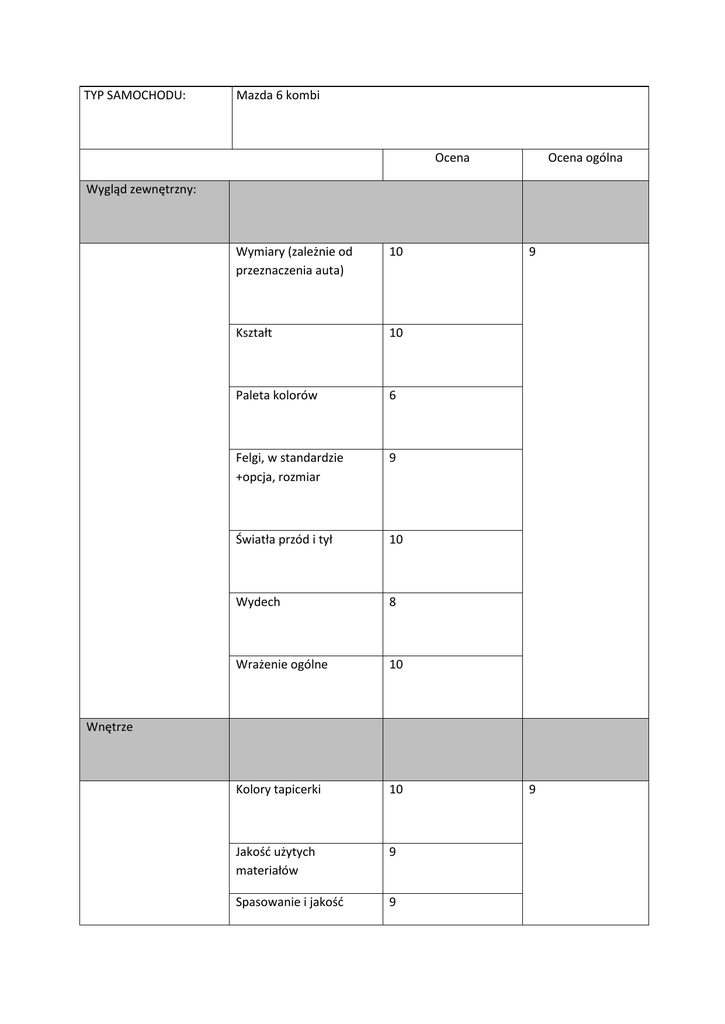 TYP SAMOCHODU: Mazda 6 kombi Ocena Ocena ogólna Wygląd zewnętrzny: Wymiary (zależnie od przeznaczenia auta) 10 Kształt 10 Paleta kolorów 6 Felgi, w standardzie +opcja, rozmiar 9 Światła przód i tył 10 Wydech 8 Wrażenie ogólne 10 Kolory tapicerki 10 Jakość użytych materiałów 9 Spasowanie i jakość 9 9 Wnętrze 9 wykończenia Deska rozdzielcza 9 Układ zegarów i ich wygląd 8 Prostota obsługi 9 Funkcjonalność 10 Pozycja za kierownicą 10 Przestronność wnętrza 9 Fotele 9 Widoczność 8 Kierownica 9 Tylna kanapa i ilość miejsca 8 Klimatyzacja 10 Ergonomia 9,7 Komfort 9 Zawieszenie 9 Wyciszenie wnętrza 9 Pakiet elektryczny 10 Systemy kontroli jazdy ESP * Asystent hamowania * Poduszki powietrzne * Czujniki parkowania * Kamery cofania * Asystent parkowania - Światła do jazdy dziennej * Możliwość wyłączenia poduszki powietrzej * Isofix * Bezpieczeństwo 9 ABS, EBD * Pojemność bagażnika 508l 9 Prostota ładowania (wys. progu załadunkowego) 10 Wykończenie komory bagażowej 9 Możliwość przewożenia dużych ładunków (składane tyle siedzenia) 9 Oświetlenie wnętrza 9 System audio 10 System multimedialny 8 Komputer pokładowy 7 Kluczyk 8 Wyposażenie dodatkowe 10 Bagażnik 9,2 Dodatki Osiągi 8,7 Rodzaj paliwa diesel 2,2l Pojemność silnika Moc 175KM Przyspieszenie od 0 do 100km/h 8s Spalanie w cyklu miejskim, poza miejskim i mieszanym 5,5/3,9/4,5 Pojemność zbiornika paliwa 62l Prędkość maksymalna 221km/h W teście 7l Wrażenie z jazdy 9 OCENA OGÓLNA 9