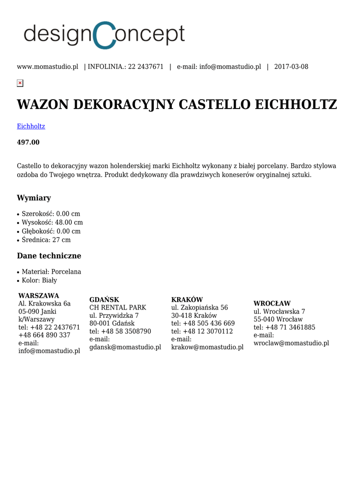 www.momastudio.pl | INFOLINIA.: 22 2437671 | e-mail: [email protected] | 2017-03-08 WAZON DEKORACYJNY CASTELLO EICHHOLTZ Eichholtz 497.00 Castello to dekoracyjny wazon holenderskiej marki Eichholtz wykonany z białej porcelany. Bardzo stylowa ozdoba do Twojego wnętrza. Produkt dedykowany dla prawdziwych koneserów oryginalnej sztuki. Wymiary ● ● ● ● Szerokość: 0.00 cm Wysokość: 48.00 cm Głębokość: 0.00 cm Średnica: 27 cm Dane techniczne ● ● Materiał: Porcelana Kolor: Biały WARSZAWA Al. Krakowska 6a 05-090 Janki k/Warszawy tel: +48 22 2437671 +48 664 890 337 e-mail: [email protected] GDAŃSK CH RENTAL PARK ul. Przywidzka 7 80-001 Gdańsk tel: +48 58 3508790 e-mail: [email protected] KRAKÓW ul. Zakopiańska 56 30-418 Kraków tel: +48 505 436 669 tel: +48 12 3070112 e-mail: [email protected] WROCŁAW ul. Wrocławska 7 55-040 Wrocław tel: +48 71 3461885 e-mail: [email protected]