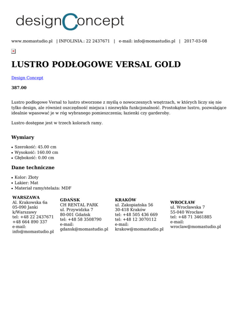 www.momastudio.pl | INFOLINIA.: 22 2437671 | e-mail: [email protected] | 2017-03-08 LUSTRO PODŁOGOWE VERSAL GOLD Design Concept 387.00 Lustro podłogowe Versal to lustro stworzone z myślą o nowoczesnych wnętrzach, w których liczy się nie tylko design, ale również oszczędność miejsca i niezwykła funkcjonalność. Prostokątne lustro, pozwalające idealnie wpasować je w róg wybranego pomieszczenia; łazienki czy garderoby. Lustro dostępne jest w trzech kolorach ramy. Wymiary ● ● ● Szerokość: 45.00 cm Wysokość: 160.00 cm Głębokość: 0.00 cm Dane techniczne ● ● ● Kolor: Złoty Lakier: Mat Materiał ramy/stelaża: MDF WARSZAWA Al. Krakowska 6a 05-090 Janki k/Warszawy tel: +48 22 2437671 +48 664 890 337 e-mail: [email protected] GDAŃSK CH RENTAL PARK ul. Przywidzka 7 80-001 Gdańsk tel: +48 58 3508790 e-mail: [email protected] KRAKÓW ul. Zakopiańska 56 30-418 Kraków tel: +48 505 436 669 tel: +48 12 3070112 e-mail: [email protected] WROCŁAW ul. Wrocławska 7 55-040 Wrocław tel: +48 71 3461885 e-mail: [email protected]