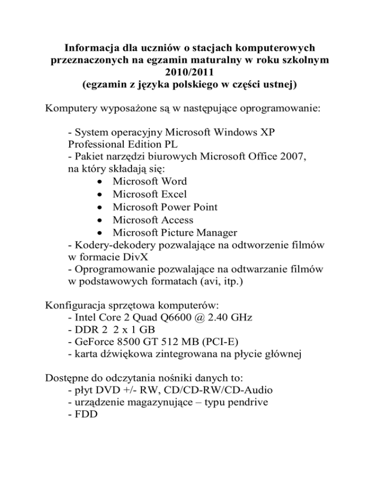 Informacja dla uczniów o stacjach komputerowych przeznaczonych na egzamin maturalny w roku szkolnym 2010/2011 (egzamin z języka polskiego w części ustnej) Komputery wyposażone są w następujące oprogramowanie: - System operacyjny Microsoft Windows XP Professional Edition PL - Pakiet narzędzi biurowych Microsoft Office 2007, na który składają się: • Microsoft Word • Microsoft Excel • Microsoft Power Point • Microsoft Access • Microsoft Picture Manager - Kodery-dekodery pozwalające na odtworzenie filmów w formacie DivX - Oprogramowanie pozwalające na odtwarzanie filmów w podstawowych formatach (avi, itp.) Konfiguracja sprzętowa komputerów: - Intel Core 2 Quad Q6600 @ 2.40 GHz - DDR 2 2 x 1 GB - GeForce 8500 GT 512 MB (PCI-E) - karta dźwiękowa zintegrowana na płycie głównej Dostępne do odczytania nośniki danych to: - płyt DVD +/- RW, CD/CD-RW/CD-Audio - urządzenie magazynujące – typu pendrive - FDD