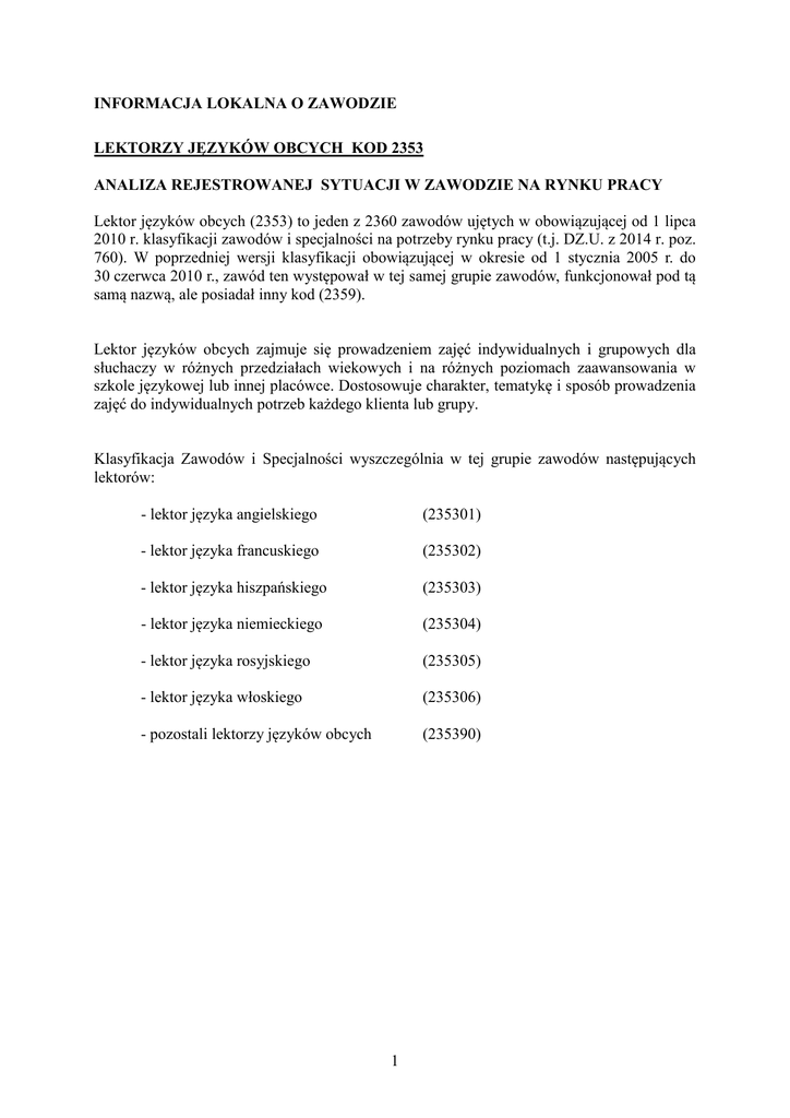 INFORMACJA LOKALNA O ZAWODZIE LEKTORZY JĘZYKÓW OBCYCH KOD 2353 ANALIZA REJESTROWANEJ SYTUACJI W ZAWODZIE NA RYNKU PRACY Lektor języków obcych (2353) to jeden z 2360 zawodów ujętych w obowiązującej od 1 lipca 2010 r. klasyfikacji zawodów i specjalności na potrzeby rynku pracy (t.j. DZ.U. z 2014 r. poz. 760). W poprzedniej wersji klasyfikacji obowiązującej w okresie od 1 stycznia 2005 r. do 30 czerwca 2010 r., zawód ten występował w tej samej grupie zawodów, funkcjonował pod tą samą nazwą, ale posiadał inny kod (2359). Lektor języków obcych zajmuje się prowadzeniem zajęć indywidualnych i grupowych dla słuchaczy w różnych przedziałach wiekowych i na różnych poziomach zaawansowania w szkole językowej lub innej placówce. Dostosowuje charakter, tematykę i sposób prowadzenia zajęć do indywidualnych potrzeb każdego klienta lub grupy. Klasyfikacja Zawodów i Specjalności wyszczególnia w tej grupie zawodów następujących lektorów: - lektor języka angielskiego (235301) - lektor języka francuskiego (235302) - lektor języka hiszpańskiego (235303) - lektor języka niemieckiego (235304) - lektor języka rosyjskiego (235305) - lektor języka włoskiego (235306) - pozostali lektorzy języków obcych (235390) 1 ANALIZA SYTUACJI NA RYNKU PRACY Wyszczególnienie Bezrobotni zarejestrowani w okresie ogółem Bezrobotni według stanu na koniec okresu Osoby do 12 miesięcy od dnia ukończenia nauki ogółem Osoby do 12 miesięcy od dnia ukończenia nauki na koniec okresu Wolne miejsca pracy i miejsca aktywizacji zawodowej ogółem Wolne miejsca pracy i miejsca aktywizacji zawodowej na koniec okresu BEZROBOTNI ORAZ WOLNE MIEJSCA PRACY I MIEJSCA AKTYWIZACJI ZAWODOWEJ W ZAWODZIE LEKTOR JĘZYKÓW OBCYCH (2353) W WOJEWÓDZTWIE KUJAWSKO – POMORSKIM W LATACH 2010 - 2014 Ipoł.2014 10 4 3 1 6 1 2013 21 7 1 0 15 1 2012 17 7 5 1 18 0 2011 6 4 2 0 5 0 2010 10 10 4 2 0 0 *Opracowano dane dotyczą całej grupy lektorów Większa liczba nowych rejestracji bezrobotnych niż zgłoszonych wolnych miejsc pracy lub aktywizacji zawodowej spowodowała, że w 2010r. i w 2013r. zawód lektor języków obcych został sklasyfikowany jako zawód nadwyżkowy1, tzn. taki, na który na rynku pracy istnieje mniejsze zapotrzebowanie niż liczba osób poszukujących pracy w tym zawodzie. Natomiast w 2011r. i w 2012r. zawód ten można zaliczyć do zrównoważonych, tzn. taki, na który na rynku pracy istnieje takie samo zapotrzebowanie jak liczba osób poszukujących pracy w tym zawodzie. 1 Podziału na zawody deficytowe, zrównoważone i nadwyżkowe dokonuje się na podstawie wskaźnika intensywności nadwyżki (deficytu) wyrażonego jako iloraz liczby zgłoszonych wolnych miejsc pracy i miejsc aktywizacji zawodowej w badanym okresie, w danym zawodzie i liczby zarejestrowanych bezrobotnych w badanym okresie, w danym zawodzie. Zawody deficytowe to takie, dla których wskaźnik przekracza wartość 1,1; zawody zrównoważone to te, dla których wartość wskaźnika mieści się w przedziale od 0,9 do 1,1; natomiast zawody nadwyżkowe to te, w których przypadku wskaźnik wynosi poniżej 0,9. Informacja przygotowana na podstawie opracowania: „Monitoring zawodów deficytowych i nadwyżkowych w województwie kujawsko-pomorskim”. Publikacja przygotowywana w ramach projektu WUP Rynek Pracy pod Lupą. Raporty znajdują się na stronie internetowej WUP. 2 WYNIKI BADANIA PRACODAWCÓW 2 ORAZ ABSOLWENTÓW Z badania ankietowego pracodawców przeprowadzonego w 2010r., 2011r., 2012r. i w 2013r. wynika, że pracodawcy naszego województwa nie planowali zatrudniania ani zwalniania lektorów języków obcych. Zawód lektor języków obcych pojawia się w pięcioletniej perspektywie zapotrzebowania na zawody, tj. do 2018r., dotyczy to konkretnie lektora języka angielskiego i niemieckiego. ANALIZA KSZTAŁCENIA W ZAWODZIE Lektor języków obcych powinien ukończyć studia filologiczne lub lingwistykę stosowaną w zakresie języka obcego, kolegium językowe lub posiadać umiejętności językowe potwierdzone świadectwem państwowego nauczycielskiego egzaminu z danego języka obcego stopnia II lub świadectwem znajomości danego języka obcego w zakresie zaawansowanym lub biegłym. W zależności od tego gdzie lektor podejmie zatrudnienie, potrzebne mogą być też kursy z zakresu specjalistycznego danego języka. W ramach podnoszenia kwalifikacji, lektorzy powinni korzystać z oferty szkoleniowej różnego rodzaju instytucji np.: stowarzyszeń, ośrodków doskonalenia nauczycieli, które organizują szkolenia np.: z zakresu języków branżowych, nauczania w klasach o zróżnicowanym poziomie kompetencji językowych, nauczania słownictwa, gramatyki czy kursy kulturowe itd. Dodatkowym wymogiem często są kursy metodyczne, np.: związane z metodą nauczania stosowaną w danej szkole językowej. Oprócz tego lektor musi posiadać odpowiednie przygotowanie pedagogiczne. Wymagania psychofizyczne: - komunikatywność, - otwartość, - umiejętność słuchania, - empatia, - poczucie humoru, - kreatywność, - przebojowość. W tym zawodzie nie mogą pracować osoby: - niewidome, - głuchonieme, - z wadami wymowy. 2 Badanie 2000 pracodawców jest realizowane w ramach projektu WUP Rynek Pracy pod Lupą. Raporty z badań zrealizowanych w 2010, 2011, 2012 i 2013r. znajdują się na stronie internetowej WUP (www.wup.torun.pl) oraz Projektu (www.podlupa.wup.torun.pl). 3 POMOCNE ADRESY Stowarzyszenie Lektorów Rzeczypospolitej Polskiej (SLRP) Ul. Alternatywy 4/152 02-775 Warszawa e-mail: [email protected] www.slrp.pl PRZYDATNE LINKI www.lecafedufle.fr www.profeurope.pl Opracowała: Małgorzata Graczyk doradca zawodowy WUP w Toruniu Centrum Informacji i Planowania Kariery Zawodowej w Toruniu Data ostatniej aktualizacji: wrzesień 2014r. Zaakceptował: Janusz Bokser 4