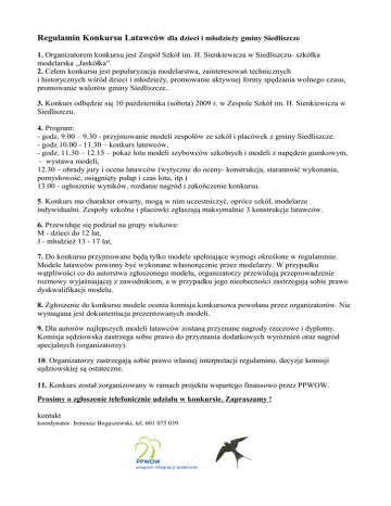 Regulamin Konkursu Latawców dla dzieci i młodzieży gminy Siedliszcze 1. Organizatorem konkursu jest Zespół Szkół im. H. Sienkiewicza w Siedliszczu- szkółka modelarska „Jaskółka”. 2. Celem konkursu jest popularyzacja modelarstwa, zainteresowań technicznych i historycznych wśród dzieci i młodzieży, promowanie aktywnej formy spędzania wolnego czasu, promowanie walorów gminy Siedliszcze.. 3. Konkurs odbędzie się 10 października (sobota) 2009 r. w Zespole Szkół im. H. Sienkiewicza w Siedliszczu. 4. Program: - godz. 9.00 – 9.30 - przyjmowanie modeli zespołów ze szkół i placówek z gminy Siedliszcze. - godz.10.00 - 11.30 – konkurs latawców, - godz. 11.30 – 12.15 – pokaz lotu modeli szybowców szkolnych i modeli z napędem gumkowym, - wystawa modeli, 12.30 – obrady jury i ocena latawców (wytyczne do oceny- konstrukcja, staranność wykonania, pomysłowość, osiągnięty pułap i czas lotu, itp.) 13.00 - ogłoszenie wyników, rozdanie nagród i zakończenie konkursu. 5. Konkurs ma charakter otwarty, mogą w nim uczestniczyć, oprócz szkół, modelarze indywidualni. Zespoły szkolne i placówki zgłaszają maksymalnie 3 konstrukcje latawców. 6. Przewiduje się podział na grupy wiekowe: M - dzieci do 12 lat, J - młodzież 13 - 17 lat, 7. Do konkursu przyjmowane będą tylko modele spełniające wymogi określone w regulaminie. Modele latawców powinny być wykonane własnoręcznie przez modelarzy. W przypadku wątpliwości co do autorstwa zgłoszonego modelu, organizatorzy przewidują przeprowadzenie rozmowy wyjaśniającej z zawodnikiem, a w przypadku jego nieobecności zastrzegają sobie prawo dyskwalifikacji modelu. 8. Zgłoszenie do konkursu modele ocenia komisja konkursowa powołana przez organizatorów. Nie wymagana jest dokumentacja prezentowanych modeli. 9. Dla autorów najlepszych modeli latawców zostaną przyznane nagrody rzeczowe i dyplomy. Komisja sędziowska zastrzega sobie prawo do przyznania dodatkowych wyróżnień oraz nagród specjalnych (organizatorzy). 10. Organizatorzy zastrzegają sobie prawo własnej interpretacji regulaminu, decyzje komisji sędziowskiej są ostateczne. 11. Konkurs został zorganizowany w ramach projektu wspartego finansowo przez PPWOW. Prosimy o zgłoszenie telefonicznie udziału w konkursie. Zapraszamy ! kontakt koordynator- Ireneusz Boguszewski, tel. 601 075 039