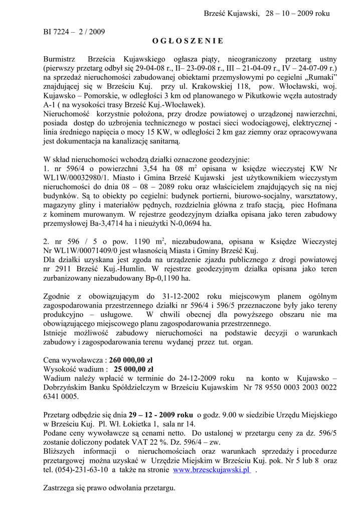 Brześć Kujawski, 28 – 10 – 2009 roku BI 7224 – 2 / 2009 OGŁOSZENIE Burmistrz Brześcia Kujawskiego ogłasza piąty, nieograniczony przetarg ustny (pierwszy przetarg odbył się 29-04-08 r., II– 23-09-08 r., III – 21-04-09 r., IV – 24-07-09 r.) na sprzedaż nieruchomości zabudowanej obiektami przemysłowymi po cegielni „Rumaki” znajdującej się w Brześciu Kuj. przy ul. Krakowskiej 118, pow. Włocławski, woj. Kujawsko – Pomorskie, w odległości 3 km od planowanego w Pikutkowie węzła autostrady A-1 ( na wysokości trasy Brześć Kuj.-Włocławek). Nieruchomość korzystnie położona, przy drodze powiatowej o urządzonej nawierzchni, posiada dostęp do uzbrojenia technicznego w postaci sieci wodociągowej, elektrycznej linia średniego napięcia o mocy 15 KW, w odległości 2 km gaz ziemny oraz opracowywana jest dokumentacja na kanalizację sanitarną. W skład nieruchomości wchodzą działki oznaczone geodezyjnie: 1. nr 596/4 o powierzchni 3,54 ha 08 m2 opisana w księdze wieczystej KW Nr WL1W/00032980/1. Miasto i Gmina Brześć Kujawski jest użytkownikiem wieczystym nieruchomości do dnia 08 – 08 – 2089 roku oraz właścicielem znajdujących się na niej budynków. Są to obiekty po cegielni: budynek portierni, biurowo-socjalny, warsztatowy, magazyny gliny i materiałów pędnych, rozdzielnia główna z trafo stacją, piec Hofmana z kominem murowanym. W rejestrze geodezyjnym działka opisana jako teren zabudowy przemysłowej Ba-3,4714 ha i nieużytki N-0,0694 ha. 2. nr 596 / 5 o pow. 1190 m2, niezabudowana, opisana w Księdze Wieczystej Nr WL1W/00071409/0 jest własnością Miasta i Gminy Brześć Kuj. Dla działki uzyskana jest zgoda na urządzenie zjazdu publicznego z drogi powiatowej nr 2911 Brześć Kuj.-Humlin. W rejestrze geodezyjnym działka opisana jako teren zurbanizowany niezabudowany Bp-0,1190 ha. Zgodnie z obowiązującym do 31-12-2002 roku miejscowym planem ogólnym zagospodarowania przestrzennego działki nr 596/4 i 596/5 przeznaczone były jako tereny produkcyjno – usługowe. W chwili obecnej dla powyższego obszaru nie ma obowiązującego miejscowego planu zagospodarowania przestrzennego. Istnieje możliwość zabudowy nieruchomości na podstawie decyzji o warunkach zabudowy i zagospodarowania terenu wydanej przez tut. organ. Cena wywoławcza : 260 000,00 zł Wysokość wadium : 25 000,00 zł Wadium należy wpłacić w terminie do 24-12-2009 roku na konto w Kujawsko – Dobrzyńskim Banku Spółdzielczym w Brześciu Kujawskim Nr 78 9550 0003 2003 0022 6341 0005. Przetarg odbędzie się dnia 29 – 12 - 2009 roku o godz. 9.00 w siedzibie Urzędu Miejskiego w Brześciu Kuj. Pl. Wł. Łokietka 1, sala nr 14. Podane ceny wywoławcze są cenami netto. Do ustalonej w przetargu ceny za dz. 596/5 zostanie doliczony podatek VAT 22 %. Dz. 596/4 – zw. Bliższych informacji o nieruchomościach oraz warunkach sprzedaży i procedurze przetargowej można uzyskać w Urzędzie Miejskim w Brześciu Kuj. pok. Nr 5 lub 8 oraz tel. (054)-231-63-10 a także na stronie www.brzesckujawski.pl . Zastrzega się prawo odwołania przetargu. REGULAMIN PRZETARGU USTNEGO NIEOGRANICZONEGO NA SPRZEDAŻ NIERUCHOMOŚCI ZABUDOWANEJ ZNAJDUJĄCEJ SIĘ W BRZEŚCIU KUJ. PRZY ul. KRAKOWSKIEJ 118 (PO CEGIELNI „RUMAKI”) 1. Przetarg odbywa się w formie ustnej. 2. W przetargu mogą brać udział osoby, które wpłacą w terminie do dnia 24-12-2009 r. wadium w wysokości 25 000,00 zł na konto w Kujawsko –Dobrzyńskim Banku Spółdzielczym w Brześciu Kujawskim Nr 78 9550 0003 2003 0022 6341 0005. Dowód wniesienia wadium podlega przedłożeniu komisji przetargowej przed otwarciem przetargu. 3. Postąpienie nie może wynosić mniej niż 1 % ceny wywoławczej z zaokrągleniem w górę do pełnych dziesiątek złotych. 4. Przetarg wygrywa osoba, której zaoferowana cena po trzykrotnym wywołaniu nie została przebita. Zaoferowana cena za dz. 596/4 jest ceną brutto -zwolnienie z podatku VAT – budynki: art. 43 ust.1 pkt 10 ustawy z dnia 11 marca 2004 r. o podatku od towarów i usług / Dz. U. z 2004 r. nr 54 poz. 535 z późn. zm./ zbycie prawa użytkowania wieczystego: § 13 ust.1 pkt 10 Rozporządzenia Ministra Finansów z dnia 28 listopada 2008 r. w sprawie wykonania niektórych przepisów ustawy o podatku od towarów i usług /Dz.U. Nr 212, poz. 1336/. Do ustalonej w przetargu ceny za dz. 596/5 zostanie doliczony podatek VAT 22 %. 5. Wadium wpłacone przez uczestnika, który wygrał przetarg zalicza się na poczet ceny nabycia nieruchomości, natomiast pozostałym uczestnikom zwraca się niezwłocznie po zakończeniu przetargu, jednak nie później niż przed upływem 3 dni od dnia zamknięcia lub odwołania przetargu. 6. Wadium ulega przepadkowi w razie uchylenia się uczestnika, który wygrał przetarg od zawarcia umowy. 7. Nabywca, za działkę nr 596/4 będzie zobowiązany wnosić opłatę roczną na konto Starostwa Powiatowego we Włocławku. Opłatę roczną wnosi się przez cały okres użytkowania wieczystego w terminie do 31 marca każdego roku, z góry za dany rok. Wysokość opłaty rocznej z tytułu użytkowania wieczystego nieruchomości może być aktualizowana nie częściej niż raz w roku. Nieruchomość zbywana jest wg. danych ewidencyjnych i w razie potrzeby wznowienia granic obowiązek ten spoczywa na nabywcy. 8. Termin uiszczenia ceny sprzedaży pomniejszonej o wpłacone wadium upływa w ciągu 21 dni od dnia przeprowadzonego przetargu na konto w Kujawsko– Dobrzyńskim Banku Spółdzielczym w Brześciu Kujawskim Nr 62 9550 0003 2003 0022 6341 0002. 9. Nabywca wyznacza Kancelarię Notarialną oraz ponosi koszty Aktu Notarialnego. 10. Zastrzega się prawo odwołania przetargu. Zatwierdził Burmistrz Brześcia Kujawskiego