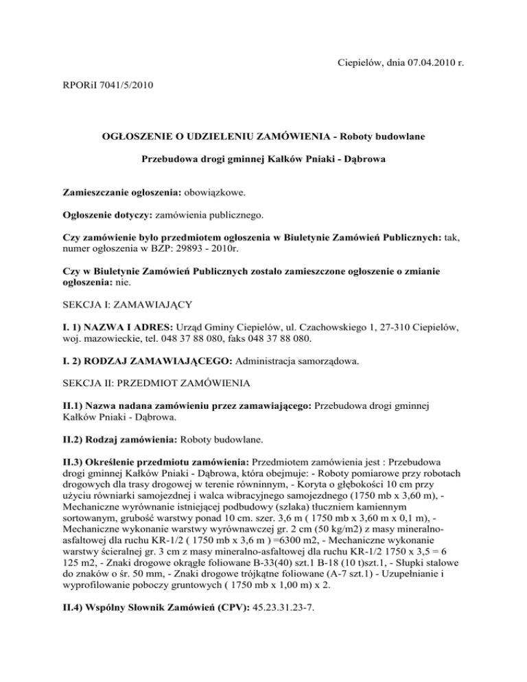 Ciepielów, dnia 07.04.2010 r. RPORiI 7041/5/2010 OGŁOSZENIE O UDZIELENIU ZAMÓWIENIA - Roboty budowlane Przebudowa drogi gminnej Kałków Pniaki - Dąbrowa Zamieszczanie ogłoszenia: obowiązkowe. Ogłoszenie dotyczy: zamówienia publicznego. Czy zamówienie było przedmiotem ogłoszenia w Biuletynie Zamówień Publicznych: tak, numer ogłoszenia w BZP: 29893 - 2010r. Czy w Biuletynie Zamówień Publicznych zostało zamieszczone ogłoszenie o zmianie ogłoszenia: nie. SEKCJA I: ZAMAWIAJĄCY I. 1) NAZWA I ADRES: Urząd Gminy Ciepielów, ul. Czachowskiego 1, 27-310 Ciepielów, woj. mazowieckie, tel. 048 37 88 080, faks 048 37 88 080. I. 2) RODZAJ ZAMAWIAJĄCEGO: Administracja samorządowa. SEKCJA II: PRZEDMIOT ZAMÓWIENIA II.1) Nazwa nadana zamówieniu przez zamawiającego: Przebudowa drogi gminnej Kałków Pniaki - Dąbrowa. II.2) Rodzaj zamówienia: Roboty budowlane. II.3) Określenie przedmiotu zamówienia: Przedmiotem zamówienia jest : Przebudowa drogi gminnej Kałków Pniaki - Dąbrowa, która obejmuje: - Roboty pomiarowe przy robotach drogowych dla trasy drogowej w terenie równinnym, - Koryta o głębokości 10 cm przy uŜyciu równiarki samojezdnej i walca wibracyjnego samojezdnego (1750 mb x 3,60 m), Mechaniczne wyrównanie istniejącej podbudowy (szlaka) tłuczniem kamiennym sortowanym, grubość warstwy ponad 10 cm. szer. 3,6 m ( 1750 mb x 3,60 m x 0,1 m), Mechaniczne wykonanie warstwy wyrównawczej gr. 2 cm (50 kg/m2) z masy mineralnoasfaltowej dla ruchu KR-1/2 ( 1750 mb x 3,6 m ) =6300 m2, - Mechaniczne wykonanie warstwy ścieralnej gr. 3 cm z masy mineralno-asfaltowej dla ruchu KR-1/2 1750 x 3,5 = 6 125 m2, - Znaki drogowe okrągłe foliowane B-33(40) szt.1 B-18 (10 t)szt.1, - Słupki stalowe do znaków o śr. 50 mm, - Znaki drogowe trójkątne foliowane (A-7 szt.1) - Uzupełnianie i wyprofilowanie poboczy gruntowych ( 1750 mb x 1,00 m) x 2. II.4) Wspólny Słownik Zamówień (CPV): 45.23.31.23-7. SEKCJA III: PROCEDURA III.1) TRYB UDZIELENIA ZAMÓWIENIA: Przetarg nieograniczony III.2) INFORMACJE ADMINISTRACYJNE • Zamówienie dotyczy projektu/programu finansowanego ze środków Unii Europejskiej: nie SEKCJA IV: UDZIELENIE ZAMÓWIENIA IV.1) DATA UDZIELENIA ZAMÓWIENIA: 02.04.2010. IV.2) LICZBA OTRZYMANYCH OFERT: 4. IV.3) LICZBA ODRZUCONYCH OFERT: 0. IV.4) NAZWA I ADRES WYKONAWCY, KTÓREMU UDZIELONO ZAMÓWIENIA: • Przedsiębiorstwo Robót Drogowych Spółka z o.o., ul. Doktora Perzyny 86, 26-700 Zwoleń, kraj/woj. mazowieckie. IV.5) Szacunkowa wartość zamówienia (bez VAT): 228980,00 PLN. IV.6) INFORMACJA O CENIE WYBRANEJ OFERTY ORAZ O OFERTACH Z NAJNIśSZĄ I NAJWYśSZĄ CENĄ • • • Cena wybranej oferty: 228980,00 Oferta z najniŜszą ceną: 228980,00 / Oferta z najwyŜszą ceną: 279160,00 Waluta: PLN. Wójt Gminy Ciepielów Artur Szewczyk