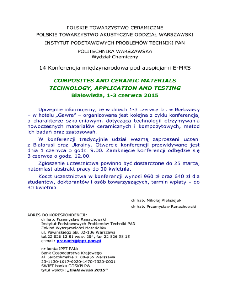 POLSKIE TOWARZYSTWO CERAMICZNE POLSKIE TOWARZYSTWO AKUSTYCZNE ODDZIAŁ WARSZAWSKI INSTYTUT PODSTAWOWYCH PROBLEMÓW TECHNIKI PAN POLITECHNIKA WARSZAWSKA Wydział Chemiczny 14 Konferencja międzynarodowa pod auspicjami E-MRS COMPOSITES AND CERAMIC MATERIALS TECHNOLOGY, APPLICATION AND TESTING Białowieża, 1-3 czerwca 2015 Uprzejmie informujemy, że w dniach 1-3 czerwca br. w Białowieży – w hotelu „Gawra” – organizowana jest kolejna z cyklu konferencja, o charakterze szkoleniowym, dotycząca technologii otrzymywania nowoczesnych materiałów ceramicznych i kompozytowych, metod ich badań oraz zastosowań. W konferencji tradycyjnie udział wezmą zaproszeni uczeni z Białorusi oraz Ukrainy. Otwarcie konferencji przewidywane jest dnia 1 czerwca o godz. 9.00. Zamknięcie konferencji odbędzie się 3 czerwca o godz. 12.00. Zgłoszenie uczestnictwa powinno być dostarczone do 25 marca, natomiast abstrakt pracy do 30 kwietnia. Koszt uczestnictwa w konferencji wynosi 960 zł oraz 640 zł dla studentów, doktorantów i osób towarzyszących, termin wpłaty – do 30 kwietnia. dr hab. Mikołaj Aleksiejuk dr hab. Przemysław Ranachowski ADRES DO KORESPONDENCJI: dr hab. Przemysław Ranachowski Instytut Podstawowych Problemów Techniki PAN Zakład Wytrzymałości Materiałów ul. Pawińskiego 5B, 02-106 Warszawa tel.22 826 12 81 wew. 254, fax 22 826 98 15 e-mail: [email protected] nr konta IPPT PAN: Bank Gospodarstwa Krajowego Al. Jerozolimskie 7, 00-955 Warszawa 23-1130-1017-0020-1470-7320-0001 SWIFT banku GOSKPLPW tytuł wpłaty: „Białowieża 2015”
