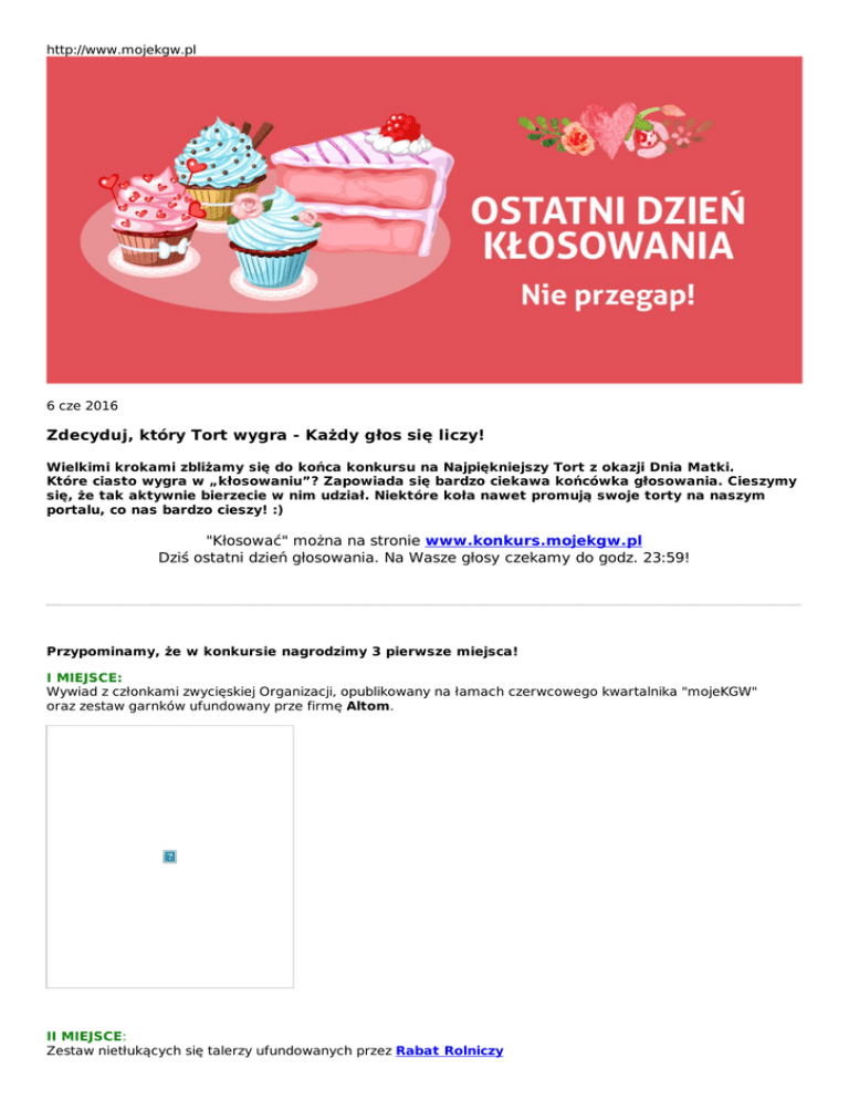 http://www.mojekgw.pl 6 cze 2016 Zdecyduj, który Tort wygra - Każdy głos się liczy! Wielkimi krokami zbliżamy się do końca konkursu na Najpiękniejszy Tort z okazji Dnia Matki. Które ciasto wygra w „kłosowaniu”? Zapowiada się bardzo ciekawa końcówka głosowania. Cieszymy się, że tak aktywnie bierzecie w nim udział. Niektóre koła nawet promują swoje torty na naszym portalu, co nas bardzo cieszy! :) "Kłosować" można na stronie www.konkurs.mojekgw.pl Dziś ostatni dzień głosowania. Na Wasze głosy czekamy do godz. 23:59! Przypominamy, że w konkursie nagrodzimy 3 pierwsze miejsca! I MIEJSCE: Wywiad z członkami zwycięskiej Organizacji, opublikowany na łamach czerwcowego kwartalnika "mojeKGW" oraz zestaw garnków ufundowany prze firmę Altom. II MIEJSCE: Zestaw nietłukących się talerzy ufundowanych przez Rabat Rolniczy III MIEJSCE: Nagroda niespodzianka ufundowana przez firmę Zelmer. Redakcja mojeKGW.pl ..