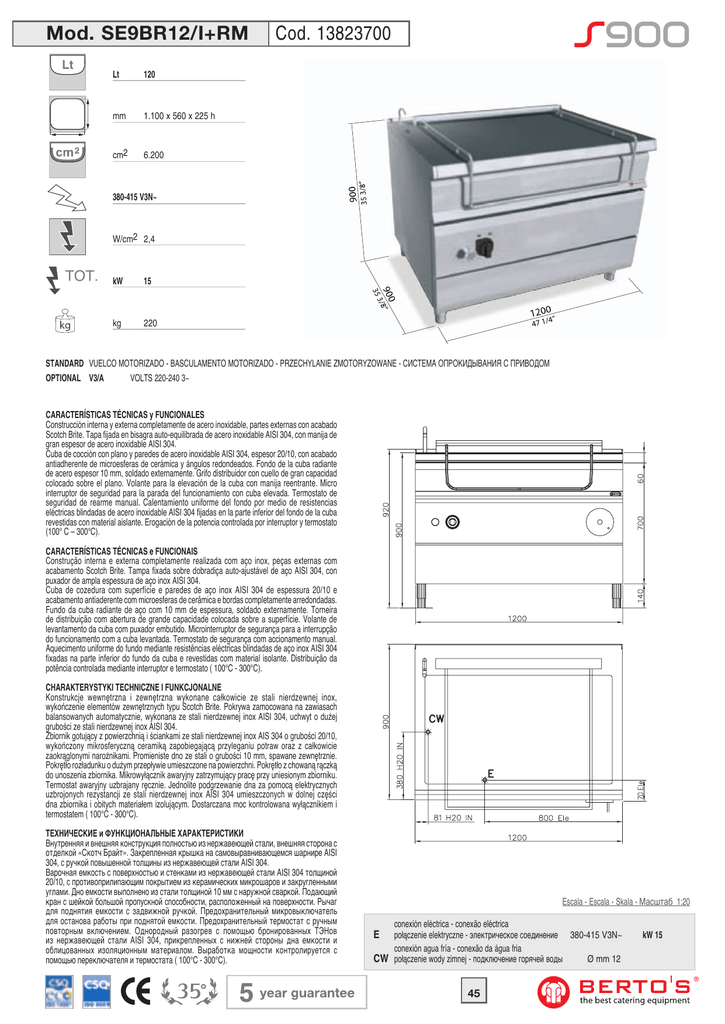 120 mm 1.100 x 560 x 225 h cm2 6.200 380-415 V3N~ 900 Lt Cod. 13823700 35 3/8” Mod. SE9BR12/I+RM W/cm2 2,4 TOT. 15 kg 220 35 900/8” kW 3 1200 ” 4 47 1/ STANDARD VUELCO MOTORIZADO - BASCULAMENTO MOTORIZADO - PRZECHYLANIE ZMOTORYZOWANE - СИСТЕМА ОПРОКИДЫВАНИЯ С ПРИВОДОМ OPTIONAL V3/A VOLTS 220-240 3~ CARACTERÍSTICAS TÉCNICAS y FUNCIONALES Construcción interna y externa completamente de acero inoxidable, partes externas con acabado Scotch Brite. Tapa fijada en bisagra auto-equilibrada de acero inoxidable AISI 304, con manija de gran espesor de acero inoxidable AISI 304. Cuba de cocción con plano y paredes de acero inoxidable AISI 304, espesor 20/10, con acabado antiadherente de microesferas de cerámica y ángulos redondeados. Fondo de la cuba radiante de acero espesor 10 mm, soldado externamente. Grifo distribuidor con cuello de gran capacidad colocado sobre el plano. Volante para la elevación de la cuba con manija reentrante. Micro interruptor de seguridad para la parada del funcionamiento con cuba elevada. Termostato de seguridad de rearme manual. Calentamiento uniforme del fondo por medio de resistencias eléctricas blindadas de acero inoxidable AISI 304 fijadas en la parte inferior del fondo de la cuba revestidas con material aislante. Erogación de la potencia controlada por interruptor y termostato (100° C – 300°C). CARACTERÍSTICAS TÉCNICAS e FUNCIONAIS Construção interna e externa completamente realizada com aço inox, peças externas com acabamento Scotch Brite. Tampa fixada sobre dobradiça auto-ajustável de aço AISI 304, con puxador de ampla espessura de aço inox AISI 304. Cuba de cozedura com superfície e paredes de aço inox AISI 304 de espessura 20/10 e acabamento antiaderente com microesferas de cerâmica e bordas completamente arredondadas. Fundo da cuba radiante de aço com 10 mm de espessura, soldado externamente. Torneira de distribuição com abertura de grande capacidade colocada sobre a superfície. Volante de levantamento da cuba com puxador embutido. Microinterruptor de segurança para a interrupção do funcionamento com a cuba levantada. Termostato de segurança com accionamento manual. Aquecimento uniforme do fundo mediante resistências eléctricas blindadas de aço inox AISI 304 fixadas na parte inferior do fundo da cuba e revestidas com material isolante. Distribuição da potência controlada mediante interruptor e termostato ( 100°C - 300°C). CHARAKTERYSTYKI TECHNICZNE I FUNKCJONALNE Konstrukcje wewnętrzna i zewnętrzna wykonane całkowicie ze stali nierdzewnej inox, wykończenie elementów zewnętrznych typu Scotch Brite. Pokrywa zamocowana na zawiasach balansowanych automatycznie, wykonana ze stali nierdzewnej inox AISI 304, uchwyt o dużej grubości ze stali nierdzewnej inox AISI 304. Zbiornik gotujący z powierzchnią i ściankami ze stali nierdzewnej inox AIS 304 o grubości 20/10, wykończony mikrosferyczną ceramiką zapobiegającą przyleganiu potraw oraz z całkowicie zaokrąglonymi narożnikami. Promieniste dno ze stali o grubości 10 mm, spawane zewnętrznie. Pokrętło rozładunku o dużym przepływie umieszczone na powierzchni. Pokrętło z chowaną rączką do unoszenia zbiornika. Mikrowyłącznik awaryjny zatrzymujący pracę przy uniesionym zbiorniku. Termostat awaryjny uzbrajany ręcznie. Jednolite podgrzewanie dna za pomocą elektrycznych uzbrojonych rezystancji ze stali nierdzewnej inox AISI 304 umieszczonych w dolnej części dna zbiornika i obitych materiałem izolującym. Dostarczana moc kontrolowana wyłącznikiem i termostatem ( 100°C - 300°C). ТЕХНИЧЕСКИЕ и ФУНКЦИОНАЛЬНЫЕ ХАРАКТЕРИСТИКИ Внутренняя и внешняя конструкция полностью из нержавеющей стали, внешняя сторона с отделкой «Скотч Брайт». Закрепленная крышка на самовыравнивающемся шарнире AISI 304, с ручкой повышенной толщины из нержавеющей стали AISI 304. Варочная емкость с поверхностью и стенками из нержавеющей стали AISI 304 толщиной 20/10, с противоприлипающим покрытием из керамических микрошаров и закругленными углами. Дно емкости выполнено из стали толщиной 10 мм с наружной сваркой. Подающий кран с шейкой большой пропускной способности, расположенный на поверхности. Рычаг для поднятия емкости с задвижной ручкой. Предохранительный микровыключатель для останова работы при поднятой емкости. Предохранительный термостат с ручным повторным включением. Однородный разогрев с помощью бронированных ТЭНов из нержавеющей стали AISI 304, прикрепленных с нижней стороны дна емкости и облицованных изоляционным материалом. Выработка мощности контролируется с помощью переключателя и термостата ( 100°C - 300°C). Escala - Escala - Skala - Масштаб 1:20 conexión eléctrica - conexão eléctrica połączenie elektryczne - электрическое соединение 380-415 V3N~ conexión agua fría - conexão da água fria CW połączenie wody zimnej - подключение горячей воды Ø mm 12 E 45 kW 15