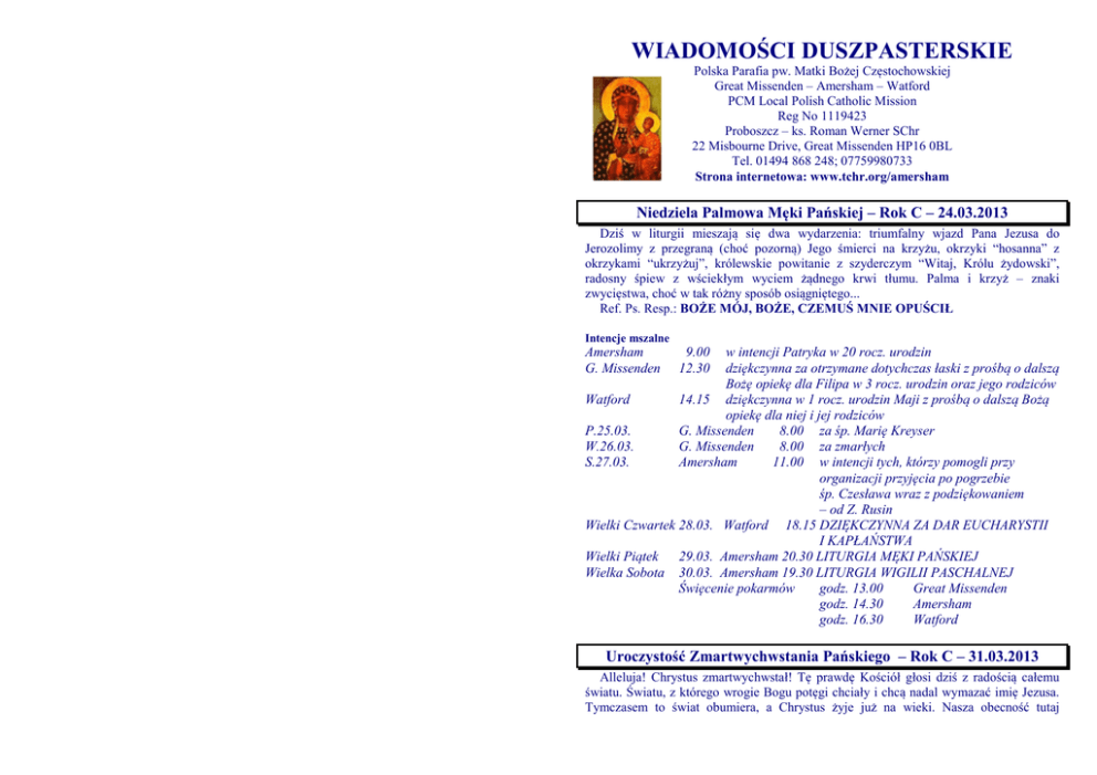 WIADOMOŚCI DUSZPASTERSKIE Polska Parafia pw. Matki Bożej Częstochowskiej Great Missenden – Amersham – Watford PCM Local Polish Catholic Mission Reg No 1119423 Proboszcz – ks. Roman Werner SChr 22 Misbourne Drive, Great Missenden HP16 0BL Tel. 01494 868 248; 07759980733 Strona internetowa: www.tchr.org/amersham Niedziela Palmowa Męki Pańskiej – Rok C – 24.03.2013 Dziś w liturgii mieszają się dwa wydarzenia: triumfalny wjazd Pana Jezusa do Jerozolimy z przegraną (choć pozorną) Jego śmierci na krzyżu, okrzyki “hosanna” z okrzykami “ukrzyżuj”, królewskie powitanie z szyderczym “Witaj, Królu żydowski”, radosny śpiew z wściekłym wyciem żądnego krwi tłumu. Palma i krzyż – znaki zwycięstwa, choć w tak różny sposób osiągniętego... Ref. Ps. Resp.: BOŻE MÓJ, BOŻE, CZEMUŚ MNIE OPUŚCIŁ Intencje mszalne Amersham G. Missenden 9.00 12.30 w intencji Patryka w 20 rocz. urodzin dziękczynna za otrzymane dotychczas łaski z prośbą o dalszą Bożę opiekę dla Filipa w 3 rocz. urodzin oraz jego rodziców Watford 14.15 dziękczynna w 1 rocz. urodzin Maji z prośbą o dalszą Bożą opiekę dla niej i jej rodziców P.25.03. G. Missenden 8.00 za śp. Marię Kreyser W.26.03. G. Missenden 8.00 za zmarłych S.27.03. Amersham 11.00 w intencji tych, którzy pomogli przy organizacji przyjęcia po pogrzebie śp. Czesława wraz z podziękowaniem – od Z. Rusin Wielki Czwartek 28.03. Watford 18.15 DZIĘKCZYNNA ZA DAR EUCHARYSTII I KAPŁAŃSTWA Wielki Piątek 29.03. Amersham 20.30 LITURGIA MĘKI PAŃSKIEJ Wielka Sobota 30.03. Amersham 19.30 LITURGIA WIGILII PASCHALNEJ Święcenie pokarmów godz. 13.00 Great Missenden godz. 14.30 Amersham godz. 16.30 Watford Uroczystość Zmartwychwstania Pańskiego – Rok C – 31.03.2013 Alleluja! Chrystus zmartwychwstał! Tę prawdę Kościół głosi dziś z radością całemu światu. Światu, z którego wrogie Bogu potęgi chciały i chcą nadal wymazać imię Jezusa. Tymczasem to świat obumiera, a Chrystus żyje już na wieki. Nasza obecność tutaj świadczy o tym, że i my pokonujemy z Chrystusem zło, grzech i śmierć. Jesteśmy tu, bo uwierzyliśmy tym, którzy zastali pusty grób i którzy widzieli Pana żywego. Ref. Ps. Resp.: W TYM DNIU WSPANIAŁYM WSZYSCY SIĘ WESELMY Intencje mszalne Watford 6.30 MSZA ŚW. REZUREKCYJNA Amersham 9.00 za śp. Zdzisława i Jerzego Busiakiewicz G. Missenden 12.30 w intencji Parafii i Parafian II święto wielkanocne – 1.04.2013 Amersham 10.30 za śp. Marię Lentowicz – od pp. Ochędowskich G. Missenden 12.30 w intencji żyjących i zmarłych przyjaciół i dobrodziejów Towarzystwa Chrystusow. Watford 14.15 o łaskę powrotu do zdrowia Zbigniewa W. 2.04. G. Missenden 8.00 za śp. Łucję i Alfreda Powieckich S.3.04. Amersham 11.00 w pewnej intencji Cz.4.04. Watford 19.00 za zmarłych P.5.04. Amersham 19.00 za śp. Marię Kreyser S.6.04. Amersham 9.00 II Niedziela Wielkanocna – Miłosierdzia Bożego – Rok C – 7.04.2013 „Pragnę, aby święto Miłosierdzia było ucieczką i schronieniem dla wszystkich dusz, a szczególnie dla biednych grzeszników” (Dz. 699) – te słowa wypowiedziane przez Pana Jezusa do św. Faustyny były inspiracją do ustanowienia święta Miłosierdzia Bożego, które dziś w Kościele przeżywamy. Trwamy w wielkanocnej radości ze zwycięstwa życia nad śmiercią, miłości nad grzechem. Ref. Ps. Resp.: DZIĘKUJCIE PANU, BO JEST MIŁOSIERNY Intencje mszalne Amersham G. Missenden Watford P.8.04. W.9.04. S.10.04. Cz.11.04. P.12.04. S.13.04. 9.00 12.30 za zmarłych rodziców i braci – od rodziny za śp. Marię i Zygmunta Maligranda, Czesława Kaczmarka – od żony i dzieci 14.15 za śp. Henryka Wiśniewskiego (18 rocz.) G. Missenden 8.00 w intencji Łukasza w 22 rocz. urodzin G. Missenden 8.00 za śp. Marię Kreyser Amersham 11.00 w pewnej intencji Watford 19.00 za śp. Helenę Wargacką (dz. ur.) Amersham 19.00 za zmarłych Amersham 9.00 III Niedziela Wielkanocna – Rok C – 14.04.2013 Trzecia niedziela wielkanocna już od kilku lat rozpoczyna tydzień szczególnie poświęcony Pismu Świętemu – Tydzień Biblijny. Podejmowane inicjatywy mają za zadanie przybliżyć nam Boże Słowo, zachęcić do czytania i słuchania go nie tylko w Kościele, ale także w domu. Stając przy ołtarzu Chrystusa w dzień Pański, wspominając i uobecniając Jego zwycięstwo nad grzechem i śmiercią, dziękujmy za Słowo, które nam zostawił. Niech ono przenika naszą codzienność i prowadzi do głębszego zrozumienia Bożych spraw. Ref. Ps. Resp.: SŁAWIĘ CIĘ, PANIE, BO MNIE WYBAWIŁEŚ Intencje mszalne Amersham G. Missenden Watford P.15.04. W.16.04. S. 17.04. Cz.18.04. P.19.04. S.20.04. 9.00 za śp. Władysława i Marię Lentowicz 12.30 za śp. Edwarda Tramp (38 rocz.) 14.15 za śp. Dawida Szuba (4 rocz.) G. Missenden 8.00 w pewnej intencji G. Missenden 8.00 Amersham 11.00 w pewnej intencji Watford 19.00 za śp. Marię Kreyser Amersham 19.00 za zmarłych Amersham 8.30 IV Niedziela Wielkanocna – Rok C – 21.04.2013 W czwartą niedzielę wielkanocną zmartwychwstały Jezus staje przed nami jako Dobry Pasterz. W Jego pełnym miłości sformułowaniu „moje owce” słyszymy troskę o zagubioną ludzkość, która nieustannie potrzebuje pasterzy gotowych tak jak On oddać swoje życie za owce, za wspólnotę Kościoła. W rozpoczynające się kwartalne dni modlitw o powołania do służby w Kościele i obchodzony dziś Światowy Dzień Modlitw o Powołania prośmy Pana Żniwa, aby posłał robotników wszędzie tam, gdzie wspólnota wiernych ich potrzebuje. Ref. Ps. Resp.: MY LUDEM PANA I JEGO OWCAMI Intencje mszalne Amersham G. Missenden Watford P.22.04. W. 23.04. S. 24.04. Cz.25.04. P.26.04. S.27.04. 9.00 w intencji Mateusza w 3 rocz. urodzin i jego rodziców 12.30 za śp. Jana Samek (12 rocz.) 14.15 za zmarłych kapłanów G. Missenden 8.00 za śp. Marię Kreyser G. Missenden 8.00 Amersham 11.00 w intencji Damiana w 15 rocz. urodzin Watford 19