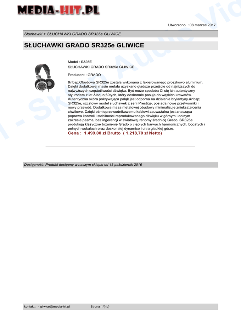 o i d d i V Utworzono : 08 marzec 2017 Słuchawki > SŁUCHAWKI GRADO SR325e GLIWICE SŁUCHAWKI GRADO SR325e GLIWICE Model : S325E u A SŁUCHAWKI GRADO SR325e GLIWICE p le Producent : GRADO l p Obudowa SR325e została wykonana z lakierowanego proszkowo aluminium. Dzięki dodatkowej masie metalu uzyskano gładsze przejście od najniższych do najwyższych częstotliwości dźwięku. Być może spodoba Ci się ich autentyczny styl rodem z lat ‘60tych, który doskonale pasuje do wąskich krawatów. Autentyczna skóra pokrywająca pałąk jest odporna na działanie brylantyny. SR325e, szcztowy model słuchawek z serii Prestige, posiada nowe przetworniki i nowy przewód. Dodatkowa masa metalowej obudowy minimalizuje zniekształcenia chwilowe. Dzięki ośmioprzewodnikowemu kablowi zauważalna jest znacząca poprawa kontroli i stabilności reprodukowanego dźwięku w górnym i dolnym zakresie pasma, bez ingerencji w światowej renomy średnicę Grado. SR325e produkują klasyczne brzmienie Grado o ciepłych barwach harmonicznych, bogatych i pełnych wokalach oraz doskonałej dynamice i ultra gładkiej górze. k S Cena : 1.499,00 zł Brutto ( 1.218,70 zł Netto) Dostępność: Produkt dostępny w naszym sklepie od 13 październik 2016 kontakt : - [email protected] Strona 1/{nb}