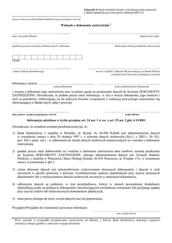 Załącznik Nr 2a do Instrukcji Zasady i tryb dokonywania zastrzeżeń w Banku Spółdzielczym zrzeszonym z Bankiem BPS S.A. -------------------------------------------------------------(pieczęć adresowa jednostki Banku Spółdzielczego przyjmującej wniosek) Wniosek o dokonanie zastrzeżenia 1 …………………………………….............. ………………………………………………………... imię i nazwisko Klienta miejscowość, data. …………………………………….............. ………………………………………………………... podstawa prawna czynności dokonywanych z Klientem okoliczności utraty przedmiotu zastrzeżenia PESEL …………………………………….............. ………………………………………………………... numer telefonu kontaktowego nazwa i siedziba jednostki BS prowadzącej rachunek Klienta (wypełnić jeżeli inna niż przyjmująca wniosek) Informuję o utracie: ………………………………............................. ……………. ………….…………………................. rodzaj dokumentu seria (symbol)/numer dokumentu i wnoszę o dokonanie jego zastrzeżenia oraz wyrażam zgodę na przekazanie danych do Systemu DOKUMENTY ZASTRZEŻONE. Oświadczam, że podane przeze mnie informacje, w tym o utracie dokumentu, jego numerze i serii są prawdziwe. Zobowiązuję się do pokrycia kosztów związanych z realizacją powyższego zastrzeżenia wg obowiązującej w Banku taryfy opłat i prowizji. …………………………………........................... ………..…...……………………....................... data, godzina i podpis przyjmującego wniosek podpis Klienta Informacja udzielana w trybie przepisu art. 24 ust. 1 w zw. z art. 25 ust. 2 pkt. 6 UODO Oświadczam, że zostałem/zostałam poinformowany/na, że: 1) Bank Spółdzielczy z siedzibą w Rybniku, ul. Rynek 10, 44-200 Rybnik jest administratorem danych w rozumieniu ustawy z dnia 29 sierpnia 1997 r. o ochronie danych osobowych (Dz.U. z 2002 r. Nr 101, poz. 926 z późn. zm.) - w odniesieniu do moich danych osobowych umieszczonych we wniosku o dokonanie zastrzeżenia, 2) podane przeze mnie dobrowolnie we wniosku o dokonanie zastrzeżenia dane osobowe zostaną przekazane do Systemu DOKUMENTY ZASTRZEŻONE, którego administratorem danych jest Związek Banków Polskich, z siedzibą w Warszawie, Biuro Obsługi Klienta, 02-676 Warszawa, ul. Postępu 17A, w rozumieniu ustawy wymienionej w pkt 1, 3) celem zbierania danych jest uniemożliwienie wykorzystania utraconych dokumentów i danych w nich zawartych w sposób sprzeczny z prawem, wyeliminowanie nadużyć popełnianych przy użyciu utraconych dokumentów lub z wykorzystaniem danych osobowych zawartych w utraconym dokumencie, 4) odbiorcami danych są podmioty, w tym przedsiębiorcy, którzy w ramach prowadzonej działalności identyfikują osoby na podstawie dokumentów umożliwiających stwierdzenie tożsamości lub przyjmują zapłatę przy użyciu czeków lub elektronicznych instrumentów płatniczych, 5) mam prawo dostępu do treści swoich danych oraz ich poprawiania. Przyjąłem/Przyjęłam do wiadomości powyższe informacje. ……………………………......................................................................... data i podpis Klienta ……………………………. 1 Wzór wniosku w przypadku przyjmowania zastrzeżenia od Klienta, z którym Bank Spółdzielczy dokonuje czynności (świadczy usługi) zgodnie z zakresem swojego działania