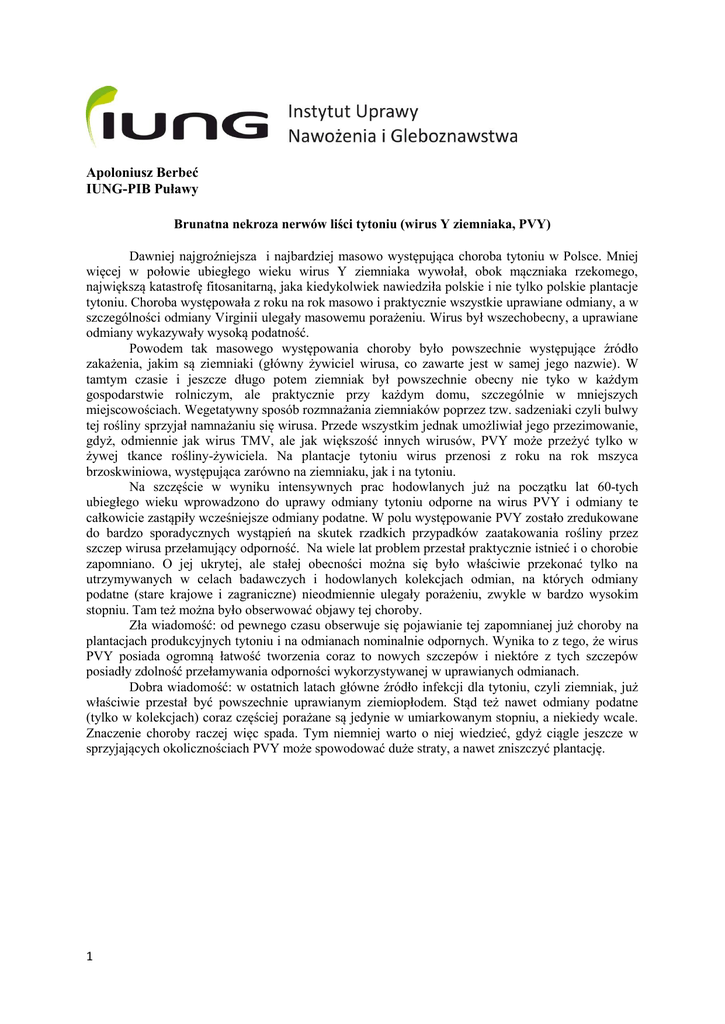Apoloniusz Berbeć IUNG-PIB Puławy Brunatna nekroza nerwów liści tytoniu (wirus Y ziemniaka, PVY) Dawniej najgroźniejsza i najbardziej masowo występująca choroba tytoniu w Polsce. Mniej więcej w połowie ubiegłego wieku wirus Y ziemniaka wywołał, obok mączniaka rzekomego, największą katastrofę fitosanitarną, jaka kiedykolwiek nawiedziła polskie i nie tylko polskie plantacje tytoniu. Choroba występowała z roku na rok masowo i praktycznie wszystkie uprawiane odmiany, a w szczególności odmiany Virginii ulegały masowemu porażeniu. Wirus był wszechobecny, a uprawiane odmiany wykazywały wysoką podatność. Powodem tak masowego występowania choroby było powszechnie występujące źródło zakażenia, jakim są ziemniaki (główny żywiciel wirusa, co zawarte jest w samej jego nazwie). W tamtym czasie i jeszcze długo potem ziemniak był powszechnie obecny nie tyko w każdym gospodarstwie rolniczym, ale praktycznie przy każdym domu, szczególnie w mniejszych miejscowościach. Wegetatywny sposób rozmnażania ziemniaków poprzez tzw. sadzeniaki czyli bulwy tej rośliny sprzyjał namnażaniu się wirusa. Przede wszystkim jednak umożliwiał jego przezimowanie, gdyż, odmiennie jak wirus TMV, ale jak większość innych wirusów, PVY może przeżyć tylko w żywej tkance rośliny-żywiciela. Na plantacje tytoniu wirus przenosi z roku na rok mszyca brzoskwiniowa, występująca zarówno na ziemniaku, jak i na tytoniu. Na szczęście w wyniku intensywnych prac hodowlanych już na początku lat 60-tych ubiegłego wieku wprowadzono do uprawy odmiany tytoniu odporne na wirus PVY i odmiany te całkowicie zastąpiły wcześniejsze odmiany podatne. W polu występowanie PVY zostało zredukowane do bardzo sporadycznych wystąpień na skutek rzadkich przypadków zaatakowania rośliny przez szczep wirusa przełamujący odporność. Na wiele lat problem przestał praktycznie istnieć i o chorobie zapomniano. O jej ukrytej, ale stałej obecności można się było właściwie przekonać tylko na utrzymywanych w celach badawczych i hodowlanych kolekcjach odmian, na których odmiany podatne (stare krajowe i zagraniczne) nieodmiennie ulegały porażeniu, zwykle w bardzo wysokim stopniu. Tam też można było obserwować objawy tej choroby. Zła wiadomość: od pewnego czasu obserwuje się pojawianie tej zapomnianej już choroby na plantacjach produkcyjnych tytoniu i na odmianach nominalnie odpornych. Wynika to z tego, że wirus PVY posiada ogromną łatwość tworzenia coraz to nowych szczepów i niektóre z tych szczepów posiadły zdolność przełamywania odporności wykorzystywanej w uprawianych odmianach. Dobra wiadomość: w ostatnich latach główne źródło infekcji dla tytoniu, czyli ziemniak, już właściwie przestał być powszechnie uprawianym ziemiopłodem. Stąd też nawet odmiany podatne (tylko w kolekcjach) coraz częściej porażane są jedynie w umiarkowanym stopniu, a niekiedy wcale. Znaczenie choroby raczej więc spada. Tym niemniej warto o niej wiedzieć, gdyż ciągle jeszcze w sprzyjających okolicznościach PVY może spowodować duże straty, a nawet zniszczyć plantację. 1 Objawy Objawy wywoływane przez wirus PVY mogą się różnić znacznie w zależności od odmiany, szczepu wirusa i innych okoliczności. W przypadku najbardziej groźnych tzw. szczepów nekrotycznych najbardziej charakterystyczne jest brązowienie nerwów liści widoczne przede wszystkim od dolnej strony liści. Jest to też najbardziej groźny przejaw tej choroby powodujący przedwczesne zżółknięcie i przejrzałość liścia i jego praktyczną nieprzydatność do zbioru. Charakterystyczne objawy brunatnej nekrozy nerwów na wywołanej przez wirus PVY na K326 – bardzo znanej odmianie pochodzenia amerykańskiego: Brunatnienie nerwów liściowych spowodowane przez nekrotyczny szczep wirusa PVY (szczególnie widoczne w początkowej fazie na dolnej stronie liścia): 2 Brunatnienie nerwów na górnej stronie liścia nie zawsze jest widoczne, ale liść porażony przez nekrotyczny szczep PVY żółknie i więdnie w charakterystyczny sposób: Bardzo częstym objawem zaatakowania rośliny jest występowanie jasnozielonych lub żółtawych (chlorotycznych) plam na liściu. Czasami plamy te występują razem z brązowieniem (nekrozą) nerwów liści, czasami występują jedynie chlorotyczne plamy. Niekiedy plamy te przybierają kształt pierścieni. Szczególnie te ostatnie nie są pewnym diagnostycznie objawem zakażenia przez wirus Y, gdyż plamy w kształcie pierścieni mogą też występować w przypadku zakażeń innymi wirusami. Innym nie charakterystycznym objawem niekiedy towarzyszącym zakażeniu przez wirus Y jest obecność małych, białych, cętkowatych plam (tzw. pstrzyca). Chlorotyczne plamy na liściu wywołane przez wirus PVY: 3 Niekiedy plamy wywołane przez wirus PVY przybierają kształt pierścieni: Brunatnieniu nerwów liści wywołanemu przez PVY mogą również towarzyszyć objawy mozaikowatości liścia, podobne do objawów mozaiki tytoniu: 4 Białe cętkowane plamy podobne do występujących u odmian wrażliwych na występowanie ozonu niekiedy towarzyszą również zakażeniu przez PVY: TN Roślina odmiany odpornej na PVY (Wiślica) porażona przez szczep wirusa (tzw. szczep grupy N ) przełamujący odporność dotychczas stosowaną w odmianach użytkowych: 5 Zwalczanie przenosiciela (wektora). Na tytoniu występuje mszyca brzoskwiniowa i ten gatunek jest wektorem brunatnej nekrozy nerwów. Mszyca brzoskwiniowa występuje w dwóch formach, zielonej i czerwonej, przy czym czerwona jest bardziej odporna na stosowanie środków chemicznych. Jak w przypadku każdej innej choroby wirusowej zwalczanie bezpośrednie czynnika chorobotwórczego przy pomocy środków chemicznych nie jest możliwe. Inaczej niż w przypadku wciornastka tytoniowca i choroby lubelskiej, zwalczanie owada-przenosiciela (wektora), jakim jest mszyca brzoskwiniowa również ma niewielką skuteczność. Wy
