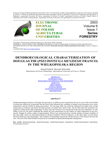 Electronic Journal of Polish Agricultural Universities is the very first Polish scientific journal published exclusively on the Internet, founded on January 1, 1998 by the following agricultural universities and higher schools of agriculture: University of Technology and Agriculture of Bydgoszcz, Agricultural University of Cracow, Agricultural University of Lublin, Agricultural University of Poznan, Higher School of Agriculture and Teacher Training Siedlce, Agricultural University of Szczecin, and Agricultural University of Wroclaw. ELECTRONIC JOURNAL OF POLISH AGRICULTURAL UNIVERSITIES 2003 Volume 6 Issue 1 Series FORESTRY Copyright © Wydawnictwo Akademii Rolniczej we Wroclawiu, ISSN 1505-0297 FELIKSIK E., WILCZYŃSKI S. 2003. DENDROECOLOGICAL CHARACTERIZATION OF DOUGLAS FIR (PSEUDOTSUGA MENZIESII FRANCO) IN THE WIELKOPOLSKA REGION Electronic Journal of Polish Agricultural Universities, Forestry, Volume 6, Issue 1. Available Online http://www.ejpau.media.pl DENDROECOLOGICAL CHARACTERIZATION OF DOUGLAS FIR (PSEUDOTSUGA MENZIESII FRANCO) IN THE WIELKOPOLSKA REGION Edward Feliksik, Sławomir Wilczyński Department of Forest Climatology, Agricultural University of Cracow, Poland ABSTRACT INTRODUCTION RESEARCH MATERIALS AND METHODS RESULTS DISCUSSION CONCLUSIONS ACKNOWLEDGEMENTS REFERENCES ABSTRACT Dendroclimatological analysis of Douglas firs growing in six different sites located from the east to west of the Great Poland Lowland area allowed us to determine that the factors that influenced the variability of annual wood increments were winter temperatures and the rainfall of spring and summer. The tree-ring width was positively influenced by higher than average temperatures in February and March and high amounts of rainfall from April to July. On the other hand, the increment was negatively influenced by high temperatures in May when the increment was formed and in the previous September. At sites further to the east, the more continental the climate the more pronounced was the impact of winter temperature on the treegrowth. Douglas fir within a radius of approximately 100 km were characterized by a similar rhythm of annual variability of tree-ring width, which was determined mainly by thermal conditions. Pluvial conditions, on the other hand, were the factor that diversified tree-ring chronologies. The similarity of chronologies decreased with the increase of the distance between the sites. The area of the Great Poland Lowland can be considered as dendrochronologically homogenous. Key words: dendroclimatology, dendrochronology, dendrochronological regionalism, dendroclimatological regionalism, Pseudotsuga menziesii INTRODUCTION Douglas fir, which was introduced to Poland, has gained a permanent place in the Polish forest. Dendroclimatological research on this species conducted so far indicates that it actively reacts to pluvial and thermal conditions of the local climate [6, 7, 8]. It also seems to be a good indicator of climatic differences between even small areas, particularly in the mountains [9, 11]. In the mountainous areas, the annual rhythm of increment variability reflects the changes of thermal and pluvial conditions which follow the changes of altitude [10, 12]. Considering the findings of research conducted so far, we decided to investigate the influence of the main climatic factors on wood formation of Douglas fir growing in the lowlands with a relatively small spatial diversification of thermal and pluvial conditions. We also aimed to determine the size of the area with a homogenous rhythm of increment variability of this species. In the future, this would enable us to create a dendroclimatological regionalization of Douglas fir growing in Poland. RESEARCH MATERIALS AND METHODS We took two samples from healthy, dominant trees selected from the six research stands containing Douglas firs in the area of The Great Lowland (Table 1, Fig. 1). The trees were cored by means of the Pressler bore at the height of 130 cm above the ground. The samples were used to measure the width of tree rings. We obtained two sequences of values known as dendroscales for each tree. Next, the dendroscales underwent the process of synchronization [14] and indexation [4]. We calculated the average tree-ring widths and average index values for 20 trees from each stand. In this manner we obtained chronologies of tree-ring widths and indexed chronologies representing the annual variability of the average increment for each research site (Fig. 2). Table 1. Characteristic of surfaces forest stands Forest District Division Compartment Site code Latitude (N) Longitude (E) Forest site type Soil Species composition Age of trees (years) Lubsko Jeziory Dolne 24i LBK 51º 53' 14º 44' Fresh mixed broadleaved forest Haplic Luvisol 4 Douglas fir, 4 oak, 2 beech 120 Nowa Sól Mirocin 176h NSL 51º 52' 15º 29' Fresh mixed broadleaved forest Albi-Distric Cambisol 4 Db, 3 Douglas fir, 2 Pine, 1 larche 90 Sława Śląska Stare Strącze 331l SLW 51º 54' 16º 05' Fresh broadleaved forest Haplic Cambisol 7 Douglas fir, 2 spruce, 1 oak 90 Kościan Olejnica 256h KSC 51º 57' 16º 17' Fresh mixed broadleaved forest Haplic Podzol 7 Douglas fir, 2 oak, 1 pine 100 Łopuchówko Wojnowo 169c LPC 52º 36' 17º 01' Fresh broadleaved forest Distric Cambisol 6 Douglas fir, 4 pine 105 Jarocin Cielcza 180a JRC 51º 55' 17º 24' Fresh mixed broadleaved forest Albic Luvisol 9 Douglas fir, 1 oak 100 Fig. 1. Map of Poland: location of the study sites (circles) and meteorological stations (squares) Fig. 2. Tree-ring chronologies of the six study sites: tree-ring widths (top) and tree-ring indices (bottom) The aim of indexation was to eliminate from the dendroscales the long-term variability caused by non-climatic factors that influenced the tree’s growth [13]. The indexes (Ii) were calculated according to the following formula: Ii = Ri / Yi where: Ri - is the width of the tree-ring in year i, Yi - is the value of the curve in the year i 