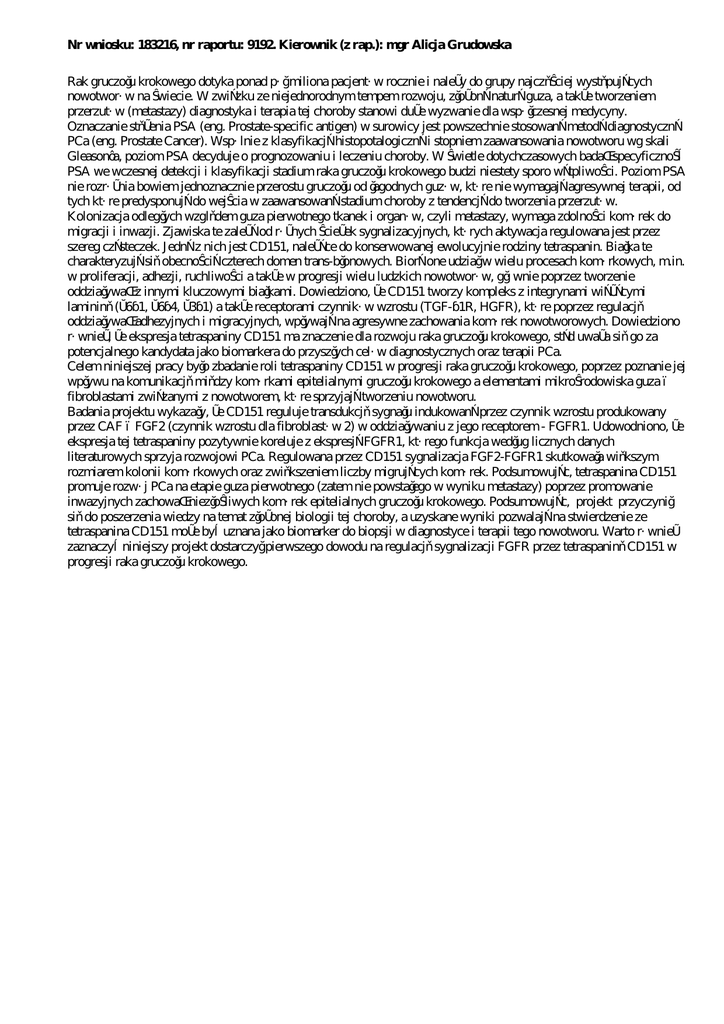 Nr wniosku: 183216, nr raportu: 9192. Kierownik (z rap.): mgr Alicja Grudowska Rak gruczołu krokowego dotyka ponad pół miliona pacjentów rocznie i należy do grupy najczęściej występujących nowotworów na świecie. W związku ze niejednorodnym tempem rozwoju, złożoną naturą guza, a także tworzeniem przerzutów (metastazy) diagnostyka i terapia tej choroby stanowi duże wyzwanie dla współczesnej medycyny. Oznaczanie stężenia PSA (eng. Prostate-specific antigen) w surowicy jest powszechnie stosowaną metodą diagnostyczną PCa (eng. Prostate Cancer). Wspólnie z klasyfikacją histopotalogiczną i stopniem zaawansowania nowotworu wg skali Gleason’a, poziom PSA decyduje o prognozowaniu i leczeniu choroby. W świetle dotychczasowych badań specyficzność PSA we wczesnej detekcji i klasyfikacji stadium raka gruczołu krokowego budzi niestety sporo wątpliwości. Poziom PSA nie rozróżnia bowiem jednoznacznie przerostu gruczołu od łagodnych guzów, które nie wymagają agresywnej terapii, od tych które predysponują do wejścia w zaawansowaną stadium choroby z tendencją do tworzenia przerzutów. Kolonizacja odległych względem guza pierwotnego tkanek i organów, czyli metastazy, wymaga zdolności komórek do migracji i inwazji. Zjawiska te zależą od różnych ścieżek sygnalizacyjnych, których aktywacja regulowana jest przez szereg cząsteczek. Jedną z nich jest CD151, należące do konserwowanej ewolucyjnie rodziny tetraspanin. Białka te charakteryzują się obecnością czterech domen trans-błonowych. Biorą one udział w wielu procesach komórkowych, m.in. w proliferacji, adhezji, ruchliwości a także w progresji wielu ludzkich nowotworów, głównie poprzez tworzenie oddziaływań z innymi kluczowymi białkami. Dowiedziono, że CD151 tworzy kompleks z integrynami wiążącymi lamininę (α6β1, α6β4, α3β1) a także receptorami czynników wzrostu (TGF-β1R, HGFR), które poprzez regulację oddziaływań adhezyjnych i migracyjnych, wpływają na agresywne zachowania komórek nowotworowych. Dowiedziono również, że ekspresja tetraspaniny CD151 ma znaczenie dla rozwoju raka gruczołu krokowego, stąd uważa się go za potencjalnego kandydata jako biomarkera do przyszłych celów diagnostycznych oraz terapii PCa. Celem niniejszej pracy było zbadanie roli tetraspaniny CD151 w progresji raka gruczołu krokowego, poprzez poznanie jej wpływu na komunikację między komórkami epitelialnymi gruczołu krokowego a elementami mikrośrodowiska guza – fibroblastami związanymi z nowotworem, które sprzyjają tworzeniu nowotworu. Badania projektu wykazały, że CD151 reguluje transdukcję sygnału indukowaną przez czynnik wzrostu produkowany przez CAF – FGF2 (czynnik wzrostu dla fibroblastów 2) w oddziaływaniu z jego receptorem - FGFR1. Udowodniono, że ekspresja tej tetraspaniny pozytywnie koreluje z ekspresją FGFR1, którego funkcja według licznych danych literaturowych sprzyja rozwojowi PCa. Regulowana przez CD151 sygnalizacja FGF2-FGFR1 skutkowała większym rozmiarem kolonii komórkowych oraz zwiększeniem liczby migrujących komórek. Podsumowując, tetraspanina CD151 promuje rozwój PCa na etapie guza pierwotnego (zatem nie powstałego w wyniku metastazy) poprzez promowanie inwazyjnych zachowań niezłośliwych komórek epitelialnych gruczołu krokowego. Podsumowując, projekt przyczynił się do poszerzenia wiedzy na temat złożonej biologii tej choroby, a uzyskane wyniki pozwalają na stwierdzenie ze tetraspanina CD151 może być uznana jako biomarker do biopsji w diagnostyce i terapii tego nowotworu. Warto również zaznaczyć niniejszy projekt dostarczył pierwszego dowodu na regulację sygnalizacji FGFR przez tetraspaninę CD151 w progresji raka gruczołu krokowego.