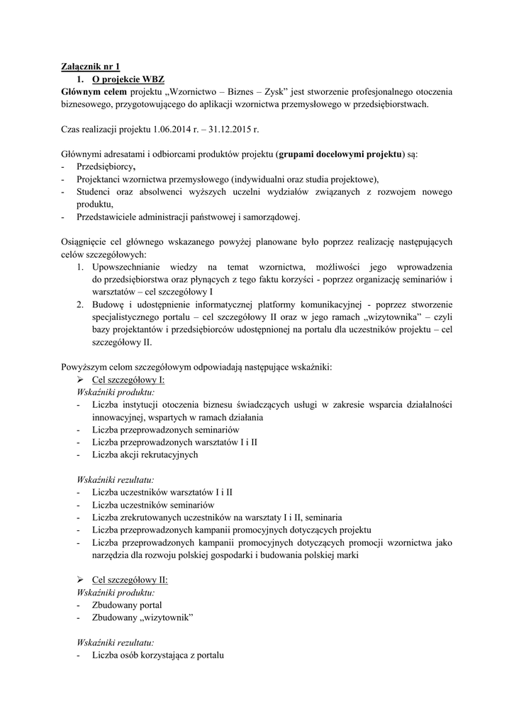 Załącznik nr 1 1. O projekcie WBZ Głównym celem projektu „Wzornictwo – Biznes – Zysk” jest stworzenie profesjonalnego otoczenia biznesowego, przygotowującego do aplikacji wzornictwa przemysłowego w przedsiębiorstwach. Czas realizacji projektu 1.06.2014 r. – 31.12.2015 r. Głównymi adresatami i odbiorcami produktów projektu (grupami docelowymi projektu) są: - Przedsiębiorcy, - Projektanci wzornictwa przemysłowego (indywidualni oraz studia projektowe), - Studenci oraz absolwenci wyższych uczelni wydziałów związanych z rozwojem nowego produktu, - Przedstawiciele administracji państwowej i samorządowej. Osiągnięcie cel głównego wskazanego powyżej planowane było poprzez realizację następujących celów szczegółowych: 1. Upowszechnianie wiedzy na temat wzornictwa, możliwości jego wprowadzenia do przedsiębiorstwa oraz płynących z tego faktu korzyści - poprzez organizację seminariów i warsztatów – cel szczegółowy I 2. Budowę i udostępnienie informatycznej platformy komunikacyjnej - poprzez stworzenie specjalistycznego portalu – cel szczegółowy II oraz w jego ramach „wizytownika” – czyli bazy projektantów i przedsiębiorców udostępnionej na portalu dla uczestników projektu – cel szczegółowy II. Powyższym celom szczegółowym odpowiadają następujące wskaźniki: Cel szczegółowy I: Wskaźniki produktu: - Liczba instytucji otoczenia biznesu świadczących usługi w zakresie wsparcia działalności innowacyjnej, wspartych w ramach działania - Liczba przeprowadzonych seminariów - Liczba przeprowadzonych warsztatów I i II - Liczba akcji rekrutacyjnych Wskaźniki rezultatu: - Liczba uczestników warsztatów I i II - Liczba uczestników seminariów - Liczba zrekrutowanych uczestników na warsztaty I i II, seminaria - Liczba przeprowadzonych kampanii promocyjnych dotyczących projektu - Liczba przeprowadzonych kampanii promocyjnych dotyczących promocji wzornictwa jako narzędzia dla rozwoju polskiej gospodarki i budowania polskiej marki Cel szczegółowy II: Wskaźniki produktu: - Zbudowany portal - Zbudowany „wizytownik” Wskaźniki rezultatu: - Liczba osób korzystająca z portalu - Liczba powstałych profili na „wizytowniku”. 2. Cele audytu merytorycznego Audyt zostanie prowadzony w celu weryfikacji skuteczności realizacji działań przewidzianych w projekcie „Wzornictwo- Biznes- Zysk” (dalej WBZ) w kontekście określonych celów i rezultatów i odpowiadających im wskaźników. Audyt merytoryczny dla projektu jest audytem zewnętrznym. 3. Zakres audytu merytorycznego: Badaniem zostaną objęte grupy docelowe projektu WBZ. Audyt merytoryczny obejmie następujące obszary: 1) analiza realizacji celów projektu oraz osiągnięcia wskaźników, 2) analiza i ocena działań realizowanych w projekcie w kontekście potrzeb edukacyjnych projektantów wzornictwa (zarówno z doświadczeniem zawodowym jak i studentów kierunków projektowych), 3) analiza i ocena efektywności generowania potrzeby współpracy oraz inicjowania współpracy między projektantami a przedsiębiorcami poprzez działania projektu. Szczególny nacisk zostanie położony na efektywność zaplanowanych i realizowanych w ramach projektu działań. Audyt merytoryczny projektu będzie dotyczył następujących elementów projektu: 1) warsztaty 2) warsztaty z ekspozycją studiów przypadków 3) seminaria 4) portal Audyt zostanie zrealizowany w oparciu o analizę danych zastanych. 4. Usługa obejmuje: 4.1. Realizację badania: 9 listopada - 26 listopada 2015 r. 4.2. Opracowanie raportu, który składać się będzie min. z następujących części: a) podsumowanie b) opis przedmiotu celu audytu c) streszczenie najważniejszych wniosków i rekomendacji d) prezentacja najważniejszych wyników audytu e) odpowiedzi na pytania audytu, wskazane w pkt. 5 f) wnioski i rekomendacje ze wskazaniem proponowanych działań oraz przypisanych im adresatów. g) sformułowanie rekomendacji dotyczących ewentualnej kontynuacji wybranych elementów projektu. h) zgromadzony materiał badawczy (w formie załączników), w tym m.in. kwestionariusze, listy osób, lista dokumentów wykorzystanych w analizie. Raport końcowy powinien być opracowany w języku polskim, nie powinien zawierać więcej niż 50 stron A4 (bez załączników). Ostateczny kształt raportu zostanie ustalony pomiędzy Zamawiającym i Wykonawcą. 4.3. Wykonawca przekaże Zamawiającemu raport końcowy w formie pisemnej i elektronicznej do dnia 26 listopada 2015 r. Wykonawca przygotuje również prezentację na temat wyników audytu w formacie Power Point, którą przedstawi na spotkaniu w siedzibie zamawiającego między 27 listopada – 2 grudnia 2015 r. (IWP zastrzega sobie prawo zmiany terminu spotkania).