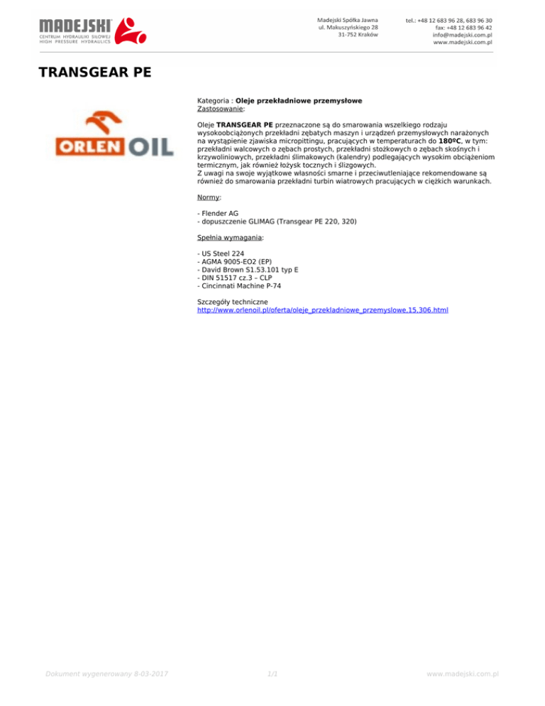 TRANSGEAR PE Kategoria : Oleje przekładniowe przemysłowe Zastosowanie: Oleje TRANSGEAR PE przeznaczone są do smarowania wszelkiego rodzaju wysokoobciążonych przekładni zębatych maszyn i urządzeń przemysłowych narażonych na wystąpienie zjawiska micropittingu, pracujących w temperaturach do 180ºC, w tym: przekładni walcowych o zębach prostych, przekładni stożkowych o zębach skośnych i krzywoliniowych, przekładni ślimakowych (kalendry) podlegających wysokim obciążeniom termicznym, jak również łożysk tocznych i ślizgowych. Z uwagi na swoje wyjątkowe własności smarne i przeciwutleniające rekomendowane są również do smarowania przekładni turbin wiatrowych pracujących w ciężkich warunkach. Normy: - Flender AG - dopuszczenie GLIMAG (Transgear PE 220, 320) Spełnia wymagania: - US Steel 224 - AGMA 9005-EO2 (EP) - David Brown S1.53.101 typ E - DIN 51517 cz.3 – CLP - Cincinnati Machine P-74 Szczegóły techniczne http://www.orlenoil.pl/oferta/oleje_przekladniowe_przemyslowe,15,306.html Dokument wygenerowany 8-03-2017 1/1 www.madejski.com.pl