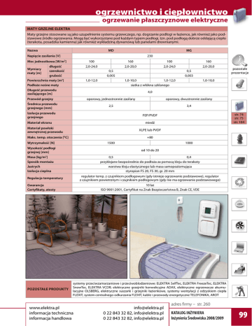 ogrzewnictwo i ciepłownictwo ogrzewanie płaszczyznowe elektryczne MATY GRZEJNE ELEKTRA Maty grzejne stosowane są jako uzupełnienie systemu grzewczego, np. dogrzanie podłogi w łazience, jak również jako podstawowe źródło ogrzewania. Mogą być wykorzystane pod każdym typem podłogi, tzn. pod podłogą dobrze oddającą ciepło (terakota, posadzka kamienna) jak również wykładziną dywanową lub panelami drewnianymi. Nazwa MD MG Napięcie zasilania [V] 230 Moc jednostkowa [W/m2] 100 160 100 160 długość Wymiary szerokość maty [m] grubość Powierzchnia maty [m2] Podłoże nośne maty 2,0-24,0 2,0-20,0 2,0-24,0 2,0-20,0 0,5 0,005 1,0-12,0 0,5 0,003 1,0-10,0 1,0-12,0 siatka z włókna szklanego Długość przewodu zasilającego [m] 1,0-10,0 4,0 Przewód grzejny Średnica przewodu grzejnego [mm] oporowy, jednostronnie zasilany oporowy, dwustronnie zasilany 2,5 3,4 Izolacja przewodu grzejnego str. 74 str. 75 str. 104 FEP/PVDF Materiał ekranu miedź Materiał powłoki zewnętrznej przewodu XLPE lub PVDF Maks. temp. otoczenia [OC] +80 Wytrzymałość [N] 1500 1000 Wysokość podłogi grzejnej [mm] od 10 do 20 Masa [kg/m2] Sposób montażu Jastrych Izolacja cieplna 0,5 0,4 przyklejane bezpośrednio do podłoża za pomocą kleju do terakoty warstwa kleju elastycznego lub masa samopoziomująca styropian FS 20, FS 30, gr. 20 mm regulator temp. z czujnikiem podłogowym (gdy istnieje ogrzewanie podstawowe), regulator z czujnikiem powietrznym i czujnikiem podłogowym (gdy nie ma ogrzewanie podstawowego) Regulacja temperatury Gwarancja Certyfikaty, atesty POZOSTAŁE PRODUKTY pozostałe prezentacje 10 lat ISO 9001:2001, Certyfikat na Znak Bezpieczeństwa B, Znak CE, VDE systemy przeciwzamarzaniowe i przeciwoblodzeniowe: ELEKTRA SelfTec, ELEKTRA FreezeTec, ELEKTRA SnowTec, ELEKTRA VCDR; elektryczne grzejniki konwekcyjne ADAX, elektryczne ogrzewacze akumulacyjne OLSBERG, elektryczne suszarki i grzejniki łazienkowe, systemy wentylacji z odzyskiem ciepła FLEXIT, system centralnego odkurzania FLEXIT, kable i przewody energetyczne TELEFONIKA, AROT www.elektra.pl informacja techniczna informacja handlowa [email protected] 0 22 843 32 82, [email protected] 0 22 843 32 82, [email protected] adres firmy – str. 260 Katalog Inżyniera Inżynieria Środowiska 2008/2009 99