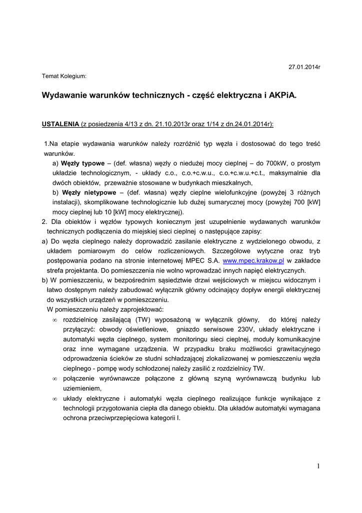 27.01.2014r Temat Kolegium: Wydawanie warunków technicznych - część elektryczna i AKPiA. USTALENIA (z posiedzenia 4/13 z dn. 21.10.2013r oraz 1/14 z dn.24.01.2014r): 1.Na etapie wydawania warunków należy rozróżnić typ węzła i dostosować do tego treść warunków. a) Węzły typowe – (def. własna) węzły o niedużej mocy cieplnej – do 700kW, o prostym układzie technologicznym, - układy c.o., c.o.+c.w.u., c.o.+c.w.u.+c.t., maksymalnie dla dwóch obiektów, przeważnie stosowane w budynkach mieszkalnych, b) Węzły nietypowe – (def. własna) węzły cieplne wielofunkcyjne (powyżej 3 różnych instalacji), skomplikowane technologicznie lub dużej sumarycznej mocy (powyżej 700 [kW] mocy cieplnej lub 10 [kW] mocy elektrycznej). 2. Dla obiektów i węzłów typowych koniecznym jest uzupełnienie wydawanych warunków technicznych podłączenia do miejskiej sieci cieplnej o następujące zapisy: a) Do węzła cieplnego należy doprowadzić zasilanie elektryczne z wydzielonego obwodu, z układem pomiarowym do celów rozliczeniowych. Szczegółowe wytyczne oraz tryb postępowania podano na stronie internetowej MPEC S.A. www.mpec.krakow.pl w zakładce strefa projektanta. Do pomieszczenia nie wolno wprowadzać innych napięć elektrycznych. b) W pomieszczeniu, w bezpośrednim sąsiedztwie drzwi wejściowych w miejscu widocznym i łatwo dostępnym należy zabudować wyłącznik główny odcinający dopływ energii elektrycznej do wszystkich urządzeń w pomieszczeniu. W pomieszczeniu należy zaprojektować: • rozdzielnicę zasilającą (TW) wyposażoną w wyłącznik główny, do której należy przyłączyć: obwody oświetleniowe, gniazdo serwisowe 230V, układy elektryczne i automatyki węzła cieplnego, system monitoringu sieci cieplnej, moduły komunikacyjne oraz inne wymagane urządzenia. W przypadku braku możliwości grawitacyjnego odprowadzenia ścieków ze studni schładzającej zlokalizowanej w pomieszczeniu węzła cieplnego - pompę wody schłodzonej należy zasilić z rozdzielnicy TW. • połączenie wyrównawcze połączone z główną szyną wyrównawczą budynku lub uziemieniem, • układy elektryczne i automatyki węzła cieplnego realizujące funkcje wynikające z technologii przygotowania ciepła dla danego obiektu. Dla układów automatyki wymagana ochrona przeciwprzepięciowa kategorii I. 1 c) W pomieszczeniu nie należy instalować urządzeń nie dotyczących MPEC S.A. (w tym: zestaw hydroforowy, zestaw przyłączeniowo-rozliczeniowy wody z MPWiK, teletechnika, telewizja kablowa, internet). d) Szczegółowe wytyczne projektowe wraz z przykładowymi schematami elektrycznymi należy umieścić na stronie internetowej www.mpec.krakow.pl . 3. Dla obiektów nietypowych [instalacje wielofunkcyjne (powyżej 3 rodzajów), nietypowe, skomplikowane technologicznie lub o dużej sumarycznej mocy (powyżej 700 kW mocy cieplnej lub 10 kW mocy elektrycznej)] należy wydać indywidualne warunki przygotowane przy współpracy z właściwymi służbami MPEC S.A. w Krakowie. W warunkach należy określić rodzaj stosowanej automatyki, zakres oraz warunki techniczne i organizacyjne dostępu do zasobów sterownika, a także dodatkowe wymagania – na przykład zapewnienie dostępu do sieci Internet w celu wizualizacji parametrów pracy w MPEC S.A. Zaleca się, aby warunki indywidualne były wydawane na podstawie schematu technologicznego danego węzła. 4. Na stronie internetowej MPEC S.A www.mpec.krakow.pl należy umieścić wytyczne projektowe i realizacyjne dotyczące zasilania i opomiarowania zużywanej energii elektrycznej dla węzłów mających stanowić własność MPEC S.A., w szczególności należy uwzględnić: 4.1. Zasilanie węzła w nowobudowanym lub remontowanym budynku. Właściciel w ramach realizowanej inwestycji w zakresie instalacji elektrycznych wewnętrznych występując do lokalnego dostawcy energii elektrycznej (TAURON Dystrybucja SA) o warunki przyłączenia dla budynku wyszczególnia zasilanie węzła cieplnego zaznaczając, że będzie on własnością MPEC S.A. w Krakowie. Uzyskane Warunki przyłączenia są podstawą do projektowania zasilania węzła cieplnego. Dalszy tryb postępowania zależy od decyzji Właściciela: • Właściciel podpisuje umowę przyłączeniową z dostawcą energii elektrycznej i po uzyskaniu dokumentu IMZU (Informacja o możliwości zawarcia umowy) przekazuje go do MPEC.S.A. w Krakowie w celu podpisania umowy sprzedaży. • Właściciel podpisuje umowę przyłączeniową, uzyskuje IMZU i podpisuje umowę sprzedaży na siebie. Po uruchomieniu zasilania, protokołem zdawczo-odbiorczym przenosi zobowiązanie na MPEC S.A. w Krakowie. 4.2. Zasilanie węzła w budynku istniejącym, zarządzanym przez podmiot gospodarczy (Wspólnota Mieszkańców, Spółdzielnia Mieszkaniowa, osoby prywatne, prowadzące działalność gospodarczą związaną z danym budynkiem itp.) w sytuacji, gdy MPEC SA nie posiada tytułu prawnego do pomieszczenia węzła (budynki podłączane do sieci ciepłowniczej, lub istniejący węzeł stanowiący własność podmiotu zarządzającego). Zarządzający występuje do lokalnego dostawcy energii elektrycznej (TAURON Dystrybucja SA) (wypełnienie druku: Wniosek WP Tauron.pdf) o Warunki przyłączenia dla węzła cieplnego, zaznaczając, że będzie on własnością MPEC S.A. w Krakowie. Uzyskane Warunki są podstawą 2 do projektowania zasilania węzła cieplnego. Po wykonaniu zasilania Zarządzający podpisuje umowę przyłączeniową na dostawę energii elektrycznej, a po uzyskaniu dokumentu IMZU (Informacja o możliwości zawarcia umowy) przekazuje go do MPEC S.A. w celu podpisania umowy sprzedaży. 4.3. Zasilanie węzła w budynku istniejącym, w sytuacji, gdy MPEC S.A. posiada tytuł prawny do pomieszczenia węzła (modernizacja istniejącego węzła). Przed przystąpieniem do prac projektowych jednostka projektowa zwraca się do MPEC S.A. w Krakowie z prośbą o pozyskanie warunków przyłącze