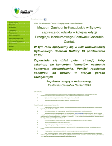 Strona główna / Aktualność Strona główna Aktywnie 12.09.2013 Cassubia Cantat - Przegląd Konkursowy Festiwalu Muzeum Zachodnio-Kaszubskie w Bytowie zaprasza do udziału w kolejnej edycji Przeglądu Konkursowego Festiwalu Cassubia Cantat. Kulturowo Tajemniczo Przyrodniczo Baza noclegowa Baza gastronomiczna Informacja Turystyczna Do pobrania Kontakt Mapa W tym roku spotykamy się w Sali widowiskowej Bytowskiego Centrum Kultury 19 października 2013 r. Zapowiada się dzień pełen atrakcji, który zakończy się koncertem laureatów, następnie koncertem niespodzianką. Poniżej regulamin konkursu, do udziału w którym gorąco zachęcamy!!! Regulamin przeglądu konkursowego Festiwalu Cassubia Cantat 2013 Cele konkursu: 1. Rewitalizacja kaszubskich pieśni ze zbiorów fonograficznych Instytutu Sztuki Polskiej Akademii Nauk opublikowanych przez Muzeum Zachodniokaszubskie w Bytowie na płycie Cassubia Incognita 2. Upowszechnienie zapomnianych pieśni ludowych z terenu Kaszub 3. Wzbogacenie repertuaru kaszubskich zespołów folklorystycznych Warunki i zasady uczestnictwa w Konkursie: 1. Organizatorem Konkursu są: Muzeum Zachodniokaszubskie w Bytowie, Zrzeszenie Kaszubsko – Pomorskie o. Bytów, Bytowskie Centrum Kultury 2. Na konkurs zgłaszać się mogą zespoły i kapele folklorystyczne grające muzykę kaszubską 3. Warunkiem uczestnictwa w Konkursie jest przygotowanie min. 3 utworów opublikowanych na płycie Cassubia Incognita oraz wypełnienie i przesłanie do organizatorów karty zgłoszenia uczestnictwa do dnia 14 października 2013 r. na adres: Muzeum Zachodniokaszubskie w Bytowie, ul. Zamkowa 2, 77-100 Bytów (z dopiskiem „Konkurs Cassubia Cantat”) lub drogą meblową: [email protected] 4. Prawo do zgłoszenia uczestnictwa mają instytucje patronujące zespołom lub same zespoły 5. Zespoły przyjeżdżają na Konkurs na własny koszt 6. Organizatorzy zapewniają uczestnikom ciepły posiłek 7. Przesłuchania konkursowe odbędą się 19 października 2013 roku w sali widowiskowej Bytowskiego Centrum Kultury 8. O szczegółach organizatorzy powiadomią uczestników po otrzymaniu kart zgłoszeń 9. Płytę Cassubia Incognita można pobrać ze strony internetowej Muzeum Zachodniokaszubskiego w Bytowie w zakładce wydarzenia : http://www.muzeumbytow.pl/wydarzenia/cassubia-cantat/ lub ze strony Skarbnicy Kaszubskiej: www.skarbnicakaszubska.pl/nagrania-audio/cassubia-incognita Nagrody: 1. Oceny prezentacji dokona powołane przez organizatorów Jury 2. Najlepsze propozycje muzyczne zostaną nagrodzone finansowo 3. O podziale puli nagród decyduje Jury Ogłoszenie wyników: 1. Wyniki przesłuchań, wraz z wręczeniem nagród, ogłoszone zostaną w dniu konkursu w późnych godzinach popołudniowych Dodatkowe informacje pod numerem telefonu 600 44 89 83 lub e-mail: jaromir(na)muzeumbytow.pl regulamin karta zgłoszenia wróć