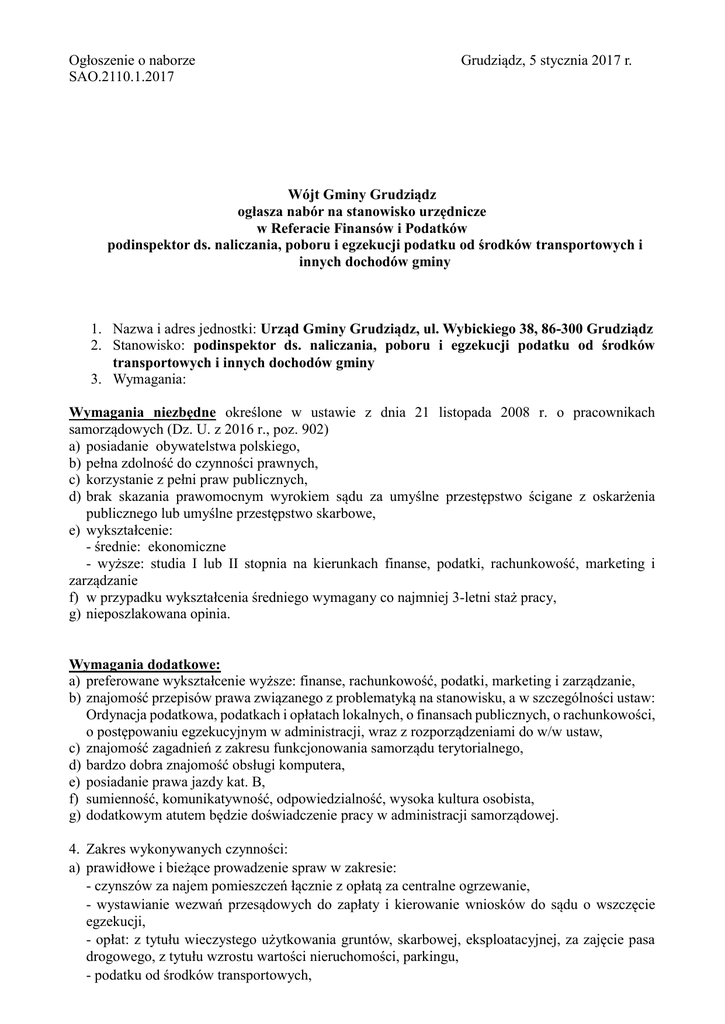 Ogłoszenie o naborze SAO.2110.1.2017 Grudziądz, 5 stycznia 2017 r. Wójt Gminy Grudziądz ogłasza nabór na stanowisko urzędnicze w Referacie Finansów i Podatków podinspektor ds. naliczania, poboru i egzekucji podatku od środków transportowych i innych dochodów gminy 1. Nazwa i adres jednostki: Urząd Gminy Grudziądz, ul. Wybickiego 38, 86-300 Grudziądz 2. Stanowisko: podinspektor ds. naliczania, poboru i egzekucji podatku od środków transportowych i innych dochodów gminy 3. Wymagania: Wymagania niezbędne określone w ustawie z dnia 21 listopada 2008 r. o pracownikach samorządowych (Dz. U. z 2016 r., poz. 902) a) posiadanie obywatelstwa polskiego, b) pełna zdolność do czynności prawnych, c) korzystanie z pełni praw publicznych, d) brak skazania prawomocnym wyrokiem sądu za umyślne przestępstwo ścigane z oskarżenia publicznego lub umyślne przestępstwo skarbowe, e) wykształcenie: - średnie: ekonomiczne - wyższe: studia I lub II stopnia na kierunkach finanse, podatki, rachunkowość, marketing i zarządzanie f) w przypadku wykształcenia średniego wymagany co najmniej 3-letni staż pracy, g) nieposzlakowana opinia. Wymagania dodatkowe: a) preferowane wykształcenie wyższe: finanse, rachunkowość, podatki, marketing i zarządzanie, b) znajomość przepisów prawa związanego z problematyką na stanowisku, a w szczególności ustaw: Ordynacja podatkowa, podatkach i opłatach lokalnych, o finansach publicznych, o rachunkowości, o postępowaniu egzekucyjnym w administracji, wraz z rozporządzeniami do w/w ustaw, c) znajomość zagadnień z zakresu funkcjonowania samorządu terytorialnego, d) bardzo dobra znajomość obsługi komputera, e) posiadanie prawa jazdy kat. B, f) sumienność, komunikatywność, odpowiedzialność, wysoka kultura osobista, g) dodatkowym atutem będzie doświadczenie pracy w administracji samorządowej. 4. Zakres wykonywanych czynności: a) prawidłowe i bieżące prowadzenie spraw w zakresie: - czynszów za najem pomieszczeń łącznie z opłatą za centralne ogrzewanie, - wystawianie wezwań przesądowych do zapłaty i kierowanie wniosków do sądu o wszczęcie egzekucji, - opłat: z tytułu wieczystego użytkowania gruntów, skarbowej, eksploatacyjnej, za zajęcie pasa drogowego, z tytułu wzrostu wartości nieruchomości, parkingu, - podatku od środków transportowych, b) c) d) e) f) g) h) i) - naliczanie podatku VAT z tytułu prowadzonych opłat i wystawianie deklaracji VAT-7 do Urzędu Skarbowego. terminowe wystawianie na figurujące zaległości upomnień i tytułów wykonawczych, kierowanie ich na drogę egzekucji administracyjnej oraz współdziałanie z urzędem skarbowym w zakresie likwidacji zaległości, wystawianie na wniosek zainteresowanego w przypadkach przewidzianych przez prawo informacji z zakresu działania stanowiska, prawidłowe ustalanie i pobieranie dodatku za zwłokę od kwot wpłaconych po terminie płatności, systematyczne śledzenie terminowego płacenia należności, terminowe i rzetelne sporządzanie sprawozdań rachunkowych oraz wystawianie zaświadczeń o udzielonej pomocy publicznej przedsiębiorcom (tytułu umorzenia podatku) oraz sporządzanie miesięcznych sprawozdań do RIO o udzielonej pomocy de minimis w rolnictwie, prowadzenie rejestru podań o odroczenie i umorzenie w zakresie wszelkich podatków i opłat z terenu gminy, przygotowywanie ich do decyzji Wójta oraz dostarczenie decyzji wnioskodawcom, przygotowywanie projektów uchwał w zakresie podatku od środków transportowych mających charakter cywilnoprawny, prowadzenia gospodarki kasowej Urzędu Gminy Grudziądz. 5. Warunki pracy na stanowisku: a) praca siedząca, przy komputerze, w budynku Urzędu Gminy Grudziądz i poza nim, wyjścia służbowe według potrzeb, b) miejsce pracy znajduje się w pokoju na I piętrze, w budynku nie przystosowanym dla osób niepełnosprawnych, c) budynek Urzędu nie jest wyposażony w windy, Wskaźnik zatrudnienia osób niepełnosprawnych : mniej niż 6 %. 6. Wymagane dokumenty: a) CV, b) list motywacyjny, c) oświadczenie „Wyrażam zgodę na przetwarzanie danych osobowych dla potrzeb niezbędnych do realizacji procesu rekrutacji na stanowisko „podinspektor” zgodnie z ustawą z dnia 29 sierpnia 1997 r. o ochronie danych osobowych (Dz. U. z 2016 poz. 922).”, d) kserokopie dokumentów potwierdzających wykształcenie i dodatkowe kwalifikacje zawodowe (oryginały do wglądu), e) kserokopie dokumentów potwierdzających doświadczenie w administracji (świadectwa pracy lub zaświadczenia o zatrudnieniu-oryginały do wglądu) f) oświadczenie, że kandydat ma pełną zdolność do czynności prawnych oraz korzysta z pełni praw publicznych, g) oświadczenie, że kandydat nie był skazany prawomocnym wyrokiem sądu za umyślne przestępstwo ścigane z oskarżenia publicznego lub umyślne przestępstwo skarbowe, h) wypełniony kwestionariusz osobowy osoby ubiegającej się o zatrudnienie zgodny ze wzorem zamieszczonym w załączniku nr 1 Rozporządzenia Ministra Pracy i Polityki Społecznej z dnia 28 maja 1996r. w sprawie zakresu prowadzenia przez pracodawców dokumentacji w sprawach związanych ze stosunkiem pracy oraz sposobu prowadzenia akt osobowych pracownika (Dz. U. Nr 62, poz. 286 z późn zm.), i) kandydat, który zamierza skorzystać z uprawnienia o których mowa w art. 13a ust. 2 ustawy o pracownikach samorządowych jest zobowiązany do złożenia wraz z dokumentami kopii dokumentów potwierdzającego niepełnosprawność, 7. Termin i miejsce składania dokumentów Wymagane dokumenty należy składać w terminie do 16 stycznia 2017 roku do godz. 1500 z podanym telefonem kontaktowym w Biurze Obsługi Interesanta Urzędu Gminy Grudziądz, ul. Wybickiego 38, 86-300 Grudziądz w zamkniętych kopertach z dopiskiem „Nabór na stanowisko podinspektor”. Dokumenty, które wpłyną do Urzędu Gminy Grudziądz po danym terminie oraz dokumenty niekompletne nie będą rozpatrywane. Informacja o wyniku n