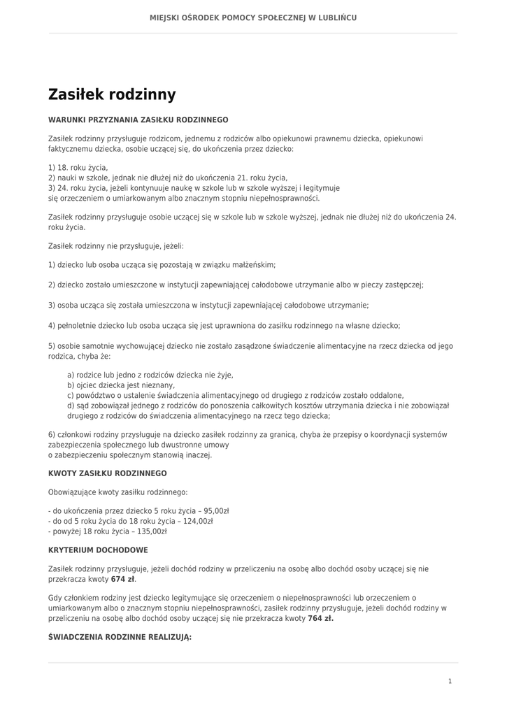 MIEJSKI OŚRODEK POMOCY SPOŁECZNEJ W LUBLIŃCU Zasiłek rodzinny WARUNKI PRZYZNANIA ZASIŁKU RODZINNEGO Zasiłek rodzinny przysługuje rodzicom, jednemu z rodziców albo opiekunowi prawnemu dziecka, opiekunowi faktycznemu dziecka, osobie uczącej się, do ukończenia przez dziecko: 1) 18. roku życia, 2) nauki w szkole, jednak nie dłużej niż do ukończenia 21. roku życia, 3) 24. roku życia, jeżeli kontynuuje naukę w szkole lub w szkole wyższej i legitymuje się orzeczeniem o umiarkowanym albo znacznym stopniu niepełnosprawności. Zasiłek rodzinny przysługuje osobie uczącej się w szkole lub w szkole wyższej, jednak nie dłużej niż do ukończenia 24. roku życia. Zasiłek rodzinny nie przysługuje, jeżeli: 1) dziecko lub osoba ucząca się pozostają w związku małżeńskim; 2) dziecko zostało umieszczone w instytucji zapewniającej całodobowe utrzymanie albo w pieczy zastępczej; 3) osoba ucząca się została umieszczona w instytucji zapewniającej całodobowe utrzymanie; 4) pełnoletnie dziecko lub osoba ucząca się jest uprawniona do zasiłku rodzinnego na własne dziecko; 5) osobie samotnie wychowującej dziecko nie zostało zasądzone świadczenie alimentacyjne na rzecz dziecka od jego rodzica, chyba że: a) rodzice lub jedno z rodziców dziecka nie żyje, b) ojciec dziecka jest nieznany, c) powództwo o ustalenie świadczenia alimentacyjnego od drugiego z rodziców zostało oddalone, d) sąd zobowiązał jednego z rodziców do ponoszenia całkowitych kosztów utrzymania dziecka i nie zobowiązał drugiego z rodziców do świadczenia alimentacyjnego na rzecz tego dziecka; 6) członkowi rodziny przysługuje na dziecko zasiłek rodzinny za granicą, chyba że przepisy o koordynacji systemów zabezpieczenia społecznego lub dwustronne umowy o zabezpieczeniu społecznym stanowią inaczej. KWOTY ZASIŁKU RODZINNEGO Obowiązujące kwoty zasiłku rodzinnego: - do ukończenia przez dziecko 5 roku życia – 95,00zł - do od 5 roku życia do 18 roku życia – 124,00zł - powyżej 18 roku życia – 135,00zł KRYTERIUM DOCHODOWE Zasiłek rodzinny przysługuje, jeżeli dochód rodziny w przeliczeniu na osobę albo dochód osoby uczącej się nie przekracza kwoty 674 zł. Gdy członkiem rodziny jest dziecko legitymujące się orzeczeniem o niepełnosprawności lub orzeczeniem o umiarkowanym albo o znacznym stopniu niepełnosprawności, zasiłek rodzinny przysługuje, jeżeli dochód rodziny w przeliczeniu na osobę albo dochód osoby uczącej się nie przekracza kwoty 764 zł. ŚWIADCZENIA RODZINNE REALIZUJĄ: 1 MIEJSKI OŚRODEK POMOCY SPOŁECZNEJ W LUBLIŃCU 1. organ właściwy (tj. wójt, burmistrz, prezydent miasta właściwy ze względu na miejsce zamieszkania osoby ubiegającej się o świadczenia rodzinne); 2. marszałek województwa w zakresie koordynacji systemów zabezpieczenia społecznego. W Lublińcu realizacją świadczeń rodzinnych zajmuje się Miejski Ośrodek Pomocy Społecznej, ul. Oświęcimska 30. 2