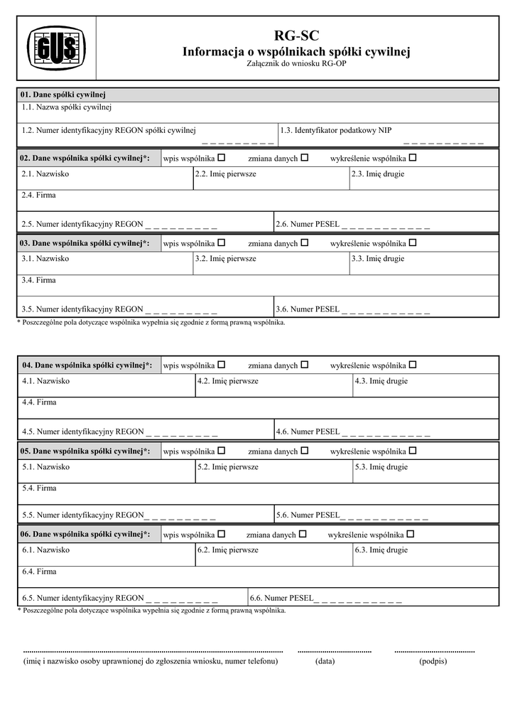 RG-SC Informacja o wspólnikach spółki cywilnej Załącznik do wniosku RG-OP 01. Dane spółki cywilnej 1.1. Nazwa spółki cywilnej 1.2. Numer identyfikacyjny REGON spółki cywilnej _________ wpis wspólnika 02. Dane wspólnika spółki cywilnej*: 2.1. Nazwisko 1.3. Identyfikator podatkowy NIP zmiana danych __________ wykreślenie wspólnika 2.2. Imię pierwsze 2.3. Imię drugie 2.4. Firma 2.5. Numer identyfikacyjny REGON _ ________ wpis wspólnika 03. Dane wspólnika spółki cywilnej*: 3.1. Nazwisko 2.6. Numer PESEL _ zmiana danych __________ wykreślenie wspólnika 3.2. Imię pierwsze 3.3. Imię drugie 3.4. Firma 3.5. Numer identyfikacyjny REGON _ ________ 3.6. Numer PESEL _ __________ * Poszczególne pola dotyczące wspólnika wypełnia się zgodnie z formą prawną wspólnika. 04. Dane wspólnika spółki cywilnej*: 4.1. Nazwisko wpis wspólnika zmiana danych wykreślenie wspólnika 4.2. Imię pierwsze 4.3. Imię drugie 4.4. Firma 4.5. Numer identyfikacyjny REGON _ 05. Dane wspólnika spółki cywilnej*: 5.1. Nazwisko ________ wpis wspólnika 4.6. Numer PESEL _ zmiana danych __________ wykreślenie wspólnika 5.2. Imię pierwsze 5.3. Imię drugie 5.4. Firma 5.5. Numer identyfikacyjny REGON_ 06. Dane wspólnika spółki cywilnej*: 6.1. Nazwisko ________ wpis wspólnika 5.6. Numer PESEL_ zmiana danych 6.2. Imię pierwsze __________ wykreślenie wspólnika 6.3. Imię drugie 6.4. Firma 6.5. Numer identyfikacyjny REGON _ ________ 6.6. Numer PESEL_ __________ * Poszczególne pola dotyczące wspólnika wypełnia się zgodnie z formą prawną wspólnika. .............................................................................................................................. (imię i nazwisko osoby uprawnionej do zgłoszenia wniosku, numer telefonu) .................................... (data) ....................................... (podpis)