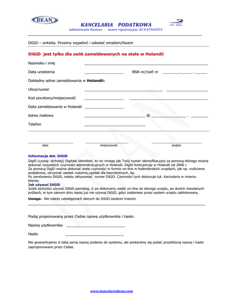 KANCELARIA PODATKOWA Administratie Kantoor - numer rejestracyjny: ES X.4794229.V _________________________________________________________________________________________________________________ DiGiD – ankieta. Prosimy wypełnić i odesłać emailem/faxem DiGiD jest tylko dla osób zameldowanych na stałe w Holandii Nazwisko i imię _________________________________________________________ Data urodzenia __________________ BSN nr//sofi nr ________._____. ______ Dokładny adres zameldowania w Holandii: Ulica/numer ____________________________________ ___________________ Kod pocztowy/miejscowość __________________ ____________________________________ Data zameldowania w Holandii __________________ Adres mailowy ____________________________ @ ________________ . ________ Telefon ____________________________ __________________________ data _________________________ miejscowość _____________________________ podpis Informacje dot. DiGiD DigiD (czytaj: dichidej) Digitale Identiteit, to nic innego jak Twój numer identyfikacyjny za pomocą którego można dokonać wszystkich czynności administracyjnych w Holandii. DigiD funkcjonuje w Holandii od 2006 r. Za pomocą DigiD można dokonać wiele czynności w formie on-line w holenderskich urzędach, jak np. rozliczene podatkowe, otrzymać zasiłek rodzinny,zasiłek dla bezrobotnych, itp. Po zamówieniu DiGiD, należy aktywować numer DiGiD. Czynności tych dokonuje tut. Kancelaria w imieniu klienta. Jak używać DiGiD Jeżeli zechcesz używać DiGiD pamiętaj, iż po dokonaniu wejść on-line do danego urzędu, po dwóch nieudanych próbach, w tym samym dniu lepiej już nie używaj DiGiD, gdyż zostaniesz przez system urzędu zablokowany. Uwaga: Nie należy udostępniach danych do DiGiD osobom trzecim __________________________________________________________________________ Podaj proponowaną przez Ciebie nazwę użytkownika i hasło: Nazwę użytkownika ___________________________ Hasło ___________________________ Nie gwarantujemy iż taką samą nazwę podamy do systemu, ale postaramy się podać przybliżoną nazwę i hasło zaproponowane przez Ciebie. www.kancelariabean.com