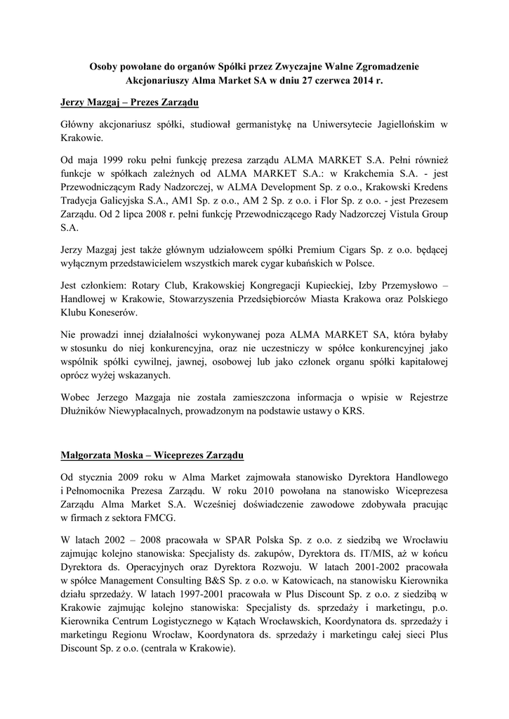 Osoby powołane do organów Spółki przez Zwyczajne Walne Zgromadzenie Akcjonariuszy Alma Market SA w dniu 27 czerwca 2014 r. Jerzy Mazgaj – Prezes Zarządu Główny akcjonariusz spółki, studiował germanistykę na Uniwersytecie Jagiellońskim w Krakowie. Od maja 1999 roku pełni funkcję prezesa zarządu ALMA MARKET S.A. Pełni również funkcje w spółkach zależnych od ALMA MARKET S.A.: w Krakchemia S.A. - jest Przewodniczącym Rady Nadzorczej, w ALMA Development Sp. z o.o., Krakowski Kredens Tradycja Galicyjska S.A., AM1 Sp. z o.o., AM 2 Sp. z o.o. i Flor Sp. z o.o. - jest Prezesem Zarządu. Od 2 lipca 2008 r. pełni funkcję Przewodniczącego Rady Nadzorczej Vistula Group S.A. Jerzy Mazgaj jest także głównym udziałowcem spółki Premium Cigars Sp. z o.o. będącej wyłącznym przedstawicielem wszystkich marek cygar kubańskich w Polsce. Jest członkiem: Rotary Club, Krakowskiej Kongregacji Kupieckiej, Izby Przemysłowo – Handlowej w Krakowie, Stowarzyszenia Przedsiębiorców Miasta Krakowa oraz Polskiego Klubu Koneserów. Nie prowadzi innej działalności wykonywanej poza ALMA MARKET SA, która byłaby w stosunku do niej konkurencyjna, oraz nie uczestniczy w spółce konkurencyjnej jako wspólnik spółki cywilnej, jawnej, osobowej lub jako członek organu spółki kapitałowej oprócz wyżej wskazanych. Wobec Jerzego Mazgaja nie została zamieszczona informacja o wpisie w Rejestrze Dłużników Niewypłacalnych, prowadzonym na podstawie ustawy o KRS. Małgorzata Moska – Wiceprezes Zarządu Od stycznia 2009 roku w Alma Market zajmowała stanowisko Dyrektora Handlowego i Pełnomocnika Prezesa Zarządu. W roku 2010 powołana na stanowisko Wiceprezesa Zarządu Alma Market S.A. Wcześniej doświadczenie zawodowe zdobywała pracując w firmach z sektora FMCG. W latach 2002 – 2008 pracowała w SPAR Polska Sp. z o.o. z siedzibą we Wrocławiu zajmując kolejno stanowiska: Specjalisty ds. zakupów, Dyrektora ds. IT/MIS, aż w końcu Dyrektora ds. Operacyjnych oraz Dyrektora Rozwoju. W latach 2001-2002 pracowała w spółce Management Consulting B&S Sp. z o.o. w Katowicach, na stanowisku Kierownika działu sprzedaży. W latach 1997-2001 pracowała w Plus Discount Sp. z o.o. z siedzibą w Krakowie zajmując kolejno stanowiska: Specjalisty ds. sprzedaży i marketingu, p.o. Kierownika Centrum Logistycznego w Kątach Wrocławskich, Koordynatora ds. sprzedaży i marketingu Regionu Wrocław, Koordynatora ds. sprzedaży i marketingu całej sieci Plus Discount Sp. z o.o. (centrala w Krakowie). Jest absolwentką Akademii Ekonomicznej w Katowicach. Posiada dyplom ukończenia: programu MBA Uniwersytetu Szczecińskiego we współpracy z Manchester Metropolitan University, studiów podyplomowych Akademii Ekonomicznej we Wrocławiu w zakresie zarządzania Innowacyjny Manager, studiów podyplomowych Wyższej Szkoły Bankowości we Wrocławiu w zakresie Controlingu. Nie prowadzi innej działalności wykonywanej poza ALMA MARKET SA, która byłaby w stosunku do niej konkurencyjna, oraz nie uczestniczy w spółce konkurencyjnej jako wspólnik spółki cywilnej, jawnej, osobowej lub jako członek organu spółki kapitałowej oprócz wyżej wskazanych. Wobec Małgorzaty Moska nie została zamieszczona informacja o wpisie w Rejestrze Dłużników Niewypłacalnych, prowadzonym na podstawie ustawy o KRS. Mariusz Wojdon – Wiceprezes Zarządu Od lutego 1994 roku pracuje w ALMA MARKET S.A. W 1998 roku objął stanowisko Dyrektora Finansowego, a od 2010 roku pełni funkcję Dyrektora Zarządzającego. Od 1999 roku jest członkiem Zarządu Spółki, natomiast funkcję Wiceprezesa Zarządu pełni od 2001 roku. Obecnie pełni również funkcje członka Rady Nadzorczej Krakchemia S.A., Wiceprzewodniczącego Rady Nadzorczej spółki Krakowski Kredens Tradycja Galicyjska S.A. oraz jest członkiem Rady Nadzorczej Stowarzyszenia Emitentów Giełdowych. Jest absolwentem Politechniki Krakowskiej, gdzie uzyskał tytuł inżyniera. Posiada dyplomy ukończenia: CETT i ACCA z zakresu rachunkowości i zarządzania finansami, Studium Zarządzania Przemysłowego, studiów podyplomowych w Szkole Głównej Handlowej w zakresie Standardów Europejskich w rachunkowości i finansach. Nie prowadzi innej działalności wykonywanej poza ALMA MARKET SA, która byłaby w stosunku do niej konkurencyjna, oraz nie uczestniczy w spółce konkurencyjnej jako wspólnik spółki cywilnej, jawnej, osobowej lub jako członek organu spółki kapitałowej oprócz wyżej wskazanych. Wobec Mariusza Wojdona nie została zamieszczona informacja o wpisie w Rejestrze Dłużników Niewypłacalnych, prowadzonym na podstawie ustawy o KRS.