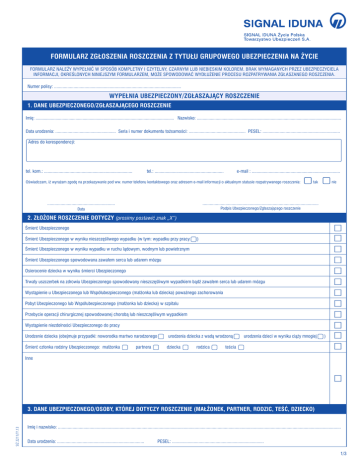 FORMULARZ ZGŁOSZENIA ROSZCZENIA Z TYTUŁU GRUPOWEGO UBEZPIECZENIA NA ŻYCIE FORMULARZ NALEŻY WYPEŁNIĆ W SPOSÓB KOMPLETNY I CZYTELNY, CZARNYM LUB NIEBIESKIM KOLOREM. BRAK WYMAGANYCH PRZEZ UBEZPIECZYCIELA INFORMACJI, OKREŚLONYCH NINIEJSZYM FORMULARZEM, MOŻE SPOWODOWAĆ WYDŁUŻENIE PROCESU ROZPATRYWANIA ZGŁASZANEGO ROSZCZENIA. Numer polisy: ......................................................................................................... WYPEŁNIA UBEZPIECZONY/ZGŁASZAJĄCY ROSZCZENIE 1. DANE UBEZPIECZONEGO/ZGŁASZAJĄCEGO ROSZCZENIE Imię: ...................................................................................................................... Nazwisko: ........................................................................................................................... Data urodzenia: .................................................. Seria i numer dokumentu tożsamości: ............................................... PESEL: ................................................................ Adres do korespondencji: tel. kom.: ......................................................................... tel.: ......................................................... e-mail : ......................................................................... Oświadczam, iż wyrażam zgodę na przekazywanie pod ww. numer telefonu kontaktowego oraz adresem e-mail informacji o aktualnym statusie rozpatrywanego roszczenia: ........................................................ nie tak ................................................................................................ Podpis Ubezpieczonego/Zgłaszającego roszczenie Data 2. ZŁOŻONE ROSZCZENIE DOTYCZY (prosimy postawić znak „X“) Śmierć Ubezpieczonego Śmierć Ubezpieczonego w wyniku nieszczęśliwego wypadku (w tym: wypadku przy pracy ) Śmierć Ubezpieczonego w wyniku wypadku w ruchu lądowym, wodnym lub powietrznym Śmierć Ubezpieczonego spowodowana zawałem serca lub udarem mózgu Osierocenie dziecka w wyniku śmierci Ubezpieczonego Trwały uszczerbek na zdrowiu Ubezpieczonego spowodowany nieszczęśliwym wypadkiem bądź zawałem serca lub udarem mózgu Wystąpienie u Ubezpieczonego lub Współubezpieczonego (małżonka lub dziecka) poważnego zachorowania Pobyt Ubezpieczonego lub Współubezpieczonego (małżonka lub dziecka) w szpitalu Przebycie operacji chirurgicznej spowodowanej chorobą lub nieszczęśliwym wypadkiem Wystąpienie niezdolności Ubezpieczonego do pracy Urodzenie dziecka (obejmuje przypadki: noworodka martwo narodzonego Śmierć członka rodziny Ubezpieczonego: małżonka partnera urodzenia dziecka z wadą wrodzoną dziecka rodzica urodzenia dzieci w wyniku ciąży mnogiej ) teścia Inne SIŻ 2211/??.13 3. DANE UBEZPIECZONEGO/OSOBY, KTÓREJ DOTYCZY ROSZCZENIE (MAŁŻONEK, PARTNER, RODZIC, TEŚĆ, DZIECKO) Imię i nazwisko: .......................................................................................................................................................................................................................................... Data urodzenia: ........................................................................ PESEL: ............................................................................ 1/3 INFORMACJE O ZDARZENIU Data zdarzenia: ........................................................ Godzina zdarzenia: .............................. Miejscowość: ........................................................................................ Województwo, w którym miało miejsce zdarzenie: ..................................................................................................................................................................................... Prosimy opisać przyczynę zaistniałego zdarzenia: ....................................................................................................................................................................................... ................................................................................................................................................................................................................................................................... ................................................................................................................................................................................................................................................................... ................................................................................................................................................................................................................................................................... Prosimy podać miejsce, okoliczności i przebieg zdarzenia: .......................................................................................................................................................................... ................................................................................................................................................................................................................................................................... ................................................................................................................................................................................................................................................................... Czy w związku z zaistniałym zdarzeniem zostało zastosowane leczenie szpitalne? Tak Nie Data przyjęcia do szpitala: ................................................................................. Data wypisu ze szpitala: .................................................................................................. Adres placówki szpitalnej: .......................................................................................................