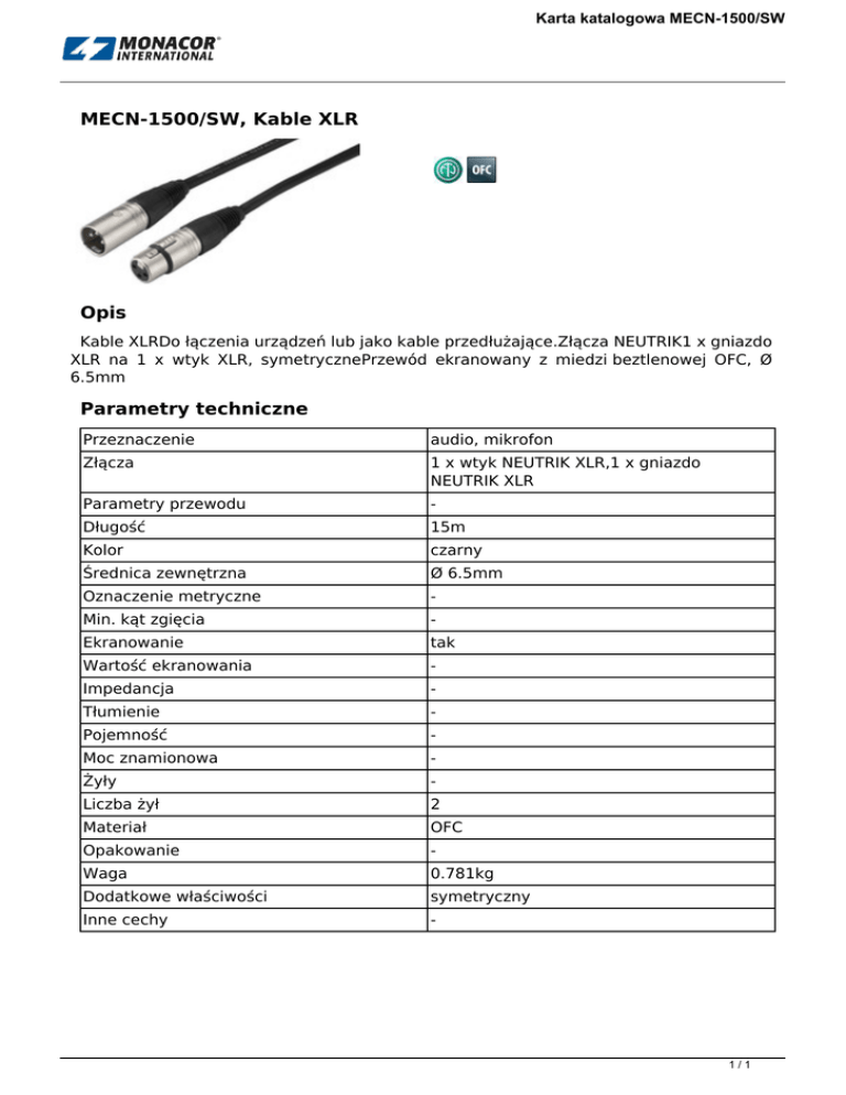 MECN-1500/SW, Kable XLR Opis Parametry techniczne