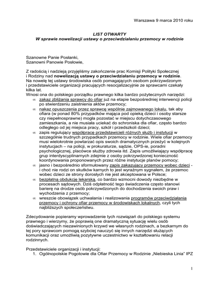 Warszawa 9 marca 2010 roku LIST OTWARTY W sprawie nowelizacji ustawy o przeciwdziałaniu przemocy w rodzinie Szanowne Panie Posłanki, Szanowni Panowie Posłowie, Z radością i nadzieją przyjęliśmy zakończenie prac Komisji Polityki Społecznej i Rodziny nad nowelizacją ustawy o przeciwdziałaniu przemocy w rodzinie. Na nowelę tej ustawy środowiska osób pomagających osobom pokrzywdzonym i przedstawiciele organizacji pracujących resocjalizacyjnie ze sprawcami czekały kilka lat. Wnosi ona do polskiego porządku prawnego kilka bardzo poŜytecznych narzędzi: • zakaz zbliŜania sprawcy do ofiar juŜ na etapie bezpośredniej interwencji policji po stwierdzeniu zaistnienia aktów przemocy; • nakaz opuszczenia przez sprawcę wspólnie zajmowanego lokalu, tak aby ofiara (w ponad 80% przypadków mająca pod opieką dzieci i osoby starsze czy niepełnosprawne) mogła pozostać w miejscu dotychczasowego zamieszkania, a nie musiała uciekać do schroniska dla ofiar, często bardzo odległego od jej miejsca pracy, szkół i przedszkoli dzieci; • zapis regulujący współpracę przedstawicieli róŜnych słuŜb i instytucji w szczególnie trudnych przypadkach przemocy w rodzinie. Wiele ofiar przemocy musi wielokrotnie powtarzać opis swoich dramatycznych przeŜyć w kolejnych instytucjach – na policji, w prokuraturze, sądzie, OPS-ie, poradni psychologicznej, placówce słuŜby zdrowia itd. Zapis umoŜliwiający współpracę grup interdyscyplinarnych zdejmie z osoby pokrzywdzonej konieczność koordynowania proponowanych przez róŜne instytucje planów pomocy; • jasno i bezpośrednio sformułowany zapis zakazujący przemocy wobec dzieci i choć nie rodzi on skutków karnych to jest wyraźnym sygnałem, Ŝe przemoc wobec dzieci ze strony dorosłych nie jest akceptowana w Polsce; • bezpłatną obdukcję lekarską, co bardzo wzmocni dowody niezbędne w procesach sądowych. Dziś odpłatność tego świadczenia często stanowi barierę na drodze osób pokrzywdzonych do dochodzenia swoich praw i wychodzenia z przemocy; • wreszcie obowiązek uchwalania i realizowania programów przeciwdziałania przemocy i ochrony ofiar przemocy w środowiskach lokalnych, czyli tych najbliŜszych społeczeństwu. Zdecydowanie popieramy wprowadzenie tych rozwiązań do polskiego systemu prawnego i wierzymy, Ŝe poprawią one dramatyczną sytuację wielu osób doświadczających niezawinionych krzywd we własnych rodzinach, a bezkarnym do tej pory sprawcom pomogą szybciej nauczyć się innych narzędzi słuŜących komunikacji oraz umoŜliwią pozytywne uczestnictwo w kształtowaniu relacji rodzinnych. Przedstawiciele organizacji i instytucji: 1. Ogólnopolskie Pogotowie dla Ofiar Przemocy w Rodzinie „Niebieska Linia” IPZ 1 2. 3. 4. 5. Fundacja Kidprotect Stowarzyszenie „OPTA” Specjalistyczny Ośrodek Wsparcia dla Ofiar Przemocy w Rodzinie w Zdunach Powiatowe Centrum Pomocy Rodzinie - Ośrodek Interwencji Kryzysowej w Krotoszynie 6. Punkt Konsultacyjny dla Osób z Problemem Alkoholowym w Krotoszynie 7. Komitet Ochrony Praw Dziecka 8. Centrum Interwencji Kryzysowej PCK w Gdańsku 9. Fundacja „Razem Lepiej” 10. V Zespół Kuratorskiej SłuŜby Sądowej Sądu Rejonowego Warszawa-Mokotów 11. Ośrodek dla Ofiar Przemocy w Rodzinie „DOM” Stowarzyszenia Pomocy Bezdomnym 12. Fundacja „Dzieci Niczyje” 13. Fundacja ,,Pomoc Kobietom i Dzieciom” 14. Interdyscyplinarne Stowarzyszenie Metod Pracy ze Stresem Growth 15. Stowarzyszenie „Centrum Wspierania Inicjatyw Pozarządowych” w Tarnowskich Górach 16. Inicjatywa Na Rzecz Potrzebujących "Sos-Malbork" 17. Fundacja Feminoteka 18. Stowarzyszenie Pomocy Samotnym Matkom „Pozwól Ŝyć” Oddział w Warszawie 19. Fundacja Drabina Rozwoju 20. Samodzielny Publiczny Zakład Terapii UzaleŜnień i WspółuzaleŜnienia w Siemianowicach Śląskich 21. Punkt Interwencji Kryzysowej dla Osób Doświadczających Przemocy w Rodzinie w Zgorzelcu 22. Suwalskie Stowarzyszenie „Wybór” 23. Miejski Ośrodek Pomocy Społecznej w Częstochowie 24. Stowarzyszenie Pomocy Dzieciom PATKUB 25. Wielkopolskie Stowarzyszenie Kuratorów Sądowych 26. Specjalistyczny Ośrodek Wsparcia dla Ofiar Przemocy w Rodzinie w Wodzisławiu Śląskim 27. Specjalistyczny Ośrodek Wsparcia dla Ofiar Przemocy w Rodzinie w Kielcach 28. Ośrodek dla Osób Dotkniętych Przemocą w Krakowie 29. Narodowy Instytut Zdrowia Publicznego - Państwowy Zakład Higieny 30. Stowarzyszenie Interwencji Prawnej 31. Specjalistyczny Ośrodek Wsparcia dla Ofiar Przemocy w Rodzinie w Poznaniu 32. Powiatowy Ośrodek Wsparcia Dziecka i Rodziny w Chrzanowie 33. Towarzystwo Interwencji Kryzysowej w Krakowie 34. Tarnowski Ośrodek Interwencji Kryzysowej i Wsparcia Ofiar Przemocy w Tarnowie 35. Zespół Ośrodków Wsparcia w Mławie 36. Wydział Przeciwdziałania Przemocy w Rodzinie Biuro Polityki Społecznej Urząd m. st. Warszawy 37. Fundacja Przestrzenie Dialogu 38. Zielony Instytut 39. Ośrodek Pomocy Społecznej Dzielnicy Bielany M. st. Warszawy 40. Stowarzyszenie „Dzieci w Europie” 41. Biuro ds. UzaleŜnień ROPS w Elblągu 42. Zespół Interdyscyplinarny do Spraw Dziecka Krzywdzonego i Zaniedbywanego przy Poradni Psychologiczno-Pedagogicznej w śaganiu 2 43. Stowarzyszenie na Rzecz Kobiet „Victoria”, Rzeszów 44. Stowarzyszenie „Razem Przeciw Przemocy”, Warszawa 45. Wojewódzki Koordynator Realizacji Krajowego Programu Przeciwdziałania Przemocy w Rodzinie, Kujawsko-Pomorski Urząd Wojewódzki w Bydgoszczy 46. Miejska Komisja Rozwiązywania Problemów Alkoholowych w Wałbrzychu 47. Specjalistyczna Poradnia Rodzinna ds. Przeciwdziałania Przemocy w Warszawie 48. Rzecznik Praw Ofiar przy Marszałku Województwa Kujawsko-Pomorskiego 49. Kujawsko-Pomorska Niebieska Linia, Toruń 50. Stowarzyszenie „Arka Nadziei”, Kielce 51. Stowarzyszenie „Bezpieczeństwo Dziecka”, Bydgoszcz 52. Stowarzyszenie „MEDAR”, Centrum Pomocy Rodzinie w Bydgoszczy 53. Pracownia Kultury Współczesnej 