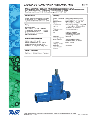 ZASUWA DO NAWIERCANIA PRZY£¥CZA PN16 03/40 Zasuwa klinowa do wykonywania przy³¹cza pod ciœnieniem wg PN-EN 1171 Z jednej strony gwint zewnêtrzny, z drugiej gwint wewnêtrzny do aparatu nawiercaj¹cego oraz z³¹cze kielichowe z pierœcieniem wzmacniaj¹cym do rur PE Przy³¹cze kielichowe DN 20-50. Przy³¹cze gwintowe 11/4" - 21/2" Przeznaczenie: Materia³y: Woda, œcieki i inne nieagresywne p³yny o temp. max. 70° C, dla ruroci¹gów wykonanych z rur PE temp. max. 20° C Korpus i pokrywa Ochrona antykorozyjna Trzpieñ Uszczelnienie trzpienia Testy: Próba wod¹ wg: PN-EN 1074 -1, 2 / PN-EN 12266 – szczelnoœæ zamkniêcia: 1,1 × PN – wytrzyma³oœæ korpusu: 1,5 × PN Próba momentu obrotowego zamykania zasuwy Tuleja oporowa o-ringów Klin Wyposa¿enie dodatkowe: Pierœcieñ oporowy trzpienia Œruby pokrywy Kó³ko rêczne AVK typ 08 Przed³u¿acz trzpienia AVK typ 04 Skrzynka uliczna AVK typ 80/50 Podstawa do skrzynki AVK typ 80/44 Uszczelka pokrywy, kielicha Pierœcieñ wzmacniaj¹cy kielicha ¯eliwo sferoidalne GGG-40 Pow³oka z farby epoksydowej zewn. i wewn. min. 250 µm Stal nierdzewna 1.4021 Pierœcieñ zgarniaj¹cy z gumy NBR, 4 o-ringi z gumy NBR, uszczelka wargowa z gumy EPDM Tworzywo sztuczne Rdzeñ z mosi¹dzu nawulkanizowany zewn. pow³ok¹ z gumy EPDM Mosi¹dz Stal nierdzewna 1.4301, zatopione mas¹ na gor¹co Guma EPDM Poliacetal Atesty i certyfikaty: Pañstwowy Zak³ad Higieny, Warszawa Z uwagi na stale prowadzone prace badawczo-rozwojowe konstrukcja, materia³y oraz warunki wykonania mog¹ ulec zmianie. AVK ARMADAN Sp. z o.o./2011 AR „Mycha” / 380340FH ZASUWA DO NAWIERCANIA PRZY£¥CZA PN16 03/40 Zasuwa klinowa do wykonywania przy³¹cza pod ciœnieniem wg PN-EN 1171 Z jednej strony gwint zewnêtrzny, z drugiej gwint wewnêtrzny do aparatu nawiercaj¹cego oraz z³¹cze kielichowe z pierœcieniem wzmacniaj¹cym do rur PE Przy³¹cze kielichowe DN 20-50. Przy³¹cze gwintowe 11/4" - 21/2" Wykaz elementów budowy: 1.Trzpieñ 2.Pierœcieñ zgarniaj¹cy 3.O-ringi trzpienia 4.Tuleja oporowa o-ringów 5.Pokrywa 6.Pierœcieñ oporowy trzpienia 7.Uszczelka wargowa 8. Œruba pokrywy 9. Uszczelka pokrywy 10. Klin 11. Korpus 12. Uszczelka kielicha 13. Pierœcieñ wzmacniaj¹cy F H BSP 2 BSP 1 L Nr kat. 03-032-4000 03-032-60006 03-040-4000 03-040-6000 03-050-4000 03-063-4000 03-063-6000 BSP 1 - gwint wewnêtrzny BSP 2 - gwint zewnêtrzny DN 25 25 32 32 40 50 50 Œredn.zewn. rury PE mm 32 32 40 40 50 63 63 Gwint BSP 1 1 1 /4" 1 1/4" 1 1/2" 1 1/2" 2" 2 1/2" 2 1/2" Gwint BSP 2 1 1 /4" 2" 2" 1 1/2" 2" 2 1/2" 2" L mm H mm F mm Waga kg/szt 190 190 221 221 272 291 291 180 180 190 190 203 213 213 12 12 12 12 12 12 12 3,8 3,8 4,0 4,0 7,3 8,3 8,3