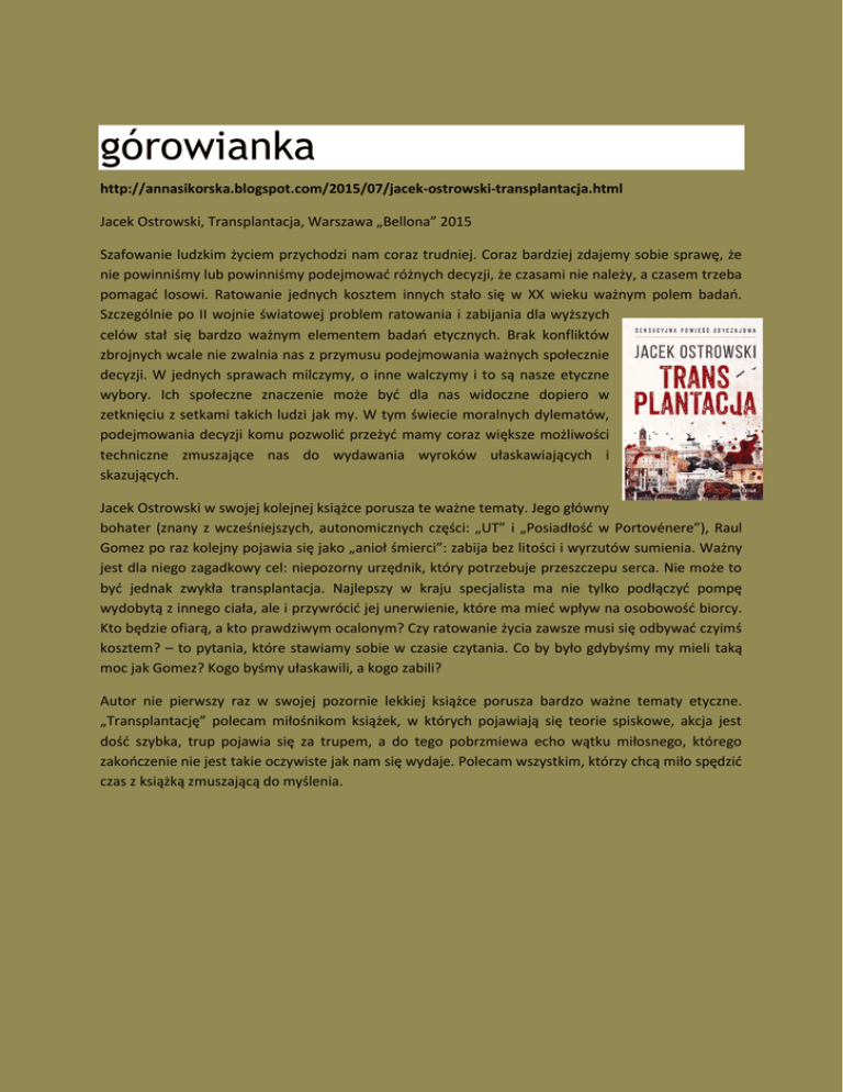górowianka http://annasikorska.blogspot.com/2015/07/jacek-ostrowski-transplantacja.html Jacek Ostrowski, Transplantacja, Warszawa „Bellona” 2015 Szafowanie ludzkim życiem przychodzi nam coraz trudniej. Coraz bardziej zdajemy sobie sprawę, że nie powinniśmy lub powinniśmy podejmować różnych decyzji, że czasami nie należy, a czasem trzeba pomagać losowi. Ratowanie jednych kosztem innych stało się w XX wieku ważnym polem badań. Szczególnie po II wojnie światowej problem ratowania i zabijania dla wyższych celów stał się bardzo ważnym elementem badań etycznych. Brak konfliktów zbrojnych wcale nie zwalnia nas z przymusu podejmowania ważnych społecznie decyzji. W jednych sprawach milczymy, o inne walczymy i to są nasze etyczne wybory. Ich społeczne znaczenie może być dla nas widoczne dopiero w zetknięciu z setkami takich ludzi jak my. W tym świecie moralnych dylematów, podejmowania decyzji komu pozwolić przeżyć mamy coraz większe możliwości techniczne zmuszające nas do wydawania wyroków ułaskawiających i skazujących. Jacek Ostrowski w swojej kolejnej książce porusza te ważne tematy. Jego główny bohater (znany z wcześniejszych, autonomicznych części: „UT” i „Posiadłość w Portovénere”), Raul Gomez po raz kolejny pojawia się jako „anioł śmierci”: zabija bez litości i wyrzutów sumienia. Ważny jest dla niego zagadkowy cel: niepozorny urzędnik, który potrzebuje przeszczepu serca. Nie może to być jednak zwykła transplantacja. Najlepszy w kraju specjalista ma nie tylko podłączyć pompę wydobytą z innego ciała, ale i przywrócić jej unerwienie, które ma mieć wpływ na osobowość biorcy. Kto będzie ofiarą, a kto prawdziwym ocalonym? Czy ratowanie życia zawsze musi się odbywać czyimś kosztem? – to pytania, które stawiamy sobie w czasie czytania. Co by było gdybyśmy my mieli taką moc jak Gomez? Kogo byśmy ułaskawili, a kogo zabili? Autor nie pierwszy raz w swojej pozornie lekkiej książce porusza bardzo ważne tematy etyczne. „Transplantację” polecam miłośnikom książek, w których pojawiają się teorie spiskowe, akcja jest dość szybka, trup pojawia się za trupem, a do tego pobrzmiewa echo wątku miłosnego, którego zakończenie nie jest takie oczywiste jak nam się wydaje. Polecam wszystkim, którzy chcą miło spędzić czas z książką zmuszającą do myślenia. http://asymaka.blogspot.com/2015/08/transplantacja-jacek-ostrowski.html "Transplantacja" to najnowsza propozycja literacka Jacka Ostrowskiego. Ta sensacyjna powieść obyczajowa umiejscowiona została w scenerii klimatycznej, nastrajającej nas wakacyjnie. Kto z nas nie chciałby spędzić urlopu w słynącej z wina i oliwek, słonecznej Toskanii? Trafiamy w sam środek lata. Jest upalnie, gorąco, duszno. Nic jednak nie jest w stanie przestraszyć turystów, zniechęcić ich i odciągnąć od leżenia na plaży i leniwego, sielankowego wypoczynku. Nie wszyscy jednak mogą korzystać ze słońca. Osoby takie jak stary Domingo, emerytowany kucharz z hotelu Villa la Fonte, wcale nie przepada za upałami. Akurat szykuje się na przyjazd bardzo ważnego gościa, zamiata taras i krząta się po obejściu. Chciałby, żeby wszystko było przygotowane idealnie. Jego małżonka, Eleonora, również stara się z całych sił, sprząta pokój gościnny. Co prawda brat Julity, na którą czeka ta niezwykła para próbuje przekonać staruszków, że opieka nad jego siostrą może być ponad ich siły, ale oni nie słuchają jego dobrych rad. Wiedzą swoje. Dziewczynę traktują jak własne dziecko i żadne sprzeciwy Antonia nie są w stanie zmienić ich decyzji. Julita niknie w oczach. Cierpi straszliwie i zdaje się, że nie ma dla niej żadnego ratunku. Choroba wyniszcza ją i zmienia nie do poznania. Domingo zrobiłby wszystko, by uśmierzyć jej ból i ponownie zobaczyć w jej oczach radość. Dać jej choćby odrobinę nadziei. Sprzedałby duszę diabłu... To bardzo ciekawie opowiedziana historia z pogranicza życia i śmierci. Poznajemy w niej człowieka, który ma za zadanie znaleźć dawcę serca dla niezwykle wpływowego klienta. Człowiek ten to Raul Gomes, którego kiedyś łączyło coś z naszą młodą bohaterką. Czy i jej pomoże wygrać w walce z chorobą? Wszak uważa on, że cel uświęca środki. Mieszkańcy Rzymu nie mogą spać spokojnie, odkąd w wiecznym mieście grasuje sprytny i nieuchwytny morderca. Kimże on jest i co nim kieruje? To niezwykle poruszająca książka. Dzięki niej zaczynamy się zastanawiać, jakiego dokonalibyśmy wyboru, będąc na miejscu chorego. To decyzja niebywale trudna, nie zazdroszczę nikomu, kto staje przed podobnymi dylematami, z jakimi borykają się bohaterowie tej powieści. Bezradność, bezsilność w obliczu cierpienia najbliższych, przyglądanie się temu, jak choroba odbiera im zdolność logicznego myślenia, jak ból staje się nie do zniesienia to najgorsze, co może spotkać bliskich chorego. Julia jest bardzo dzielną kobietą i nie poddaje się bez walki. Niebawem poznaje też inną chorą, matkę małych dzieci. Czy uda się ocalić życie i jednej, i drugiej? Świetnie skonstruowana powieść. Wciąga nas i trzyma w napięciu do ostatnich niemalże stron. Przenosimy się do Włoch, podążamy za naszymi bohaterami, pomagamy im podjąć niełatwe przecież decyzje. I uczymy się być lepszymi, dzięki tej lekturze. Pozwala nam ona bowiem spojrzeć z zupełnie innej perspektywy na życie, naszą codzienność i nasze problemy. Polecam. Dune Fairytales http://dune-fairytales.blogspot.com/2015/07/transplantacjajacek-ostrowski.html Czy cel uświęca środki? Wielu współczesnych ludzi powie, że absolutnie nie. Jednak członkowie tajemniczej organizacji o nazwie UT mają na ten temat inne zdanie. Kiedy więc Raul Gomes otrzymuje zadanie znalezienia zdrowego serca dla swego klienta, nie zamierza czekać na ofiary wypadków drogowych. Rozpoczyna poszukiwania wśród ży