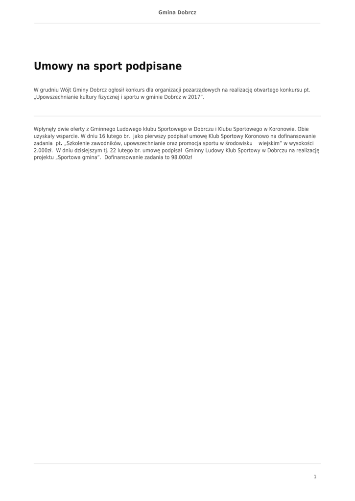 Gmina Dobrcz Umowy na sport podpisane W grudniu Wójt Gminy Dobrcz ogłosił konkurs dla organizacji pozarządowych na realizację otwartego konkursu pt. „Upowszechnianie kultury fizycznej i sportu w gminie Dobrcz w 2017”. Wpłynęły dwie oferty z Gminnego Ludowego klubu Sportowego w Dobrczu i Klubu Sportowego w Koronowie. Obie uzyskały wsparcie. W dniu 16 lutego br. jako pierwszy podpisał umowę Klub Sportowy Koronowo na dofinansowanie zadania pt. „Szkolenie zawodników, upowszechnianie oraz promocja sportu w środowisku wiejskim” w wysokości 2.000zł. W dniu dzisiejszym tj. 22 lutego br. umowę podpisał Gminny Ludowy Klub Sportowy w Dobrczu na realizację projektu „Sportowa gmina”. Dofinansowanie zadania to 98.000zł 1