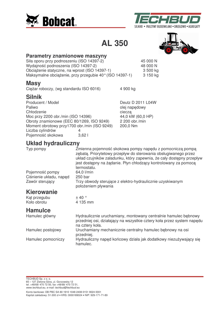AL 350 Parametry znamionowe maszyny Siła oporu przy podnoszeniu (ISO 14397-2) Wydajno podnoszenia (ISO 14397-2) Obci enie statyczne, na wprost (ISO 14397-1) Maksymalne obci enie, przy przegubie 40° (ISO 14397-1) Masy Ci ar roboczy, (wg standardu ISO 6016) Silnik Producent / Model Paliwo Chłodzenie Moc przy 2200 obr./min (ISO 14396) Obroty znamionowe (EEC 80/1269, ISO 9249) Moment obrotowy przy1700 obr./min (ISO 9249) Liczba cylindrów 4 Pojemno skokowa 3,62 l 45 000 N 48 000 N 3 500 kg 3 150 kg 4 900 kg Deutz D 2011 L04W olej nap dowy ciecz 44,0 kW (60,0 HP) 2 200 obr./min 200,0 Nm Układ hydrauliczny Typ pompy Pojemno pompy Ci nienie układu, nap d Zawór steruj cy Kierowanie K t przegubu Koło obrotu Hamulce Hamulec główny Hamulec postojowy Hamulec pomocniczy Zmienna pojemno skokowa pompy nap du z pomocnicz pomp z bat . Priorytetowy przepływ do sterowania obsługiwanego przez układ czujników załadunku, który zapewnia, e cały dost pny przepływ jest dost pny na danie. Płyn chłodz cy kontrolowany za pomoc termostatu. 64,0 l/min 250 bar Trzy obwody steruj ce z elektro-hydraulicznie uzyskiwanym poło eniem pływania ± 40 ° 4 135 mm Hydraulicznie uruchamiany, montowany centralnie hamulec b bnowy przedniej osi, działaj cy na wszystkie cztery koła przez system nap du na cztery koła. Uruchamiany mechanicznie centralny hamulec b bnowy na osi przedniej. Hydrauliczny nap d ko cowy działa jak dodatkowy niezu ywaj cy si hamulec. TECHBUD Sp. z o. o. 65 – 127 Zielona Góra, ul. Gorzowska 12 tel. +48/68/ 470 72 50, fax +48/68/ 470 72 51, www.techbud.eu, e-mail: [email protected] Konto bankowe: DB PBC SA 80 1910 1048 2408 0151 9024 0001 Kapitał zakładowy: 51.000 zł • KRS: 0000189024 • NIP: 929-171-71-89 Układ nap dowy Typ nap du Zmienna pojemno skokowa pompy hydrostatycznej, zamontowanej kołnierzowo na silniku. Dwuzakresowa zmienna pojemno skokowa silnika z przesuni ciem mocy na przekładni redukcyjnej tylnej osi. Opcja z du pr dko ci oferuje dodatkowe r czne przesuni cie nap du, które mo na wykona w czasie postoju maszyny. Nap d hydrostatyczny z zaawansowan automatyk nap du. Automatyczna regulacja siły nap dowej i pr dko ci. Ci gła regulacja pr dko ci do przodu i wstecz. Nap d na cztery koła za pomoc wału nap dowego ł cz cego przednia i tyln o . Sztywno zamontowana przednia o nap du planetarnego z centralnym hamulcem b bnowym i samoblokuj cym dyferencjałem. Zamontowana na czopy tylna o nap du planetarnego z k tem oscylacji ±12°, wbudowan przekładni redukcyjn i samoblokuj cym dyferencjałem. Opcja z du pr dko ci posiada dodatkow wbudowan , dwustopniow przekładni regukcyjn . Nap d ko cowy Osi Jazda Maksymalna pr Maksymalna pr Maksymalna pr Maksymalna pr Obj to Pojemno Pojemno Pojemno Pojemno dko dko dko dko jazdy — zakres I jazdy — zakres II jazdy — opcja z du jazdy — opcja z du pr dko ci , zakres I pr dko ci , zakres II płynów miski olejowej silnika i filtra zbiornika paliwa zbiornika hydrauliki układu hydraulicznego / hydrostatycznego Sterowanie 7 km/h 20 km/h 18 km/h 36 km/h 13,2 l 75,0 l 46,0 l 55,0 l Funkcje podnoszenia i przechyłu Wielofunkcyjny joystick z wbudowanym przeł cznikiem kierunku jazdy, przeł cznikiem poło enia pływania oraz przeł cznikiem pomocniczego obwodu sterowniczego. Obwód pomocniczy Przeł cznik na joysticku wielofunkcyjnym TECHBUD Sp. z o. o. 65 – 127 Zielona Góra, ul. Gorzowska 12 tel. +48/68/ 470 72 50, fax +48/68/ 470 72 51, www.techbud.eu, e-mail: [email protected] Konto bankowe: DB PBC SA 80 1910 1048 2408 0151 9024 0001 Kapitał zakładowy: 51.000 zł • KRS: 0000189024 • NIP: 929-171-71-89 Wyposa enie standardowe • • • • • • • • • • • • • • • Pełna wersja kabiny ROPS* zamonotawana za pomoc uszczelek gumowych z dwoma parami drzwi i oknem przesuwnym z lewej strony Hydraulicznie amortyzowany fotel z pasem bezpiecze stwa Nagrzewnica kabiny i filtr powietrza dolotowego Przyrz dy Hamulec postojowy Wycieraczki o przerywanym ruchu i spryskiwacz szyby, z przodu i z tyłu Joystick —wielofunkcyjny Pomocniczy układ hydrauliczny Kierownica z regulacj przechyłu Samoblokuj ce dyferencjały Przednie wiatła robocze Kierunkowskazy Instalacja radiowa Mitas EM01 opony Zestaw narz dzi Wyposa enie opcjonalne • • • • • • • • • • • • • • • • • • • • • • • • • • • • Dwubiegowy nap d jazdy FOPS** ochrona wiatła sufitowego Mechaniczny system szybkiego mocowania Hydrauliczny system szybkiego mocowania Ci ary tylnej osi (nie zatwierdzone w poł czeniu z oponami z wypełnieniem piankowym) Alarm zapasowy, automatyczny Alarm cofania, z mo liwo ci wył czenia Tylne wiatła robocze Przesuwne okno w prawych drzwiach Obrotowe wiatło ostrzegawcze Klimatyzacja Fotel z amortyzacj powietrzn z podpor odcinka l d wiowego Regulacja podłokietników i zagłówka Kierownica z regulacj wysoko ci i przechyłu Elektryczna pompa napełniaj ca Zł czka do r cznego młota hydraulicznego Otwarty hydrauliczny układ powrotny Zabezpieczenie antykradzie owe Zawór bezpiecze stwa zabezpieczaj cy przed p kni ciem w y Dunlop SPT9 opony Michelin XMCL opony Continental MPT E-70 opony O wietlenie rejestracji Hak załadowczy zintegrowany z systemem szybkiego mocowania Sterownik ruchu ły ki Rami ładowarki z mechanizmem Z Certyfikat TUV dla Niemiec Olej hydrauliczny podlegaj cy biodegradacji (Panolin) TECHBUD Sp. z o. o. 65 – 127 Zielona Góra, ul. Gorzowska 12 tel. +48/68/ 470 72 50, fax +48/68/ 470 72 51, www.techbud.eu, e-mail: [email protected] Konto bankowe: DB PBC SA 80 1910 1048 2408 0151 9024 0001 Kapitał zakładowy: 51.000 zł • KRS: 0000189024 • NIP: 929-171-71-89 Osprz t • • • • • • • • • • • • • Hak załadowczy z mo liwo ci zamocowania na widłach paletowych Ły ka bocznozrzutowa Ły ka do materiałów bardzo lekkich Ły ka do materiałów lekkich Ły ka do skał Ły ka do załadunku Ły ka do załadunku z chwytakiem Ły ka do ziem