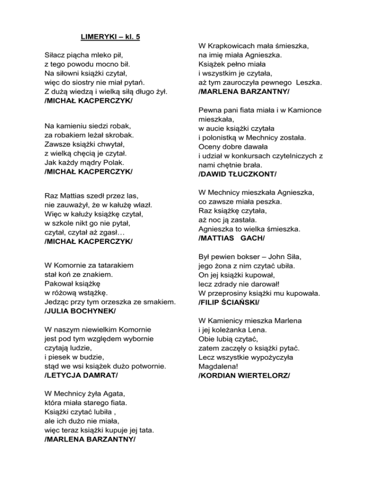 LIMERYKI – kl. 5 Siłacz piącha mleko pił, z tego powodu mocno bił. Na siłowni książki czytał, więc do siostry nie miał pytań. Z dużą wiedzą i wielką siłą długo żył. /MICHAŁ KACPERCZYK/ W Krapkowicach mała śmieszka, na imię miała Agnieszka. Książek pełno miała i wszystkim je czytała, aż tym zauroczyła pewnego Leszka. /MARLENA BARZANTNY/ Na kamieniu siedzi robak, za robakiem leżał skrobak. Zawsze książki chwytał, z wielką chęcią je czytał. Jak każdy mądry Polak. /MICHAŁ KACPERCZYK/ Pewna pani fiata miała i w Kamionce mieszkała, w aucie książki czytała i polonistką w Mechnicy została. Oceny dobre dawała i udział w konkursach czytelniczych z nami chętnie brała. /DAWID TŁUCZKONT/ Raz Mattias szedł przez las, nie zauważył, że w kałużę wlazł. Więc w kałuży książkę czytał, w szkole nikt go nie pytał, czytał, czytał aż zgasł… /MICHAŁ KACPERCZYK/ W Mechnicy mieszkała Agnieszka, co zawsze miała peszka. Raz książkę czytała, aż noc ją zastała. Agnieszka to wielka śmieszka. /MATTIAS GACH/ W Komornie za tatarakiem stał koń ze znakiem. Pakował książkę w różową wstążkę. Jedząc przy tym orzeszka ze smakiem. /JULIA BOCHYNEK/ W naszym niewielkim Komornie jest pod tym względem wybornie czytają ludzie, i piesek w budzie, stąd we wsi książek dużo potwornie. /LETYCJA DAMRAT/ W Mechnicy żyła Agata, która miała starego fiata. Książki czytać lubiła , ale ich dużo nie miała, więc teraz książki kupuje jej tata. /MARLENA BARZANTNY/ Był pewien bokser – John Siła, jego żona z nim czytać ubiła. On jej książki kupował, lecz zdrady nie darował! W przeprosiny książki mu kupowała. /FILIP ŚCIAŃSKI/ W Kamienicy mieszka Marlena i jej koleżanka Lena. Obie lubią czytać, zatem zaczęły o książki pytać. Lecz wszystkie wypożyczyła Magdalena! /KORDIAN WIERTELORZ/