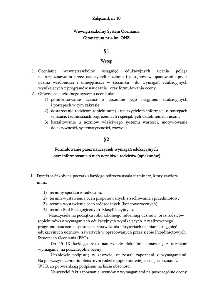 Załącznik nr 10 Wewnątrzszkolny System Oceniania Gimnazjum nr 4 im. ONZ §1 Wstęp 1. Ocenianie wewnątrzszkolne osiągnięć edukacyjnych ucznia polega na rozpoznawaniu przez nauczycieli poziomu i postępów w opanowaniu przez ucznia wiadomości i umiejętności w stosunku do wymagań edukacyjnych wynikających z programów nauczania oraz formułowania oceny. 2. Główne cele szkolnego systemu oceniania: 1) poinformowanie ucznia o poziomie jego osiągnięć edukacyjnych i postępach w tym zakresie, 2) dostarczanie rodzicom (opiekunom) i nauczycielom informacji o postępach w nauce, trudnościach, zagrożeniach i specjalnych uzdolnieniach ucznia, 3) kształtowanie u uczniów właściwego systemu wartości, motywowanie do aktywności, systematyczności, rozwoju. §2 Formułowanie przez nauczycieli wymagań edukacyjnych oraz informowanie o nich uczniów i rodziców (opiekunów) 1. Dyrektor Szkoły na początku każdego półrocza ustala terminarz, który zawiera m.in.: 1) 2) 3) 4) terminy spotkań z rodzicami, termin wystawienia ocen proponowanych z zachowania i przedmiotów, termin wystawienia ocen śródrocznych (końcoworocznych), termin Rad Pedagogicznych Klasyfikacyjnych. Nauczyciele na początku roku szkolnego informują uczniów oraz rodziców (opiekunów) o wymaganiach edukacyjnych wynikających z realizowanego programu nauczania, sposobach sprawdzania i kryteriach oceniania osiągnięć edukacyjnych uczniów, zawartych w opracowanych przez siebie Przedmiotowych Systemach Oceniania (PSO). Do 15 IX każdego roku nauczyciele dokładnie omawiają z uczniami wymagania na poszczególne oceny. Uczniowie podpisują w zeszycie, że zostali zapoznani z wymaganiami. Na pierwszym zebraniu plenarnym rodzice (opiekunowie) zostają zapoznani z WSO, co potwierdzają podpisem na liście obecności. Nauczyciel fakt zapoznania uczniów z wymaganiami na poszczególne oceny 2. 3. 4. 5. 6. 7. 8. zapisuje w dzienniku lekcyjnym. Wychowawca klasy na początku każdego roku szkolnego informuje uczniów o zasadach oceniania zachowania. Nauczyciel jest obowiązany indywidualizować pracę z uczniem na obowiązkowych i dodatkowych zajęciach edukacyjnych, odpowiednio do potrzeb rozwojowych i edukacyjnych oraz możliwości psychofizycznych ucznia. Przy ustalaniu oceny z wychowania fizycznego, zajęć technicznych, muzyki i plastyki oraz zajęć artystycznych należy w szczególności brać pod uwagę wysiłek wkładany przez ucznia w wywiązanie się z obowiązków wynikających ze specyfiki tych zajęć, a w przypadku wychowania fizycznego także systematyczność udziału ucznia w zajęciach oraz aktywność ucznia w działaniach podejmowanych przez szkołę na rzecz kultury fizycznej. Dyrektor szkoły zwalnia ucznia 1) z wykonywania określonych ćwiczeń fizycznych na zajęciach wychowania fizycznego na podstawie opinii o ograniczonych możliwościach wykonywania przez ucznia tych ćwiczeń wydanej przez lekarza, na czas określony w tej opinii. 2) w realizacji zajęć wychowania fizycznego, zajęć komputerowych lub informatyki na podstawie opinii o braku możliwości uczestniczenia ucznia w tych zajęciach wydanej przez lekarza na czas określony w tej opinii. 3) w przypadku zwolnienia ucznia z zajęć w dokumentacji przebiegu nauczania zamiast oceny klasyfikacyjnej wpisuje się „zwolniony” albo „zwolniona” Dyrektor szkoły na wniosek rodziców oraz na podstawie opinii poradni psychologiczno- pedagogicznej, w tym poradni specjalistycznej zwalania do końca danego etapu edukacyjnego ucznia z wadą słuchu, głęboką dysleksją rozwojową, z afazją, z niepełno sprawnościami sprzężonymi lub z autyzmem, w tym z zespołem Aspergera z nauki drugiego języka obcego nowożytnego. W przypadku ucznia o którym mowa w punkcie 6 posiadającego orzeczenie o potrzebie kształcenia specjalnego lub orzeczenie o potrzebie indywidualnego nauczania zwolnieni z nauki drugiego języka nowożytnego może nastąpić na podstawie tego orzeczenia. W przypadku zwolnienia ucznia z nauki drugiego języka obcego nowożytnego w dokumentacji przebiegu nauczania zamiast oceny klasyfikacyjnej wpisuje się „zwolniony” lub „zwolniona” §3 Ocenianie bieżące. Ocenianie śródroczne i końcoworoczne (roczne). Promowanie uczniów. Przyjęte w szkole formy i skala ocenienia. 1. Nauczyciele systematycznie oceniają uczniów. Szkoła ustala, że uczeń w ciągu roku szkolnego jest raz oceniany śródrocznie (I półrocze) i końcoworocznie. Dyrektor Szkoły na początku roku szkolnego (posiedzenie Rady Pedagogicznej) ustala 2. 3. 4. 5. 6. termin oceniania śródrocznego, który podany jest uczniom i rodzicom (opiekunom) na początku roku szkolnego. Termin ten podawany jest: 1) uczniom do 15IX każdego roku szkolnego, 2) rodzicom na pierwszym zebraniu we wrześniu. Ocena informuje ucznia, co osiągnął, co zrobił dobrze, ile potrafi, a nauczyciela i rodzica o aktywności, postępach, trudnościach i specjalnych uzdolnieniach. Oceny bieżące ustala się w stopniach następującej skali: 1) stopień celujący – 6 2) stopień bardzo dobry – 5 3) stopień dobry – 4 4) stopień dostateczny – 3 5) stopień dopuszczający – 2 6) stopień niedostateczny – 1 Pozytywnymi ocenami klasyfikacyjnymi są oceny ustalone w stopniach, o których mowa w punktach 1 – 5. Negatywną oceną jest ustalona w punkcie 6. Propozycje ocen śródrocznych oraz końcoworocznych ustala się w stopniach według następującej skali z możliwością rozszerzenia o znaki: „+”, „-” 1) oceny bieżące zapisujemy cyframi: 1,2,3,4,5,6 2) stopień celujący – cel 3) stopień bardzo dobry – bdb 4) stopień dobry – db 5) stopień dostateczny – dst 6) stopień dopuszczający – dop 7) stopień niedostateczny – ndst Oceny roczne ustala się w stopniach według skali w pełnym brzmieniu: 1) stopień celujący 2) stopień bardzo dobry 3) stopień dobry 4) stopień dostateczny 5) stopień dopuszczający 6) stopień niedostateczny 7