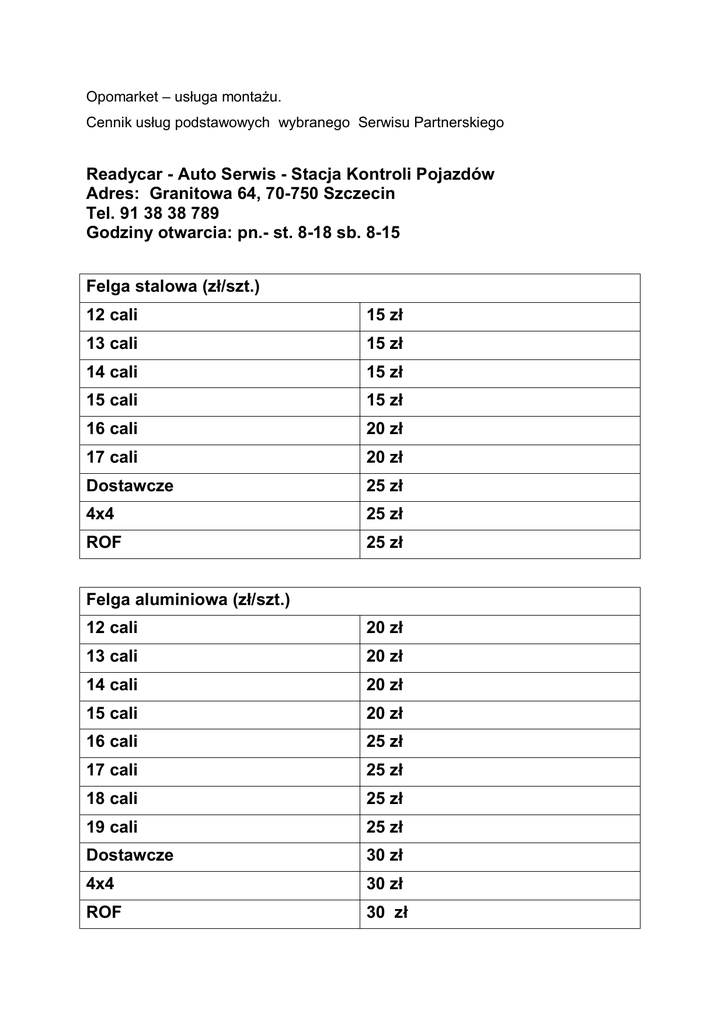Opomarket – usługa montażu. Cennik usług podstawowych wybranego Serwisu Partnerskiego Readycar - Auto Serwis - Stacja Kontroli Pojazdów Adres: Granitowa 64, 70-750 Szczecin Tel. 91 38 38 789 Godziny otwarcia: pn.- st. 8-18 sb. 8-15 Felga stalowa (zł/szt.) 12 cali 15 zł 13 cali 15 zł 14 cali 15 zł 15 cali 15 zł 16 cali 20 zł 17 cali 20 zł Dostawcze 25 zł 4x4 25 zł ROF 25 zł Felga aluminiowa (zł/szt.) 12 cali 20 zł 13 cali 20 zł 14 cali 20 zł 15 cali 20 zł 16 cali 25 zł 17 cali 25 zł 18 cali 25 zł 19 cali 25 zł Dostawcze 30 zł 4x4 30 zł ROF 30 zł Maksymalna średnica montowanych opon 22 cali Dodatkowe usługi: Profesjonalny serwis szybkiej obsługi pojazdów osobowych i dostawczych oraz Stacja Kontroli Pojazdów Przechowalnia opon: 39 zł komplet Serwis mechaniczny: TAK Lista usług serwisu mechanicznego: Stacja Kontroli Pojazdów Geometria 3d Hamulce Zawieszenie Oleje, filtry, płyny Diagnostyka Komputerowa Klimatyzacja Rozrząd Opony i felgi Części Do odebrania zamówienia w Serwisie Partnerskim konieczne będą: a) numer zamówienia Klienta, dane Klienta: imię, nazwisko, adres b) unikalny numer zamówienia - ma postać 17 cyfrowego ciągu znaków. Jest przekazywany Serwisowi i Klientowi drogą elektroniczną (via mail). c) podpisanie przez Klienta karty odbioru towaru O możliwości odbioru towaru w serwisie Klient zostaje poinformowany drogą mailową. Najczęściej możliwość taka istnieje po 48 godzinach licząc od daty złożenia i opłacenia zamówienia. Na odbiór z usługą montażu Klient ma maksymalnie 5 dni roboczych. Serwis ma obowiązek zagwarantować Klientowi termin montażu w okresie do dwóch dni roboczych od daty dostarczenia opon. Zakup opon wraz z ich montażem przebiega analogicznie jak w przypadku innych zamówień z tą różnicą, że podczas składania zamówienia w sekcji wybór metody dostawy i płatności wybrać należy opcję: [miejscowość] odbiór z montażem w serwisie (...) Po złożeniu zamówienia należy telefonicznie zarezerwować termin montażu. W przypadku dodatkowych pytań - zapraszamy do kontaktu.