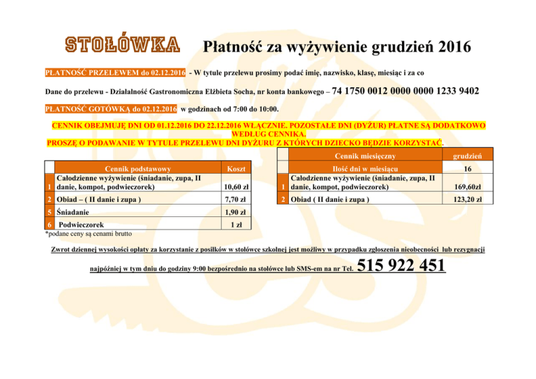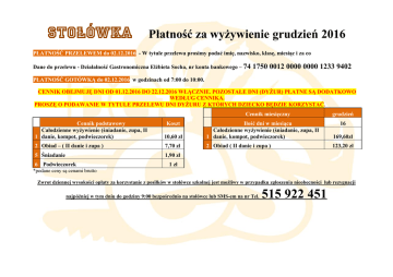 Płatność za wyżywienie grudzień 2016 PŁATNOŚĆ PRZELEWEM do 02.12.2016 - W tytule przelewu prosimy podać imię, nazwisko, klasę, miesiąc i za co Dane do przelewu - Działalność Gastronomiczna Elżbieta Socha, nr konta bankowego – 74 1750 0012 0000 0000 1233 9402 PŁATNOŚĆ GOTÓWKĄ do 02.12.2016 w godzinach od 7:00 do 10:00. CENNIK OBEJMUJĘ DNI OD 01.12.2016 DO 22.12.2016 WŁĄCZNIE. POZOSTAŁE DNI (DYŻUR) PŁATNE SĄ DODATKOWO WEDŁUG CENNIKA. PROSZĘ O PODAWANIE W TYTULE PRZELEWU DNI DYŻURU Z KTÓRYCH DZIECKO BĘDZIE KORZYSTAĆ. Cennik miesięczny grudzień 10,60 zł Ilość dni w miesiącu Całodzienne wyżywienie (śniadanie, zupa, II 1 danie, kompot, podwieczorek) 169,60zł 2 Obiad – ( II danie i zupa ) 7,70 zł 2 Obiad ( II danie i zupa ) 123,20 zł 5 Śniadanie 1,90 zł Cennik podstawowy Całodzienne wyżywienie (śniadanie, zupa, II 1 danie, kompot, podwieczorek) 6 Podwieczorek Koszt 16 1 zł *podane ceny są cenami brutto Zwrot dziennej wysokości opłaty za korzystanie z posiłków w stołówce szkolnej jest możliwy w przypadku zgłoszenia nieobecności lub rezygnacji najpóźniej w tym dniu do godziny 9:00 bezpośrednio na stołówce lub SMS-em na nr Tel. 515 922 451