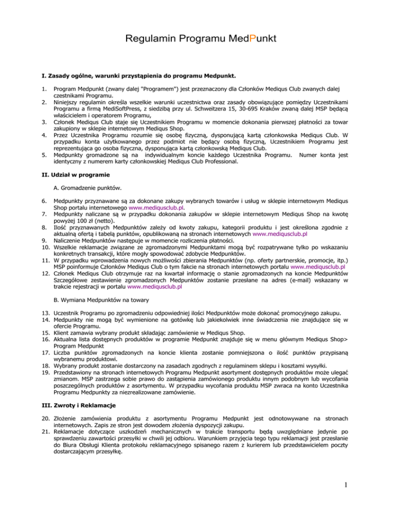 Regulamin Programu MedPunkt I. Zasady ogólne, warunki przystąpienia do programu Medpunkt. 1. 2. 3. 4. 5. Program Medpunkt (zwany dalej "Programem") jest przeznaczony dla Członków Mediqus Club zwanych dalej czestnikami Programu. Niniejszy regulamin określa wszelkie warunki uczestnictwa oraz zasady obowiązujące pomiędzy Uczestnikami Programu a firmą MediSoftPress, z siedzibą przy ul. Schweitzera 15, 30-695 Kraków zwaną dalej MSP będącą właścicielem i operatorem Programu, Członek Mediqus Club staje się Uczestnikiem Programu w momencie dokonania pierwszej płatności za towar zakupiony w sklepie internetowym Mediqus Shop. Przez Uczestnika Programu rozumie się osobę fizyczną, dysponującą kartą członkowska Mediqus Club. W przypadku konta użytkowanego przez podmiot nie będący osobą fizyczną, Uczestnikiem Programu jest reprezentująca go osoba fizyczna, dysponująca kartą członkowską Mediqus Club. Medpunkty gromadzone są na indywidualnym koncie każdego Uczestnika Programu. Numer konta jest identyczny z numerem karty członkowskiej Mediqus Club Professional. II. Udział w programie A. Gromadzenie punktów. 6. Medpunkty przyznawane są za dokonane zakupy wybranych towarów i usług w sklepie internetowym Mediqus Shop portalu internetowego www.mediqusclub.pl. 7. Medpunkty naliczane są w przypadku dokonania zakupów w sklepie internetowym Mediqus Shop na kwotę powyżej 100 zł (netto). 8. Ilość przyznawanych Medpunktów zależy od kwoty zakupu, kategorii produktu i jest określona zgodnie z aktualną ofertą i tabelą punktów, opublikowaną na stronach internetowych www.mediqusclub.pl 9. Naliczenie Medpunktów następuje w momencie rozliczenia płatności. 10. Wszelkie reklamacje związane ze zgromadzonymi Medpunktami mogą być rozpatrywane tylko po wskazaniu konkretnych transakcji, które mogły spowodować zdobycie Medpunktów. 11. W przypadku wprowadzenia nowych możliwości zbierania Medpunktów (np. oferty partnerskie, promocje, itp.) MSP poinformuje Członków Mediqus Club o tym fakcie na stronach internetowych portalu www.mediqusclub.pl 12. Członek Mediqus Club otrzymuje raz na kwartał informację o stanie zgromadzonych na koncie Medpunktów Szczegółowe zestawienie zgromadzonych Medpunktów zostanie przesłane na adres (e-mail) wskazany w trakcie rejestracji w portalu www.mediqusclub.pl B. Wymiana Medpunktów na towary 13. Uczestnik Programu po zgromadzeniu odpowiedniej ilości Medpunktów może dokonać promocyjnego zakupu. 14. Medpunkty nie mogą być wymienione na gotówkę lub jakiekolwiek inne świadczenia nie znajdujące się w ofercie Programu. 15. Klient zamawia wybrany produkt składając zamówienie w Mediqus Shop. 16. Aktualna lista dostępnych produktów w programie Medpunkt znajduje się w menu głównym Mediqus Shop> Program Medpunkt 17. Liczba punktów zgromadzonych na koncie klienta zostanie pomniejszona o ilość punktów przypisaną wybranemu produktowi. 18. Wybrany produkt zostanie dostarczony na zasadach zgodnych z regulaminem sklepu i kosztami wysyłki. 19. Przedstawiony na stronach internetowych Programu Medpunkt asortyment dostępnych produktów może ulegać zmianom. MSP zastrzega sobie prawo do zastąpienia zamówionego produktu innym podobnym lub wycofania poszczególnych produktów z asortymentu. W przypadku wycofania produktu MSP zwraca na konto Uczestnika Programu Medpunkty za niezrealizowane zamówienie. III. Zwroty i Reklamacje 20. Złożenie zamówienia produktu z asortymentu Programu Medpunkt jest odnotowywane na stronach internetowych. Zapis ze stron jest dowodem złożenia dyspozycji zakupu. 21. Reklamacje dotyczące uszkodzeń mechanicznych w trakcie transportu będą uwzględniane jedynie po sprawdzeniu zawartości przesyłki w chwili jej odbioru. Warunkiem przyjęcia tego typu reklamacji jest przesłanie do Biura Obsługi Klienta protokołu reklamacyjnego spisanego razem z kurierem lub przedstawicielem poczty dostarczającym przesyłkę. 1 22. Prawo zwrotu zamówionego produktu przysługuje Uczestnikowi tylko w przypadku jego uszkodzenia w transporcie lub niezgodności z zamówieniem. W celu złożenia reklamacji Uczestnik musi w ciągu 7 dni od daty otrzymania przesyłki skontaktować się z Mediqus Club. Nie podlegają zwrotowi produkty noszące ślad użycia. 23. Produkty posiadające kartę gwarancyjną producenta powinny być reklamowane w punktach serwisowych danego producenta podanych w karcie gwarancyjnej. 24. Jakiekolwiek reklamacje związane z realizacją zamówienia MSP przyjmuje za pośrednictwem Mediqus Club, wyłącznie do 14 dni roboczych od daty złożenia zamówienia, chyba że termin realizacji zamówienia został przedłużony. IV. Informacja o Programie Medpunkt 25. Wszelkie informacje związane z funkcjonowaniem Programu, (w tym o liczbie zgromadzonych na koncie Medpunktów) jego Uczestnicy mogą uzyskać telefonicznie lub drogą korespondencji od Mediqus Club. Pracownicy Mediqus Club zajmują się zapytaniami i reklamacjami odnośnie wszelkich operacji dokonywanych w ramach Programu. 26. Jeżeli pracownik Mediqus Club uzna za konieczne ustalanie tożsamości osoby dla prośby zgłoszonej telefonicznie, może prosić o udzielenie odpowiedzi na pytania umożliwiające identyfikacje Uczestnika. W przypadku braku możliwości ustalenia tożsamości Uczestnika, pracownik Mediqus Club może uznać za konieczne potwierdzenie prośby ustnej w formie pisemnej. W takim przypadku informacje ustne tracą ważność. 27. Prośby może składać wyłącznie Uczestnik Programu. V. Asortyment Programu Medpunkt 28. Zdjęcia, dane techniczne, parametry użyte do opisu produktu z asortymentu Programu Medpunkt mają wyłącznie charakter informacyjny. 29. Produkty figurujące w asortymencie Programu są do dyspozycji, na miarę posiadanych zasobów. MSP zastrzega sobie prawo do zastąpienia zamówionego produktu innym podobnym, jak również wycofania produktu z asortymentu. MSP za pośrednictwem Mediqus Clu