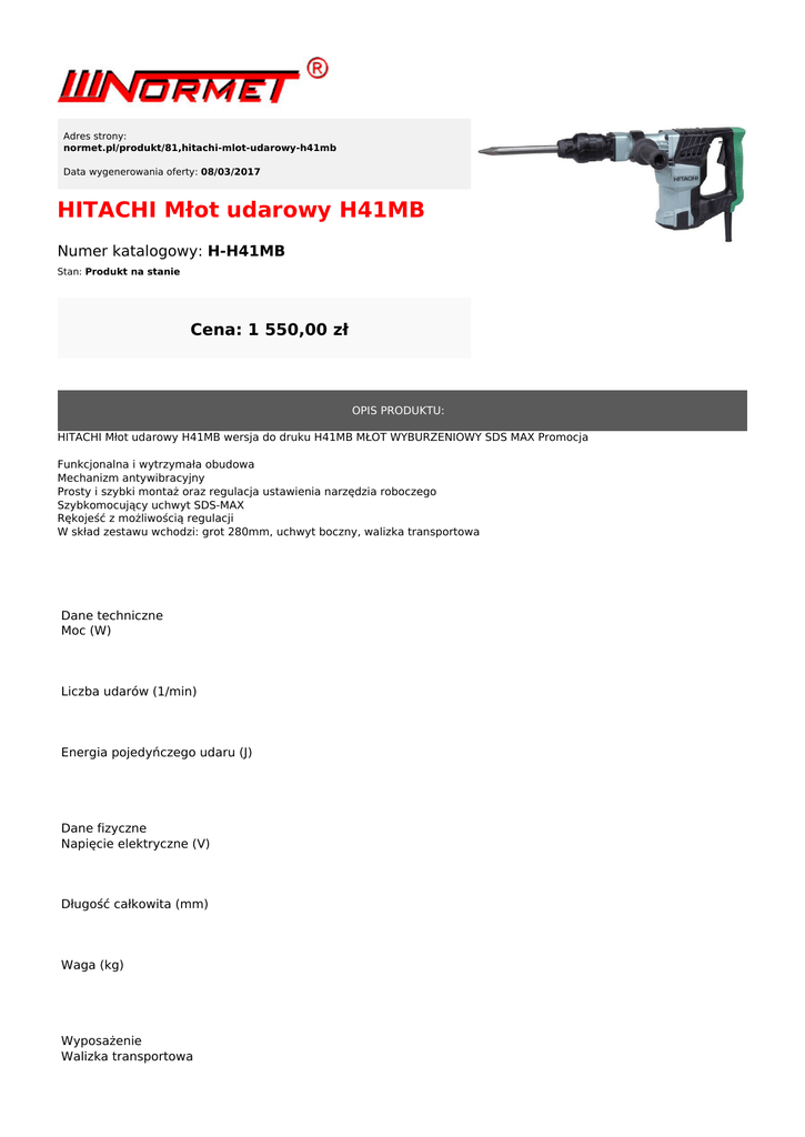 Adres strony: normet.pl/produkt/81,hitachi-mlot-udarowy-h41mb Data wygenerowania oferty: 08/03/2017 HITACHI Młot udarowy H41MB Numer katalogowy: H-H41MB Stan: Produkt na stanie Cena: 1 550,00 zł OPIS PRODUKTU: HITACHI Młot udarowy H41MB wersja do druku H41MB MŁOT WYBURZENIOWY SDS MAX Promocja Funkcjonalna i wytrzymała obudowa Mechanizm antywibracyjny Prosty i szybki montaż oraz regulacja ustawienia narzędzia roboczego Szybkomocujący uchwyt SDS-MAX Rękojeść z możliwością regulacji W skład zestawu wchodzi: grot 280mm, uchwyt boczny, walizka transportowa Dane techniczne Moc (W) Liczba udarów (1/min) Energia pojedyńczego udaru (J) Dane fizyczne Napięcie elektryczne (V) Długość całkowita (mm) Waga (kg) Wyposażenie Walizka transportowa Rękojeść boczna Pliki do pobrania Schemat techniczny H41MB (187.53 KB) Instrukcje obsługi H41MB (964.76 KB) Normet ul. św. Rocha 104, 42-202 Częstochowa NIP: 573-235-54-61 telefon: 34 319 44 45 e-mail: [email protected] Powered by TCPDF (www.tcpdf.org)