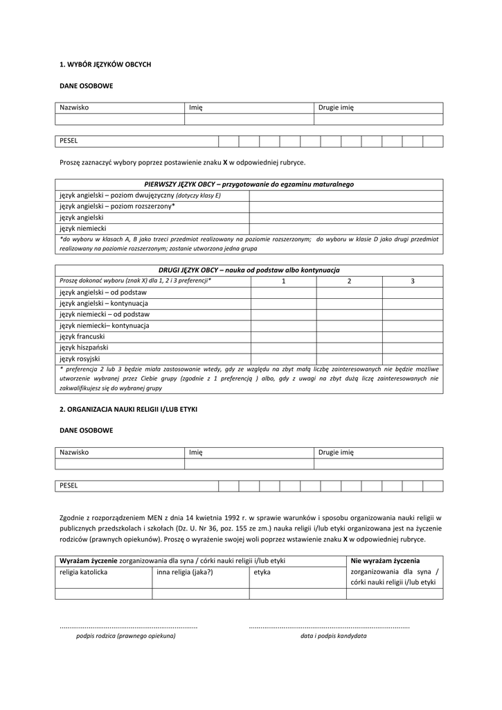1. WYBÓR JĘZYKÓW OBCYCH DANE OSOBOWE Nazwisko Imię Drugie imię PESEL Proszę zaznaczyć wybory poprzez postawienie znaku X w odpowiedniej rubryce. PIERWSZY JĘZYK OBCY – przygotowanie do egzaminu maturalnego język angielski – poziom dwujęzyczny (dotyczy klasy E) język angielski – poziom rozszerzony* język angielski język niemiecki *do wyboru w klasach A, B jako trzeci przedmiot realizowany na poziomie rozszerzonym; do wyboru w klasie D jako drugi przedmiot realizowany na poziomie rozszerzonym; zostanie utworzona jedna grupa DRUGI JĘZYK OBCY – nauka od podstaw albo kontynuacja 1 Proszę dokonać wyboru (znak X) dla 1, 2 i 3 preferencji* 2 3 język angielski – od podstaw język angielski – kontynuacja język niemiecki – od podstaw język niemiecki– kontynuacja język francuski język hiszpański język rosyjski * preferencja 2 lub 3 będzie miała zastosowanie wtedy, gdy ze względu na zbyt małą liczbę zainteresowanych nie będzie możliwe utworzenie wybranej przez Ciebie grupy (zgodnie z 1 preferencją ) albo, gdy z uwagi na zbyt dużą liczę zainteresowanych nie zakwalifikujesz się do wybranej grupy 2. ORGANIZACJA NAUKI RELIGII I/LUB ETYKI DANE OSOBOWE Nazwisko Imię Drugie imię PESEL Zgodnie z rozporządzeniem MEN z dnia 14 kwietnia 1992 r. w sprawie warunków i sposobu organizowania nauki religii w publicznych przedszkolach i szkołach (Dz. U. Nr 36, poz. 155 ze zm.) nauka religii i/lub etyki organizowana jest na życzenie rodziców (prawnych opiekunów). Proszę o wyrażenie swojej woli poprzez wstawienie znaku X w odpowiedniej rubryce. Wyrażam życzenie zorganizowania dla syna / córki nauki religii i/lub etyki religia katolicka inna religia (jaka?) etyka ........................................................................ podpis rodzica (prawnego opiekuna) Nie wyrażam życzenia zorganizowania dla syna / córki nauki religii i/lub etyki .................................................................................... data i podpis kandydata